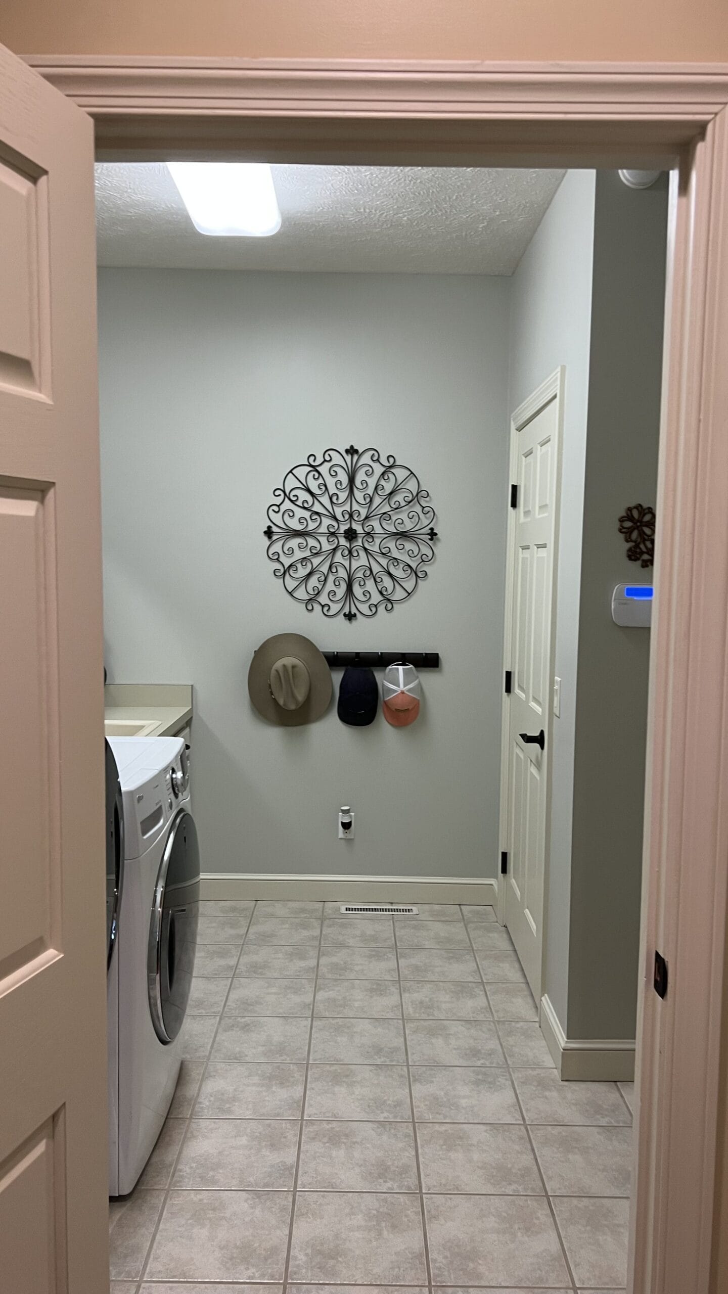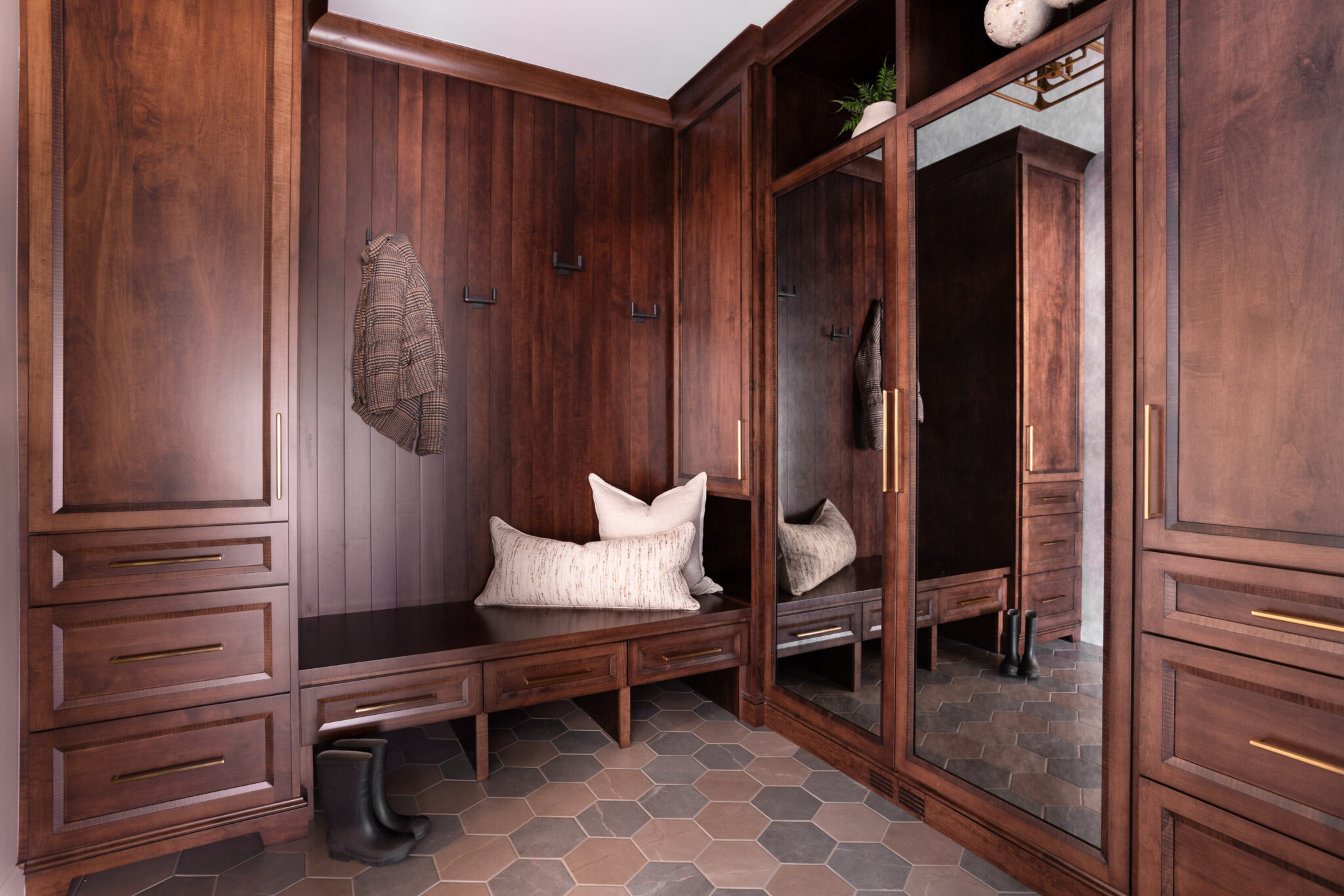 Holly and Audria relocated their client’s laundry room and transformed the design of this space into a gorgeous functional and organized mudroom for the family. They chose a rich maple wood and stain color for the cabinetry and prioritized clean lines and extra long hardware for a contemporary look. The reflection of the mirrors not only adds function and openness to the room, but the antique effect creates depth within the space. Audria and Holly selected a unique flooring that tied into the design and added a layer of interest and fun without distracting from the show stopping maple cabinetry.