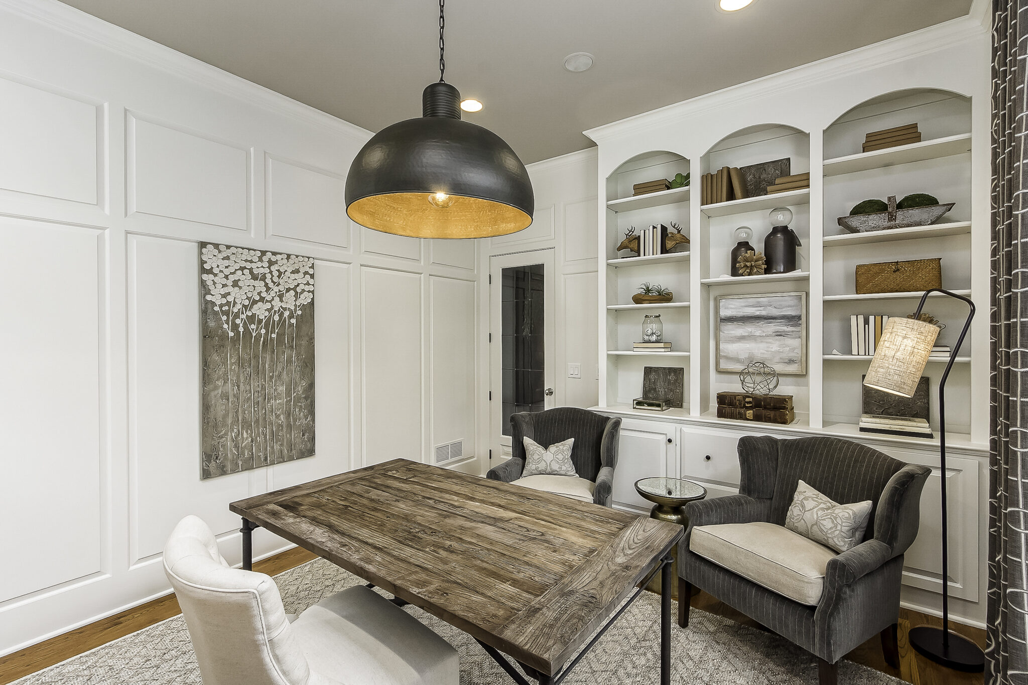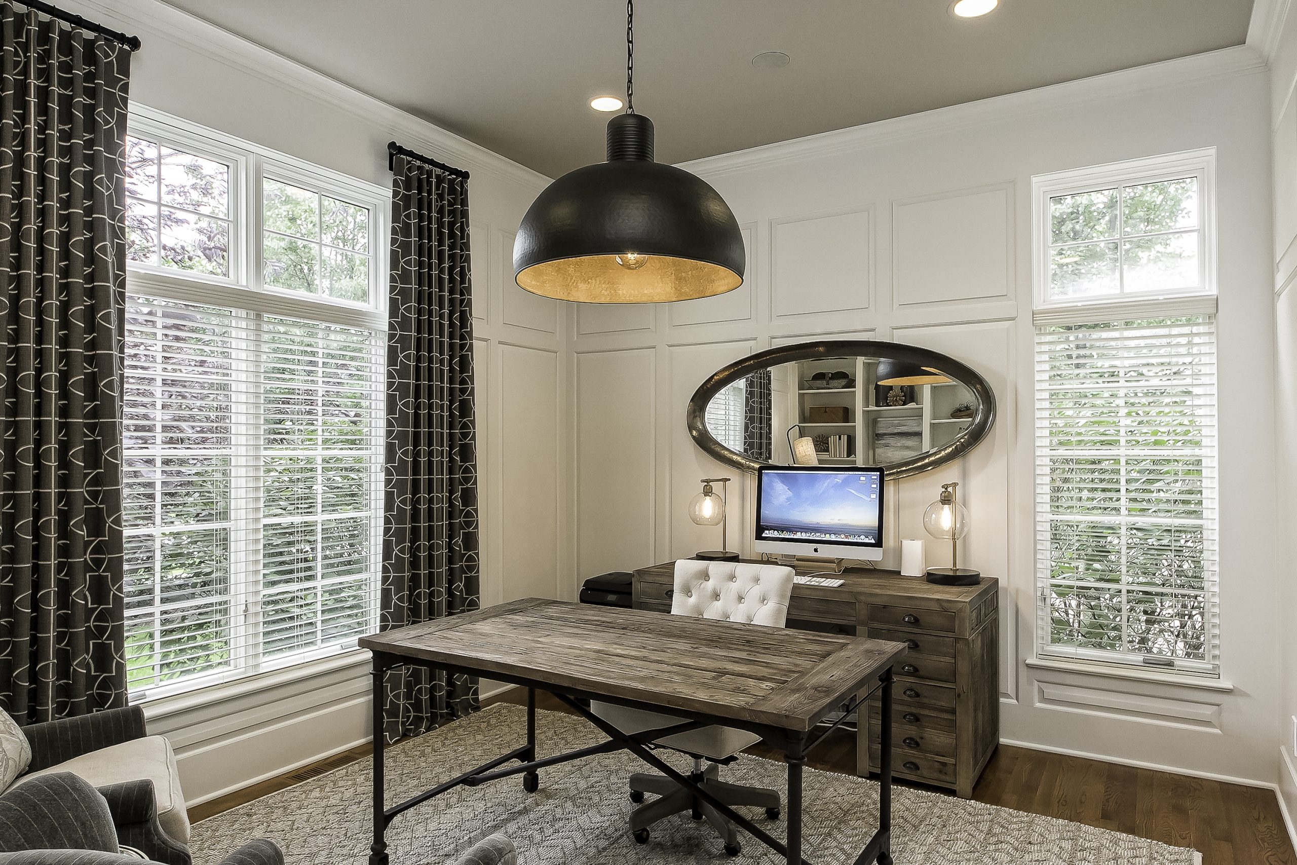 The client wanted to transform the outdated space into a new, modern workspace. With clean lines in mind, we refreshed the paint, fully furnished the room, and added updated lighting, a new rug, and accessories. The wall art and window treatments were the finishing touches that made the room feel new again.