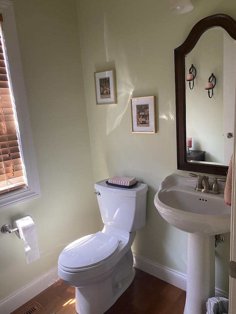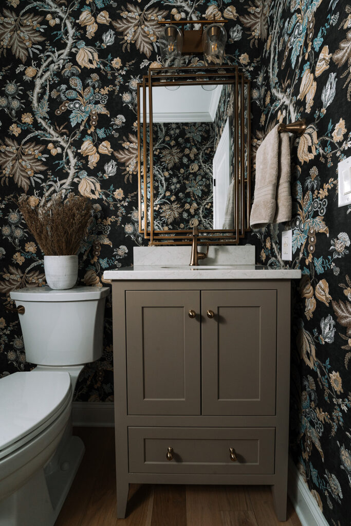 Fresh paint, new lighting, custom window treatments, and refinished hardwood floors/steps were done throughout the whole first floor. Erica featured a bold patterned wallpaper and new vanity in a warm taupe color to polish off this gorgeous powder room.