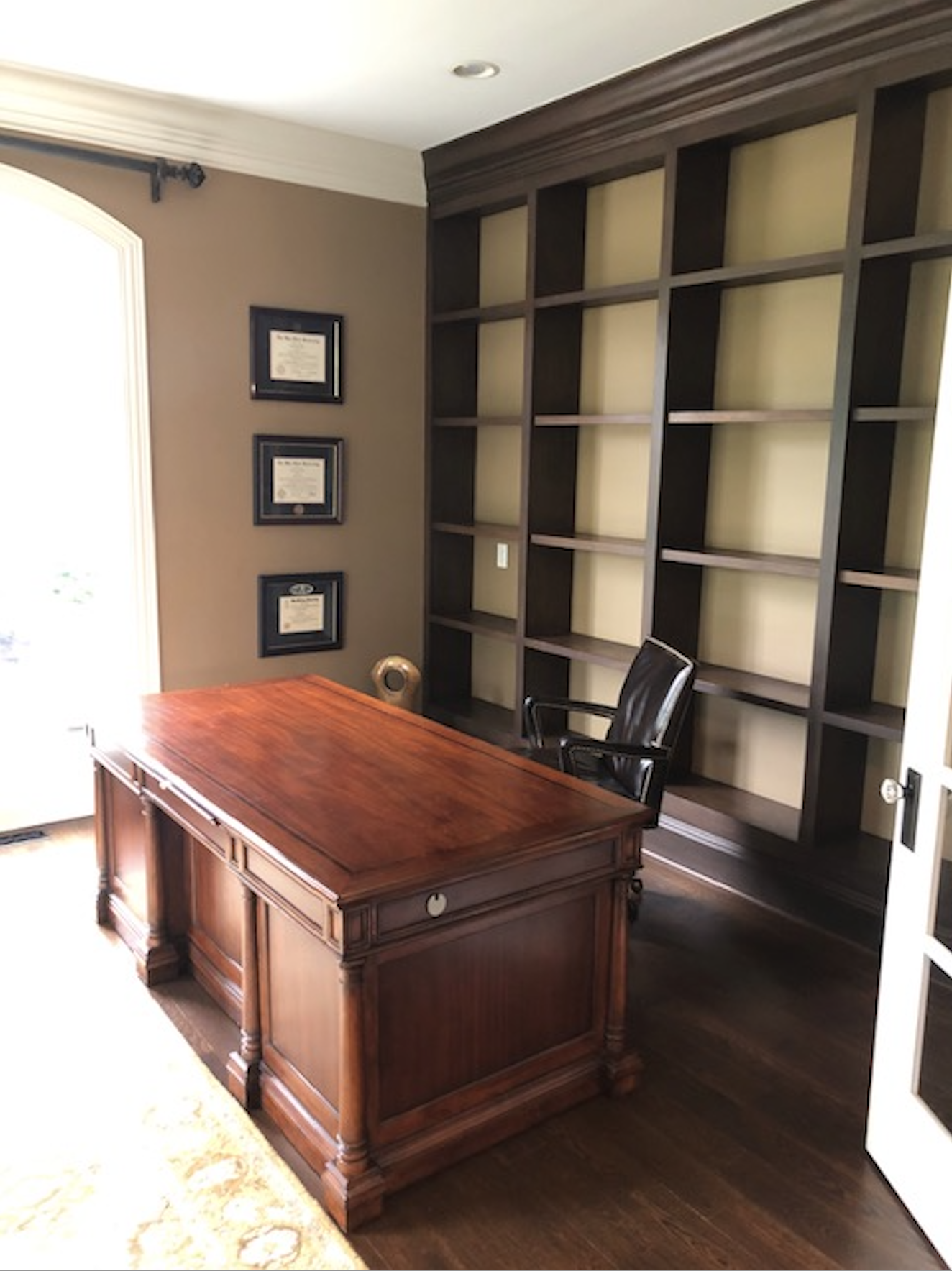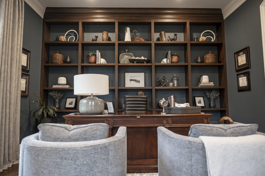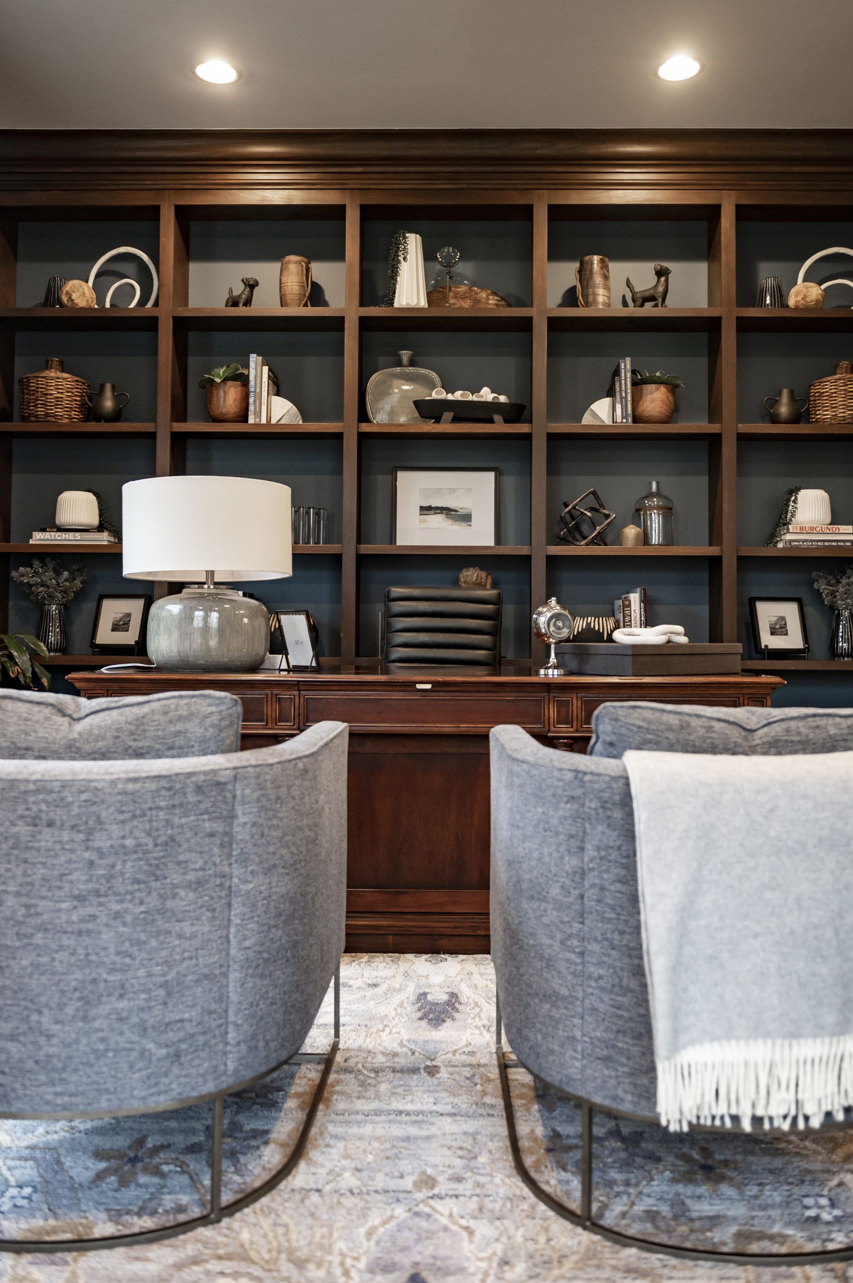 | Michelle created the biggest change in this room through painting the walls and back of the built-ins in a deep moody blue-green. She used the client’s existing desk but added new accent chairs and a desk chair to the space. The room was completed with accessories for the built-ins, window treatments and a statement rug.