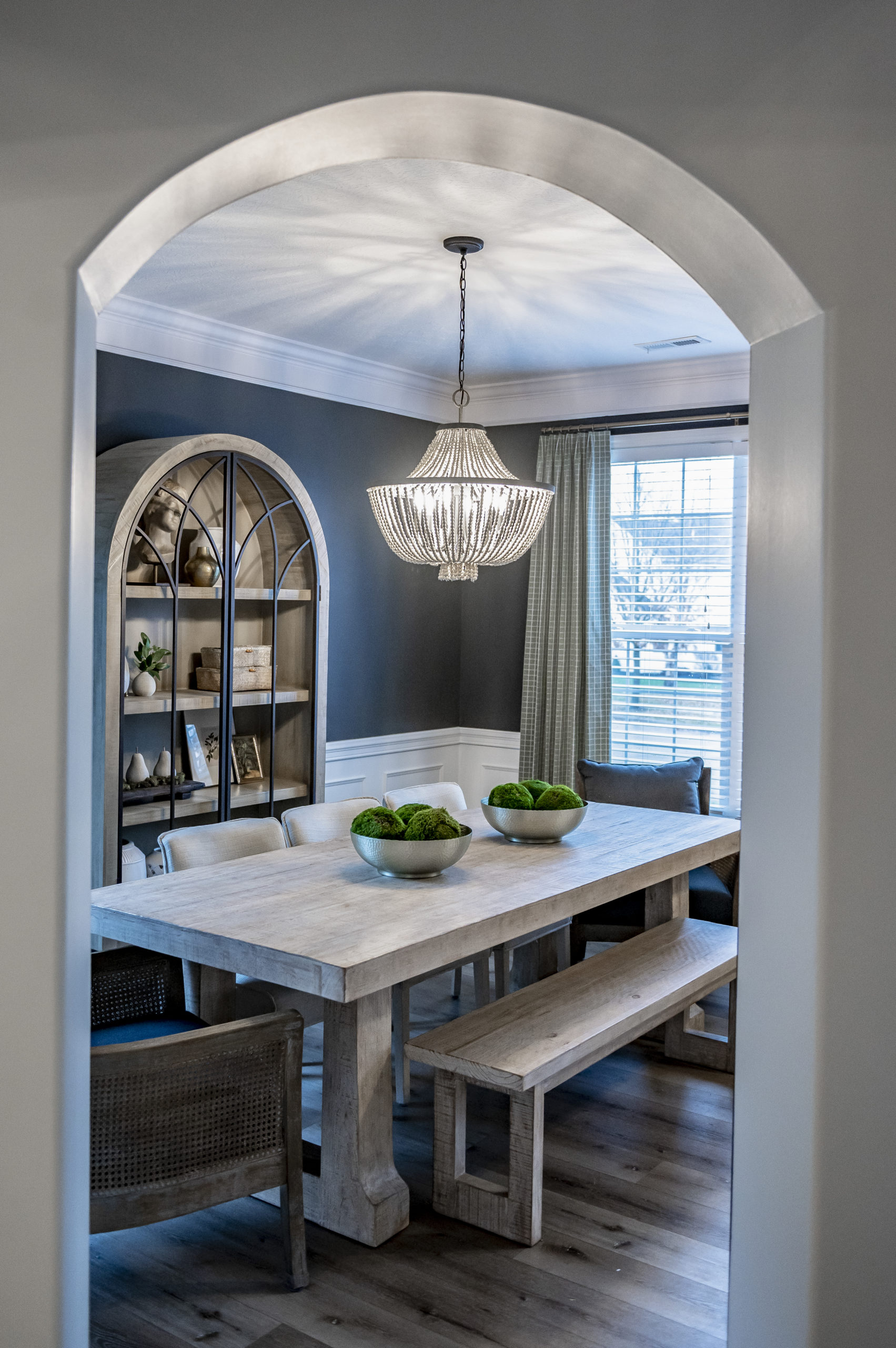 A sophisticated, moody dining room started with a dark paint color and statement lighting. Natural wood furniture coordinates with the floors and pops of green makes this room complete.