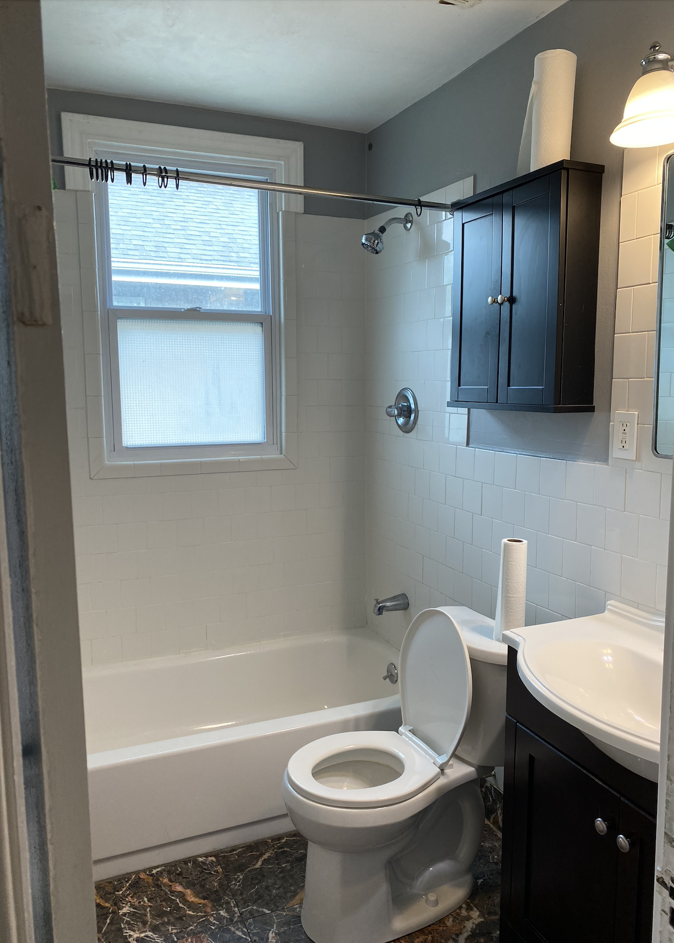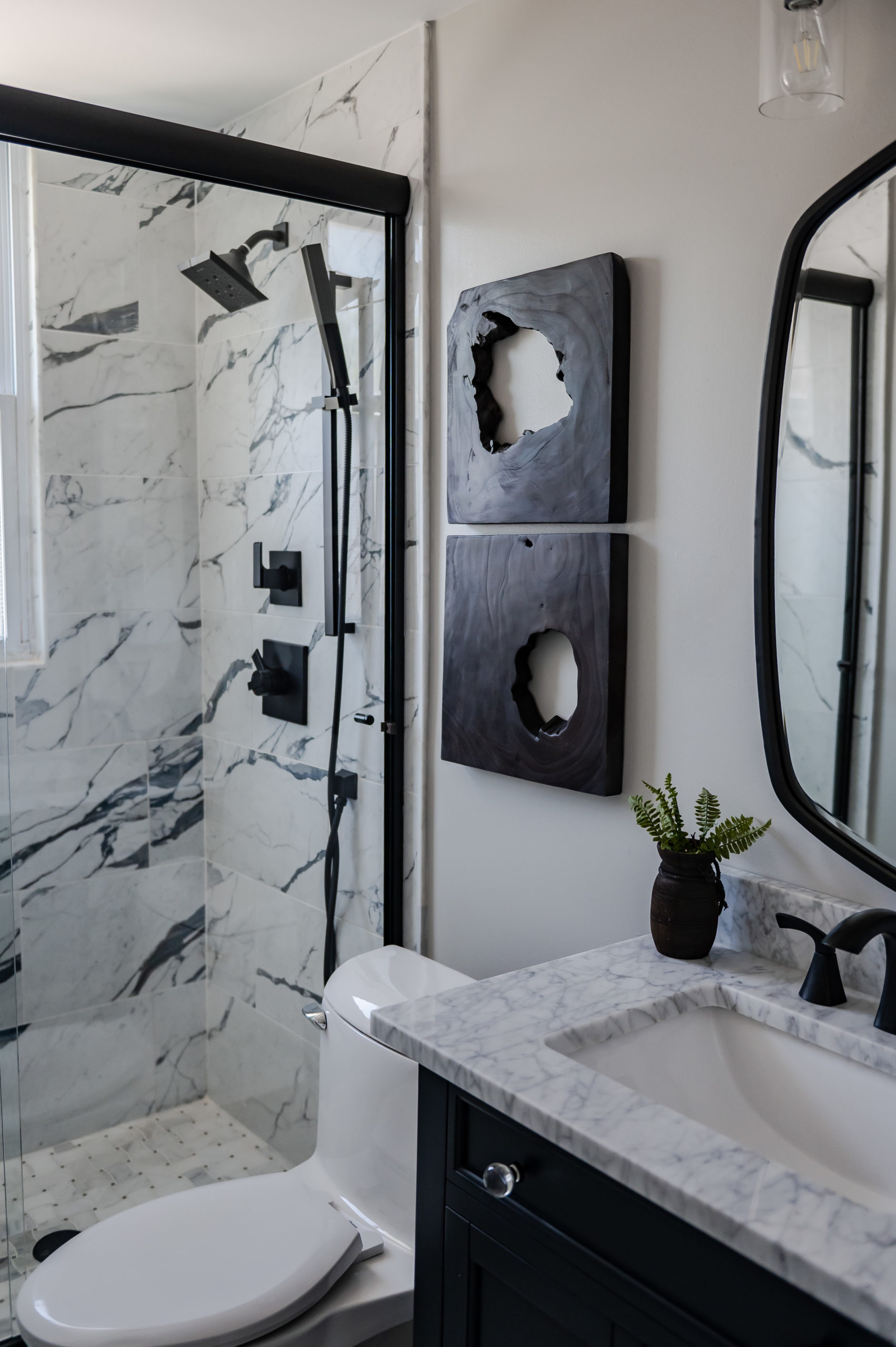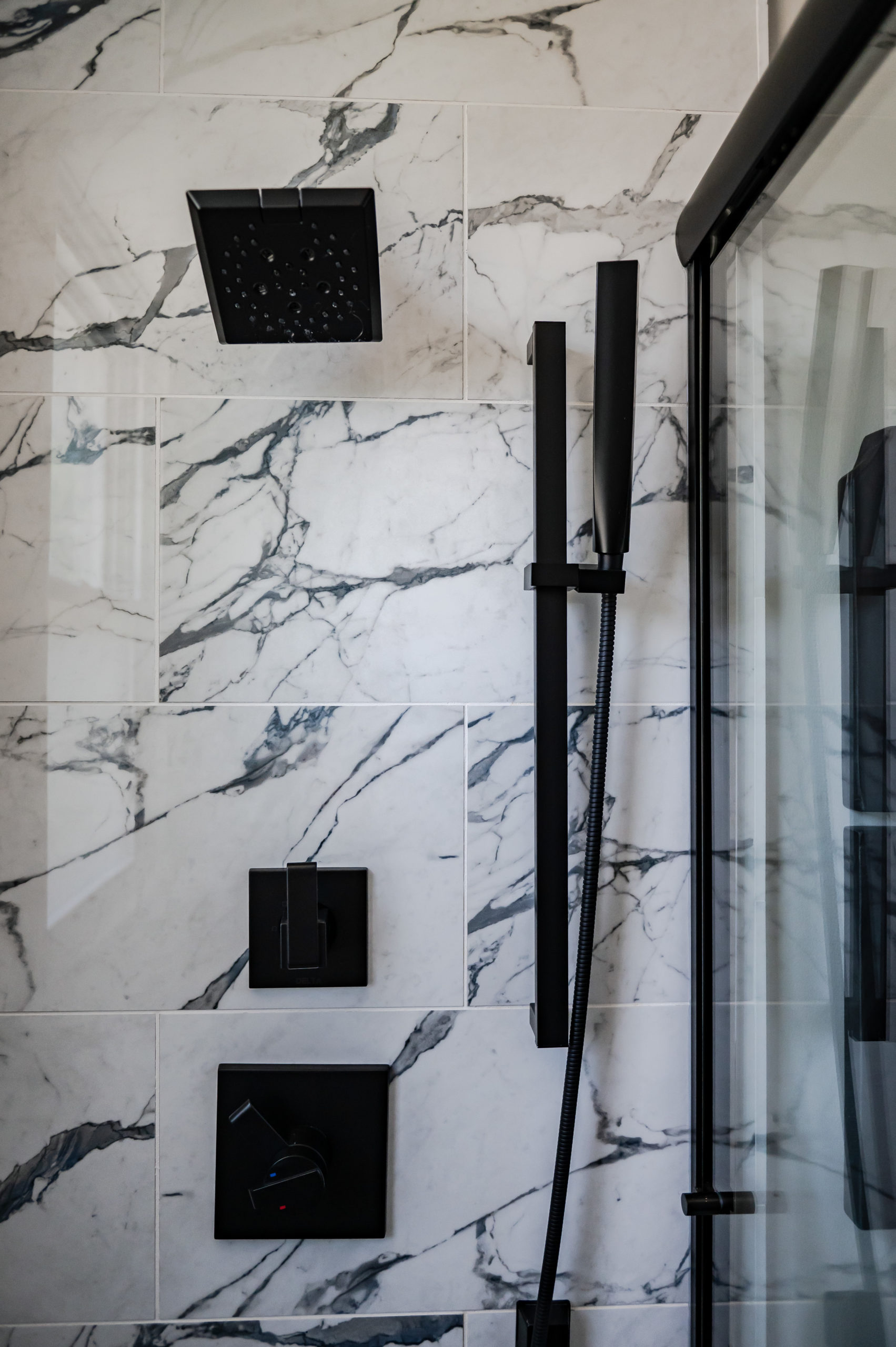 The crazy tile in this bathroom was screaming for a makeover! A sliding glass door showcases the new tile and makes the room feel larger. Erica carried the navy accent in here with the vanity cabinet. Captured by