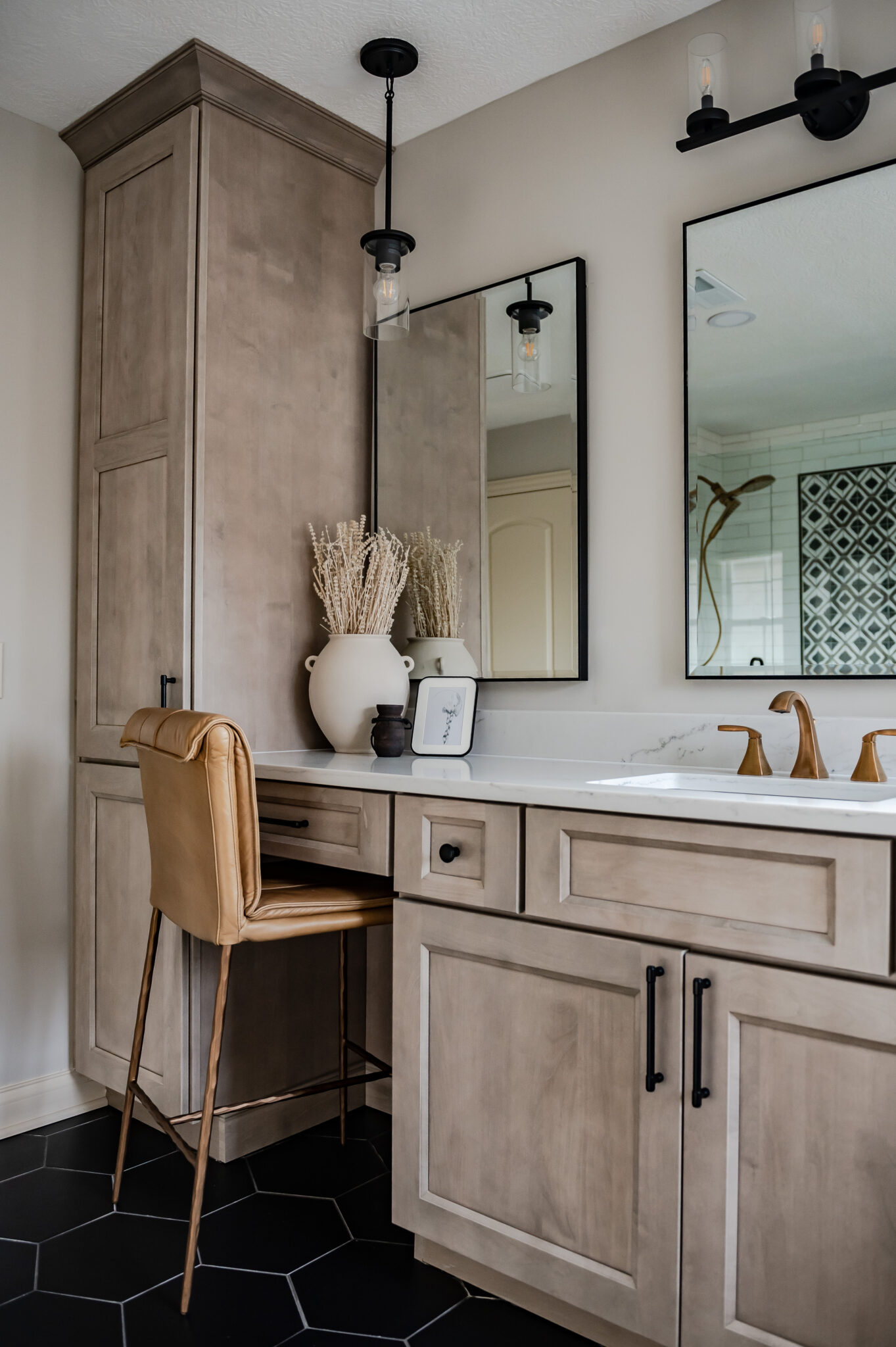 This primary bath got a major upgrade with a reconfigured shower, sleek wood vanities with extra storage, and unique tile!