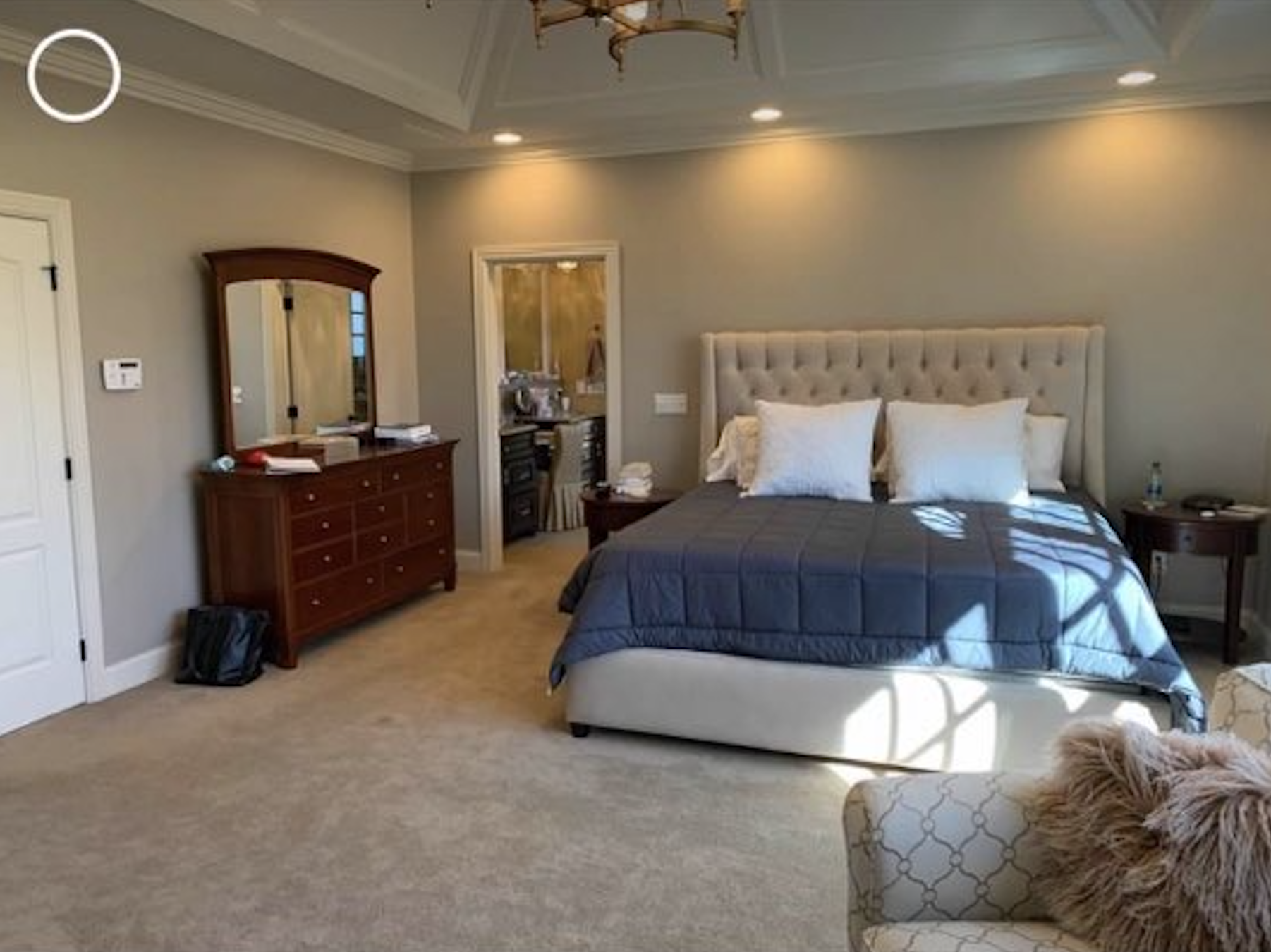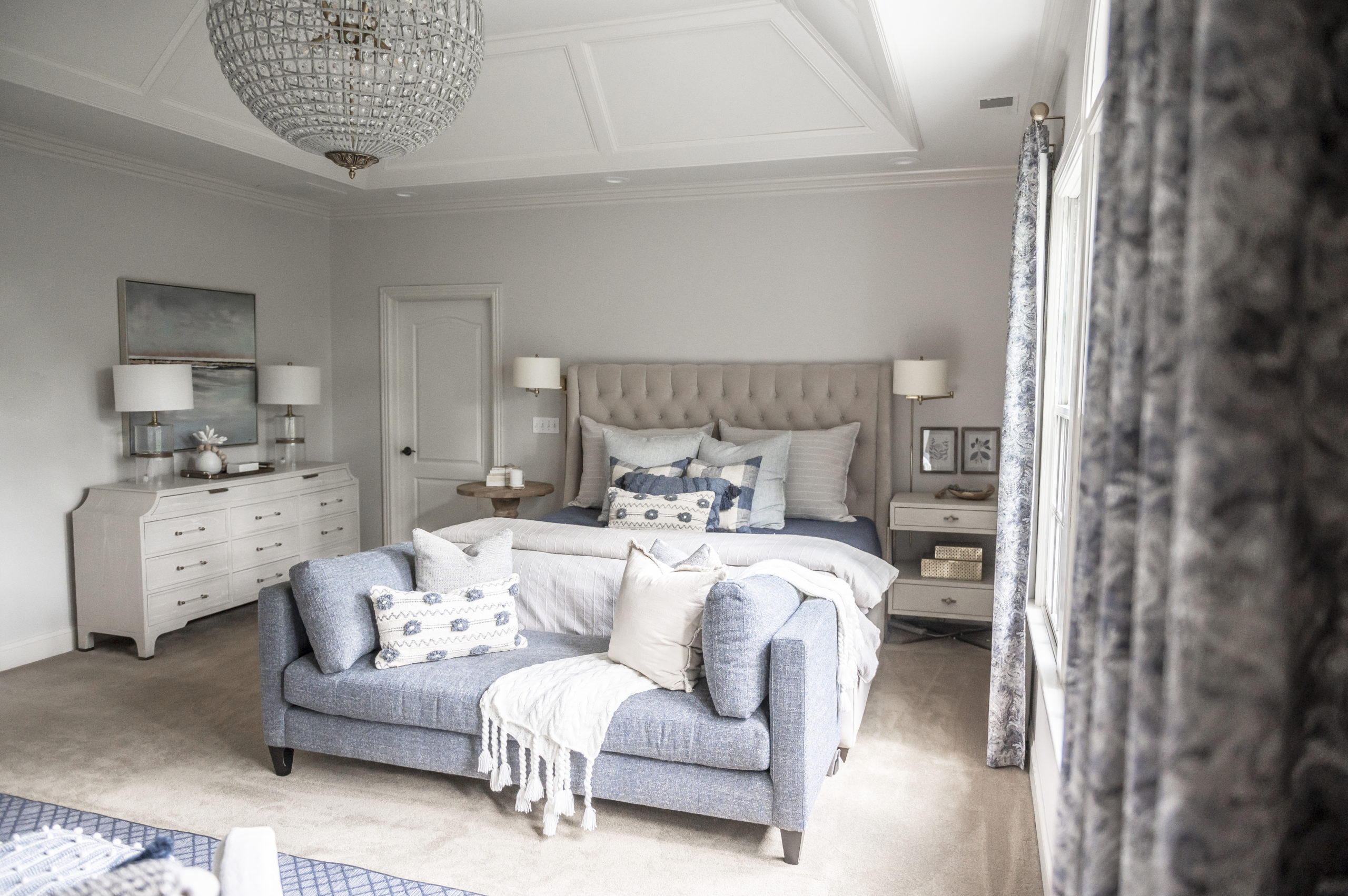 This Primary Bedroom retreat is complete with its very own built in beverage center and fireside sitting making this room a hard one to leave! The cozy end of the bed sofa doubles as a perfect spot for our homeowners beloved fur babies to rest. The tufted bed is layered with lots of soft linens and pops of her favorite color, navy, and is centered under this show-stopping chandelier. Wouldn’t mind waking up here!
