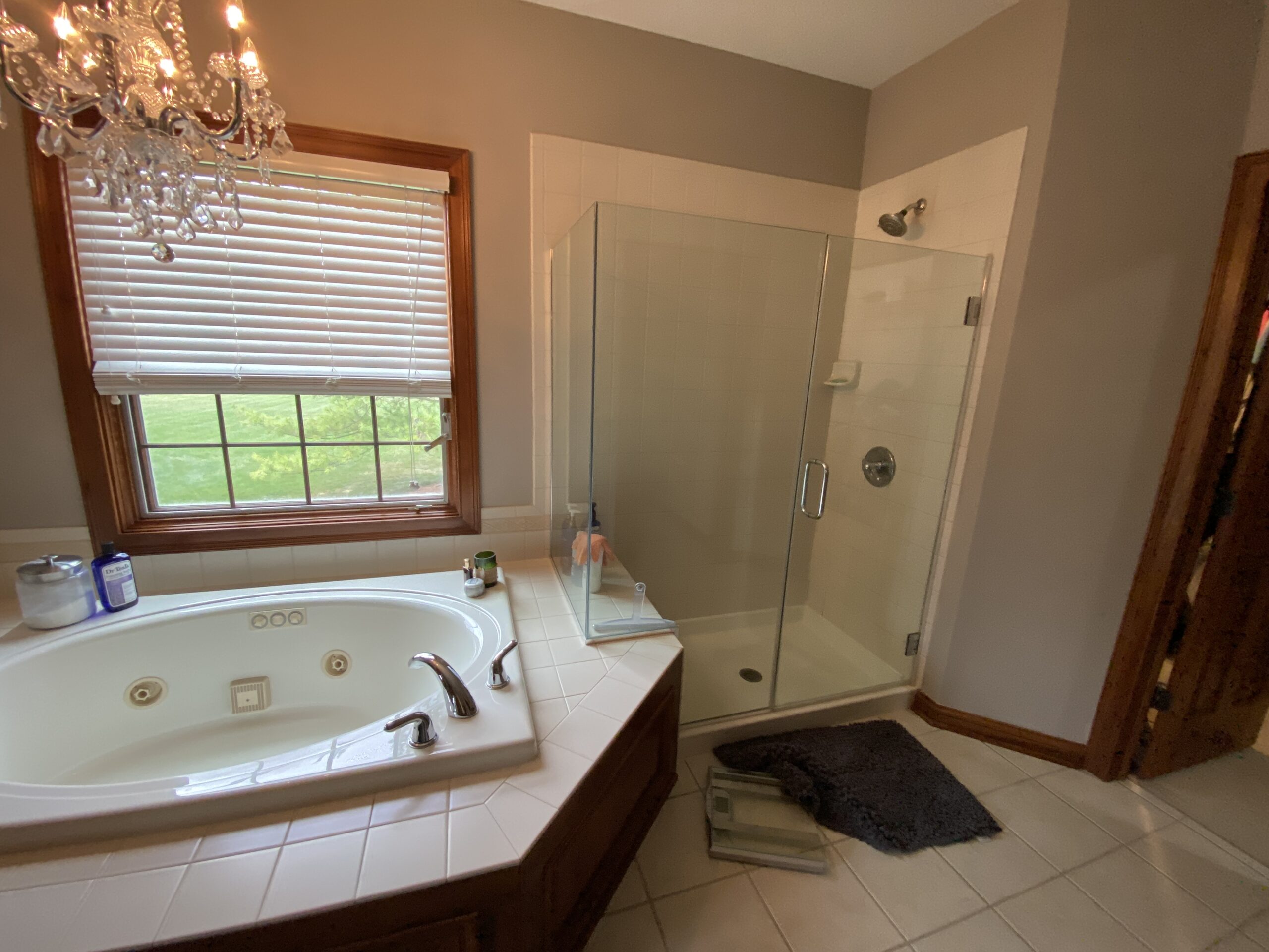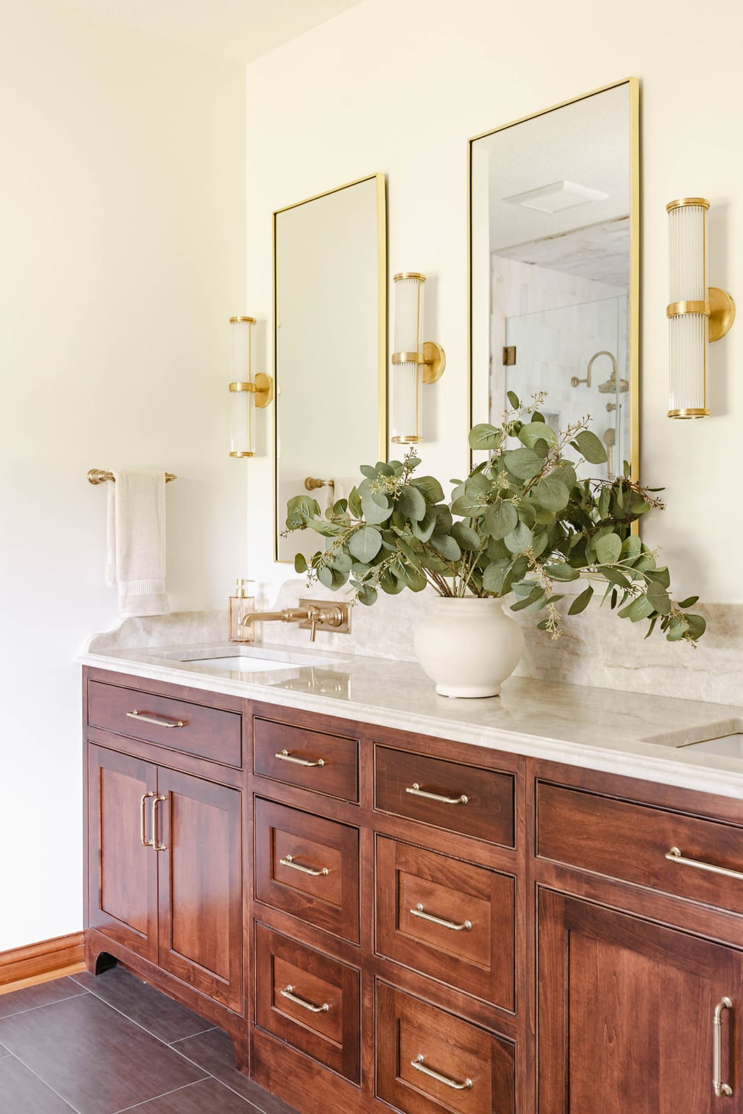 Step into a sanctuary of refined luxury where timeless materials and modern elegance converge. Beautiful veined marble wraps the shower walls and tub surround, creating a serene yet sophisticated foundation. Warm wood stains and luxe brass hardware are peppered throughout the space.