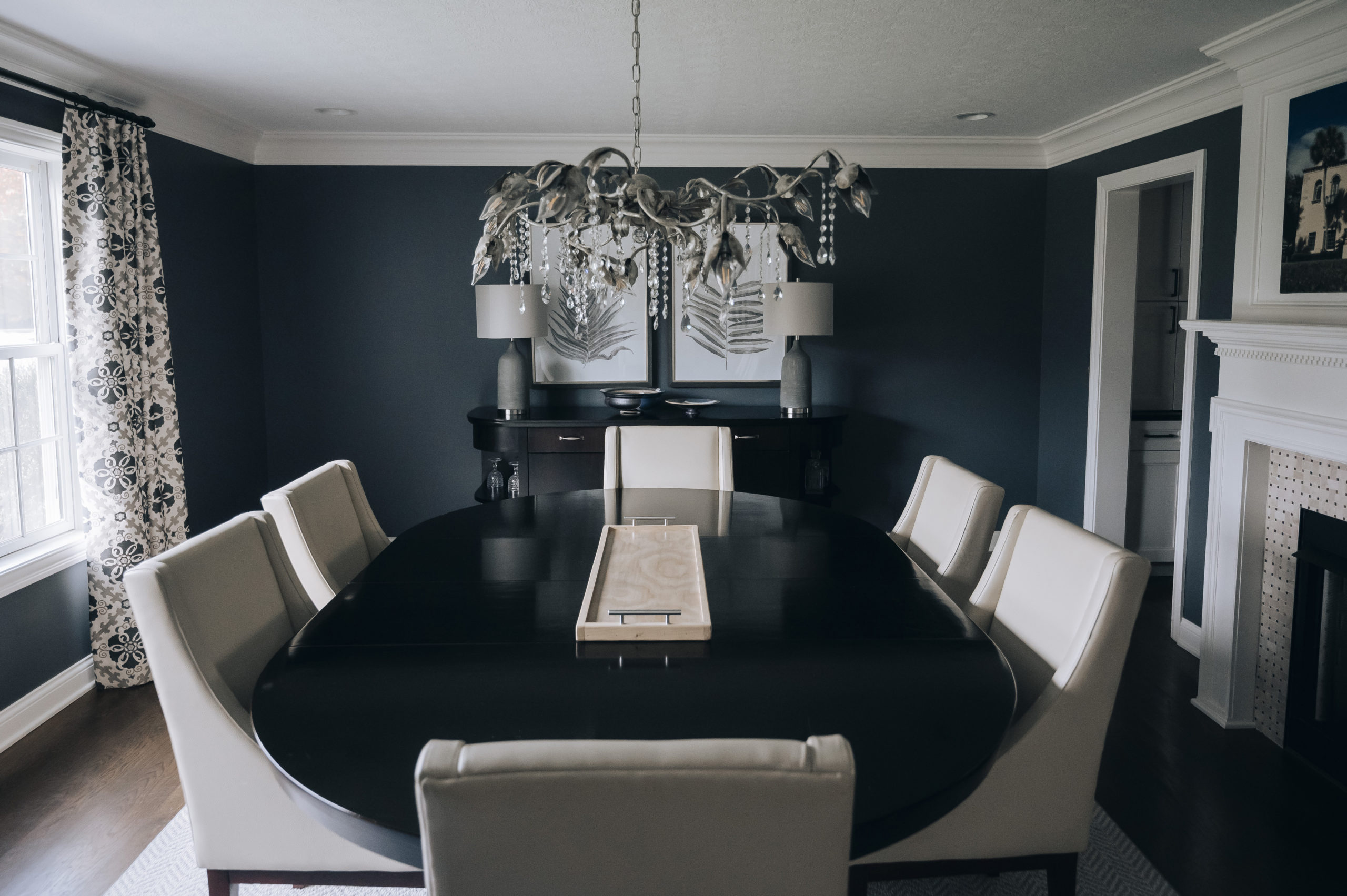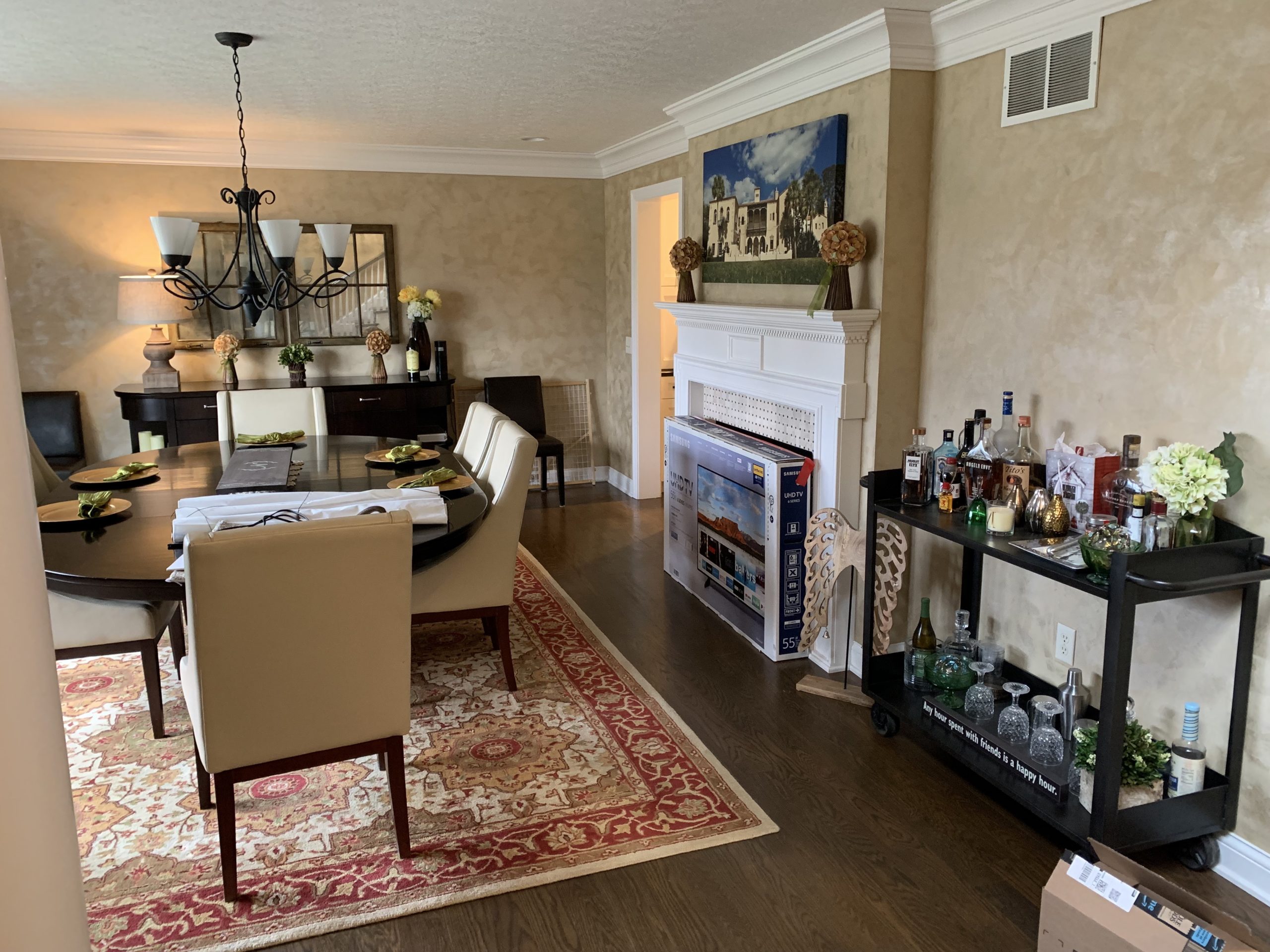 Refresh time! Deneen added new paint and repurposed the window treatments from the window that was torn out for the sunroom. She added a beautiful large crystal chandelier and new molding over the fireplace. To pull the room together, Deneen helped the client pick out a new rug and décor to match.