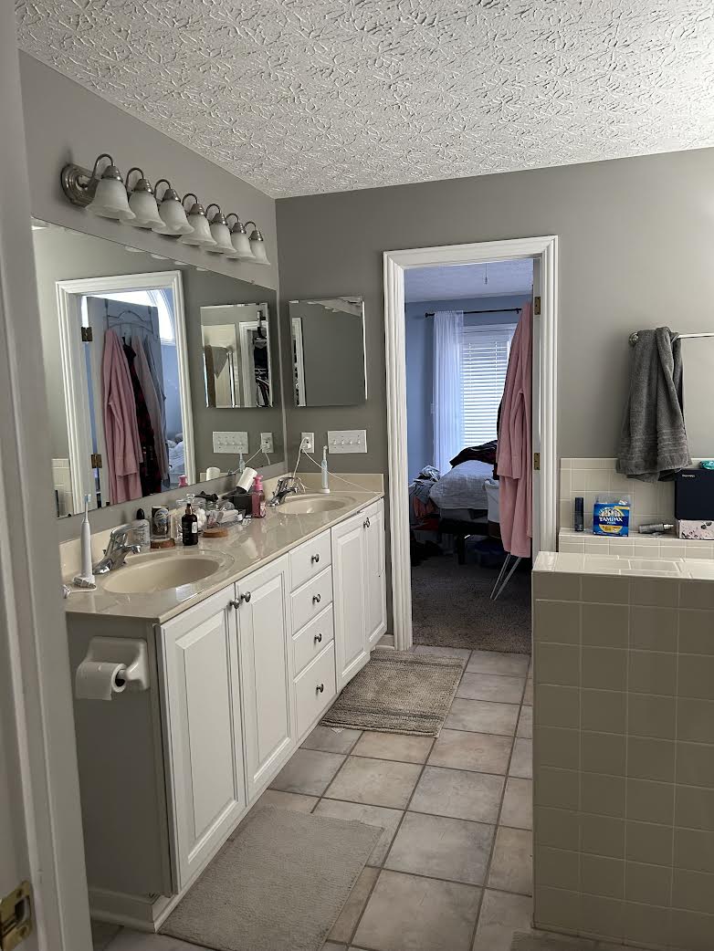 Erica reworked this primary bath layout to make the space more functional for her client. They didn’t use the tub so that made room to do a large shower with a storage cabinet. The client wanted it to have a very relaxing feel so Erica opted for light, natural materials with a rust accent color.