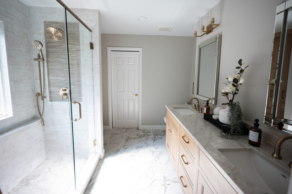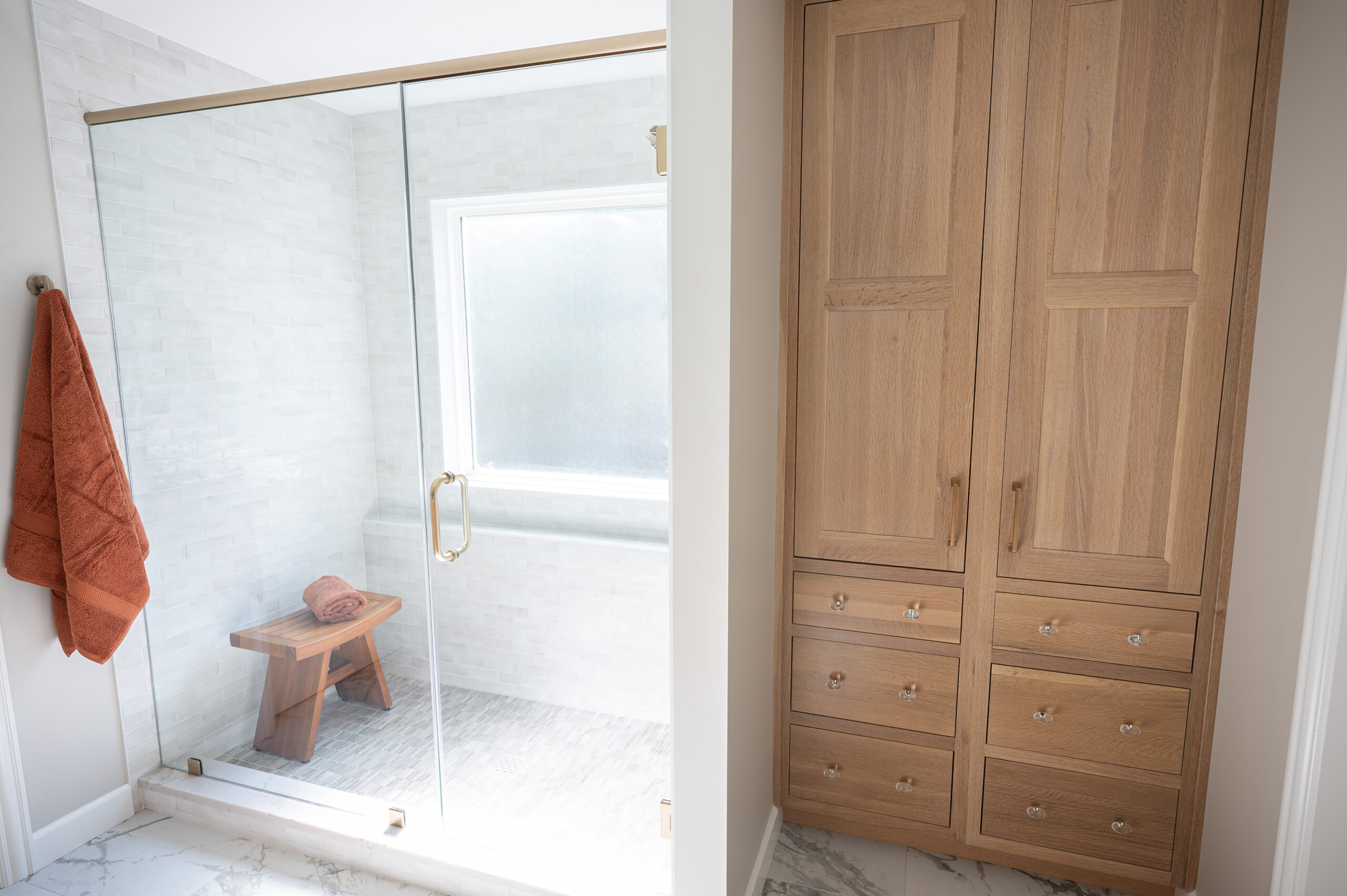 Erica reworked this primary bath layout to make the space more functional for her client. They didn’t use the tub so that made room to do a large shower with a storage cabinet. The client wanted it to have a very relaxing feel so Erica opted for light, natural materials with a rust accent color.Captured by Tammy Dean Media.