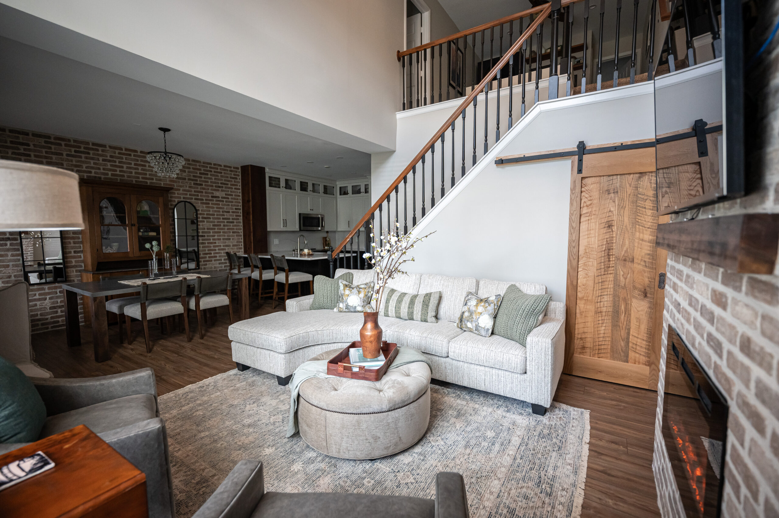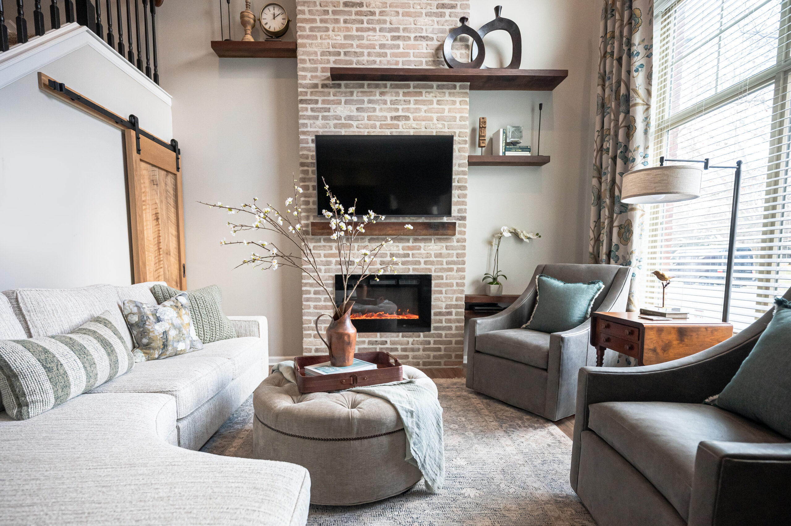 Our client wanted their family room to be a space where they could entertain more people comfortably. We redesigned the furniture floorplan and transformed the doorway to a barn door in order to accommodate as many seats as possible. We added the brick fireplace wall with a unique shelving design to create a special place for her client’s treasured pieces. To finish off the space, the spindles were painted on the staircase and stained the handrail to match the other organic elements of the room.