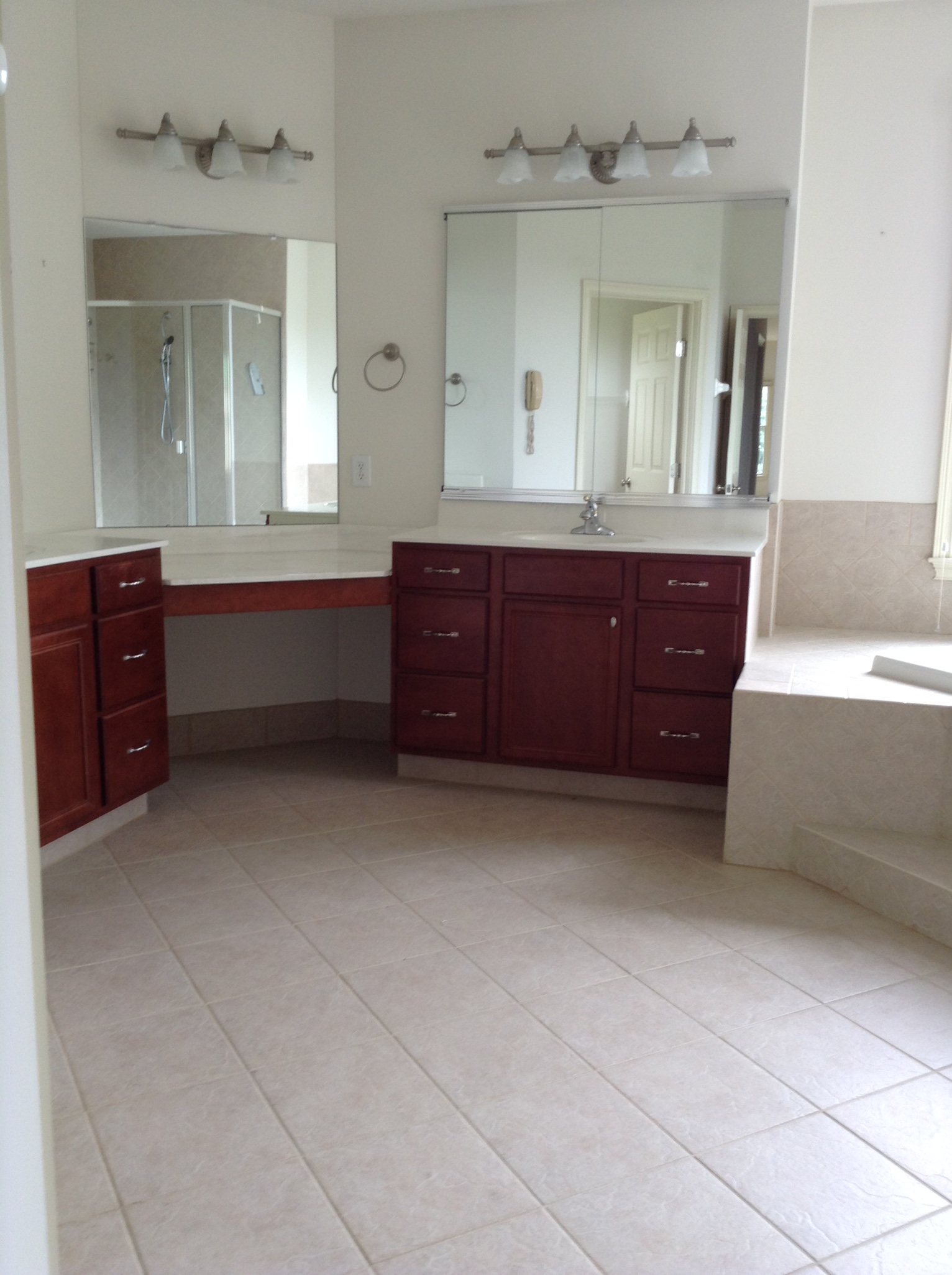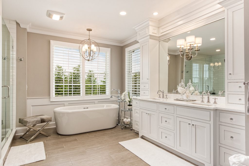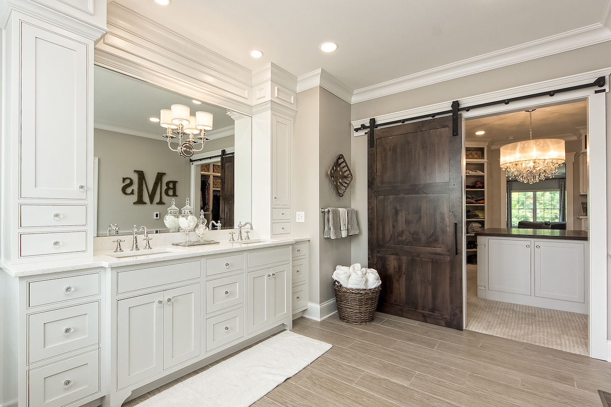 The client purchased the home knowing they would renovate the primary bathroom suite. Inspired by a refined, rustic-traditional aesthetic, we wanted to create a spa-like escape that still flowed with the classic style represented in the rest of the home. We reconfigured the whole bathroom layout to make more sense. We added custom sconces, custom cabinetry, and a beveled mirror that made the space unrecognizable. The tilework, free-standing tub, and new barn doors were defining finishes that really stood out to the client.