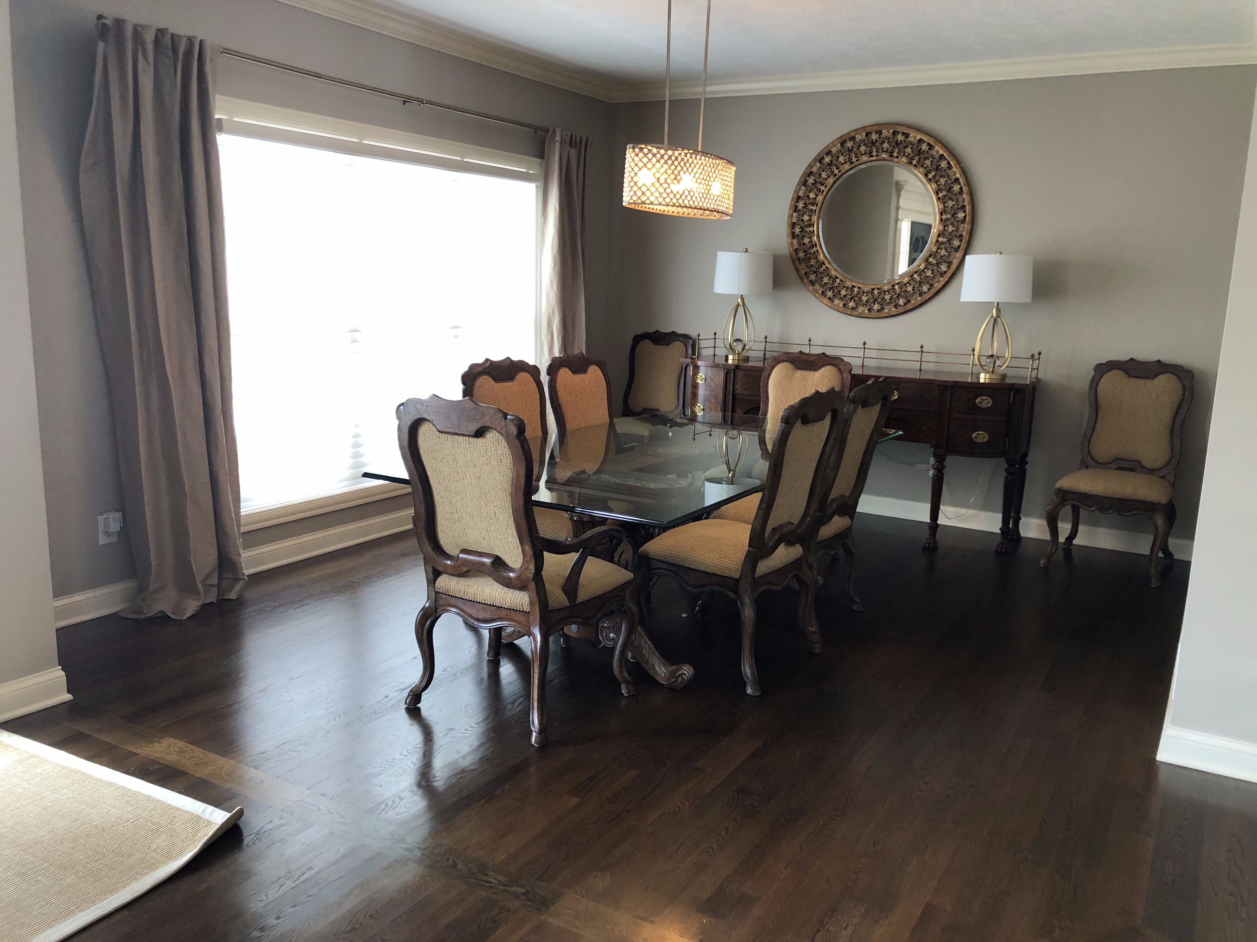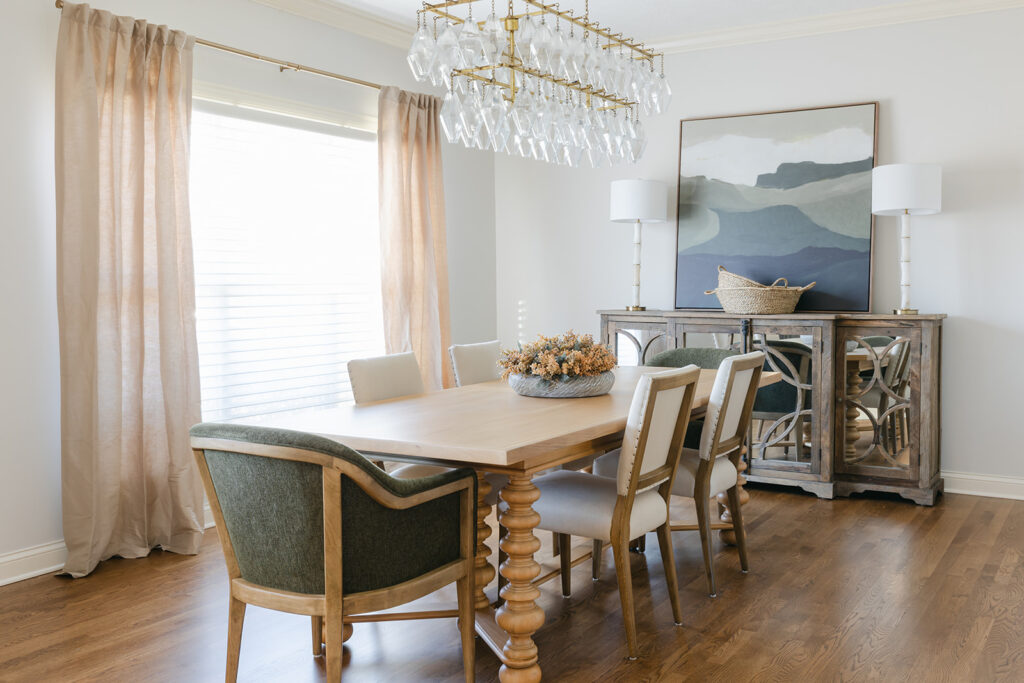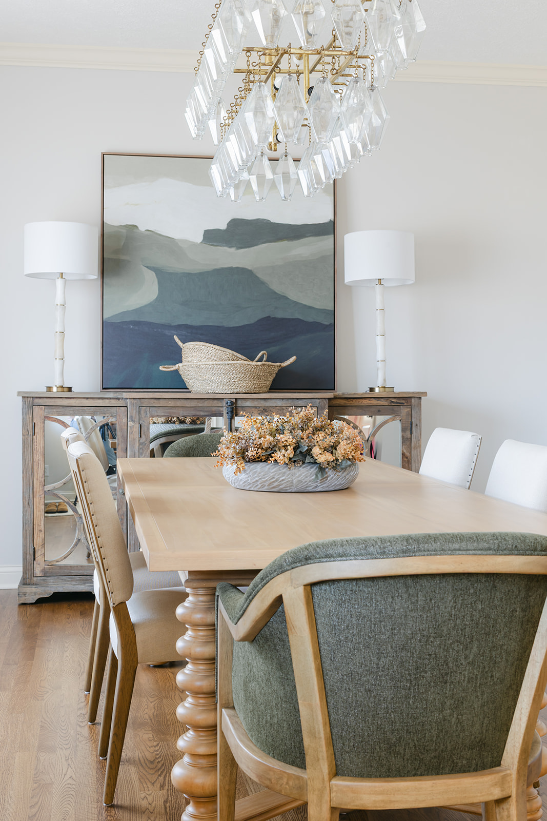 With newly refinished floors, this dining room highlights a stunning new dining table with bobbin legs paired with classic linen parsons chairs and deconstructed olive green end chairs. We selected a statement linear chandelier with faceted crystal accents providing a touch of glamour to the space. Finishing touches include an oversized abstract landscape artwork which coordinates back to the color palette of the side chairs.