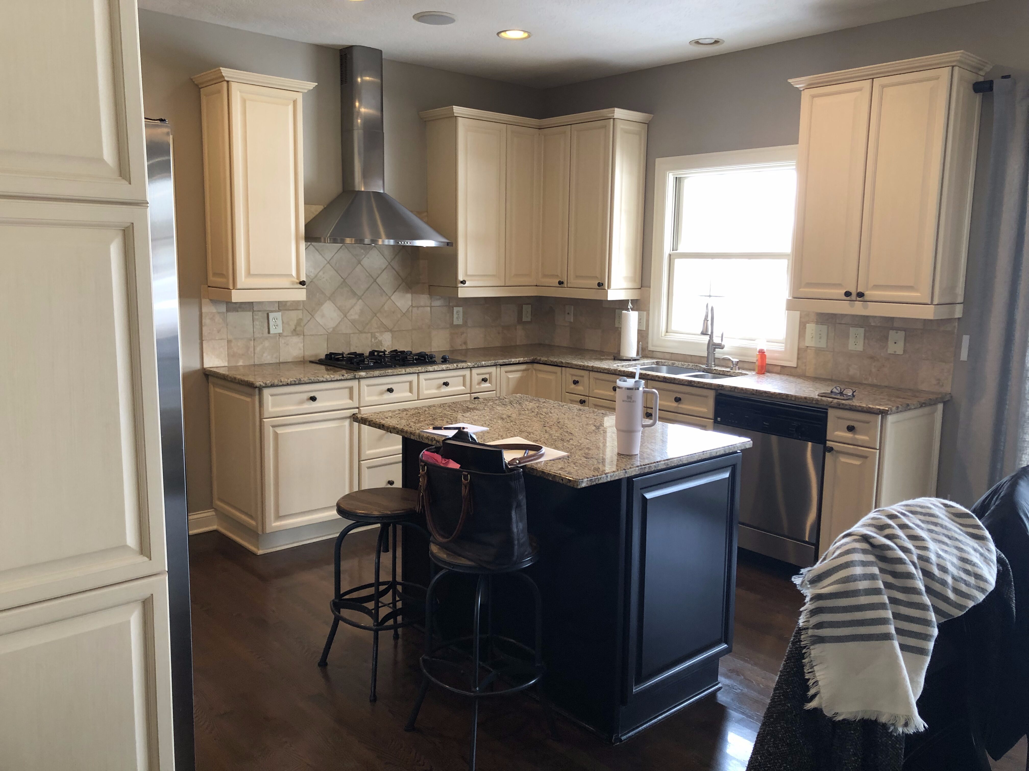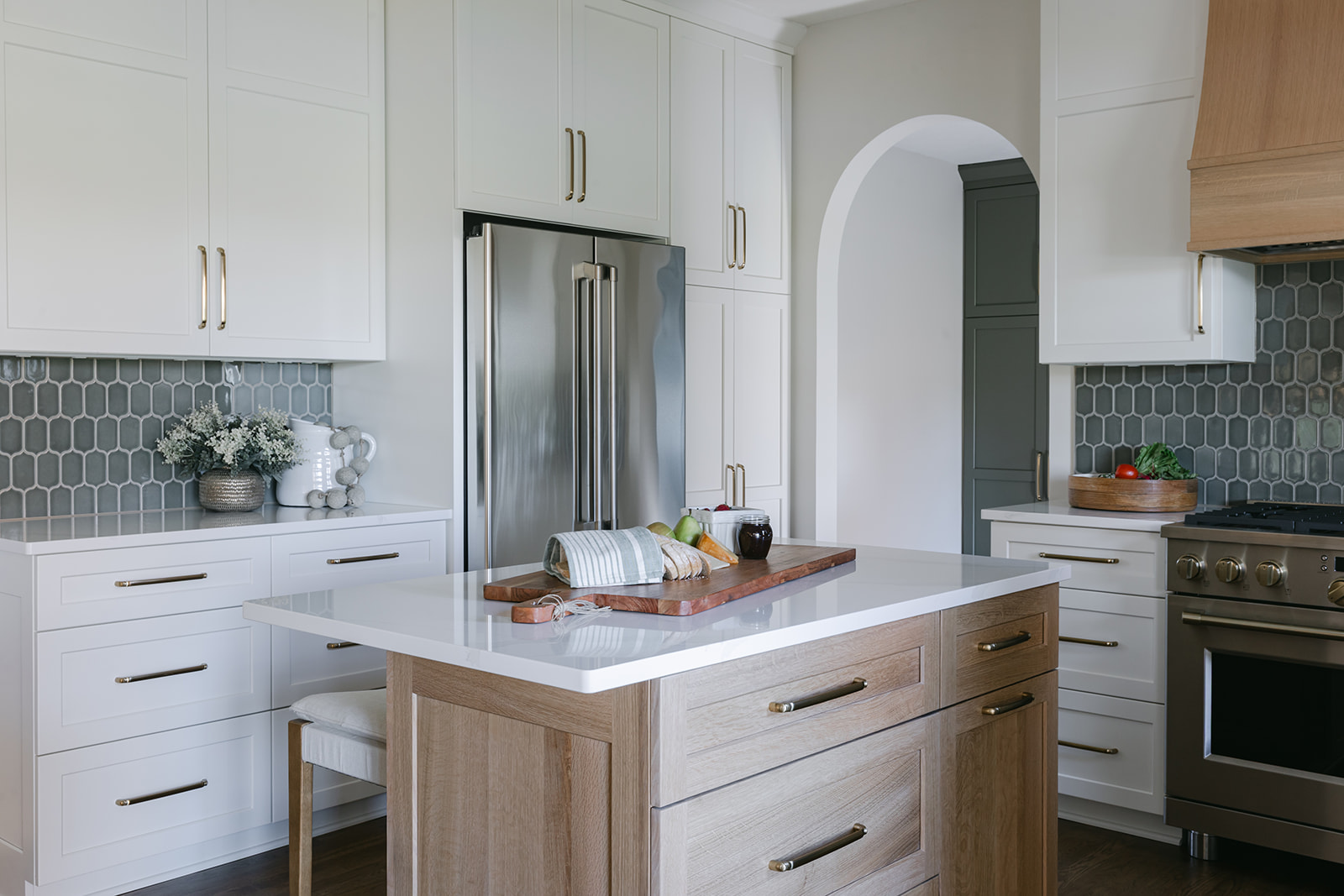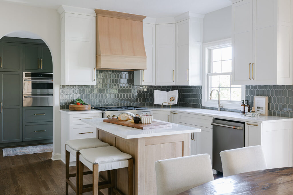 For this kitchen remodel, Michelle and Kelsey updated the space with a fully reimagined butler’s pantry which now provides function and additional storage for the homeowners. The primary kitchen space boasts new cabinetry, clean line quartz countertops, glazed thyme colored tile backsplash with white oak and gold accents. Arched doorways and earthy green trim carpentry add character and warmth to the cozy kitchen.