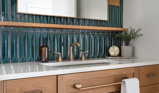Providing a serendipitous mix of charm and glamor, this powder room showcases a textured tile accent wall paired with a delicate fine line floral wallpaper. The smokey blue color palette contrasts beautifully with the marble vanity and brushed gold accents. Warmth was added to the space using rustic woods accessories, deep stained trim and dried star flower stems.