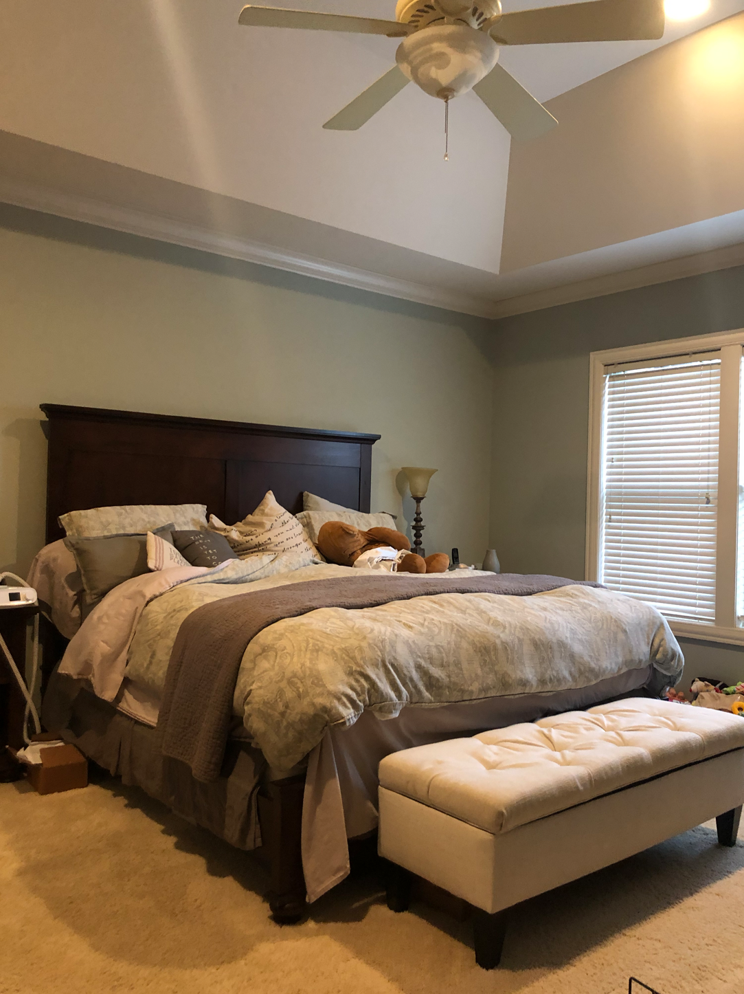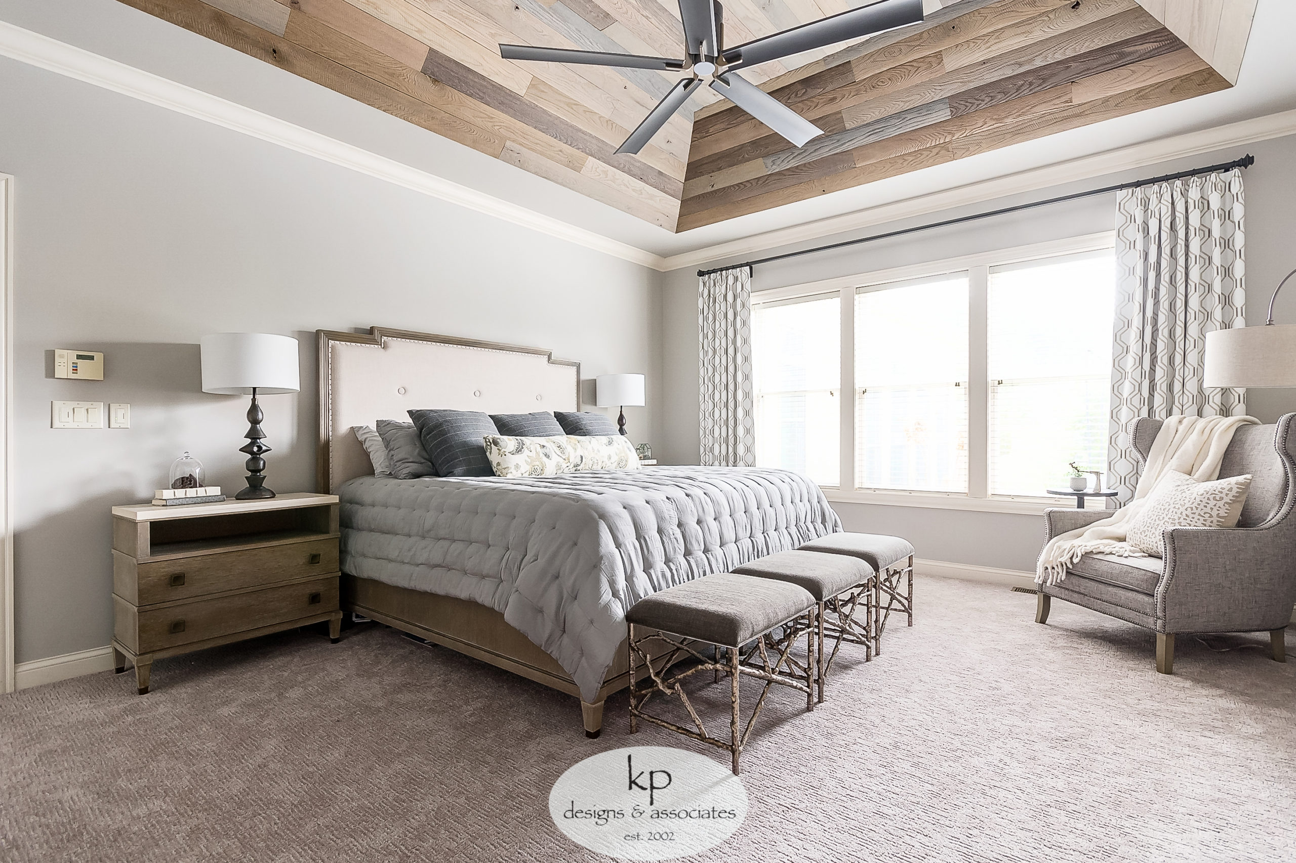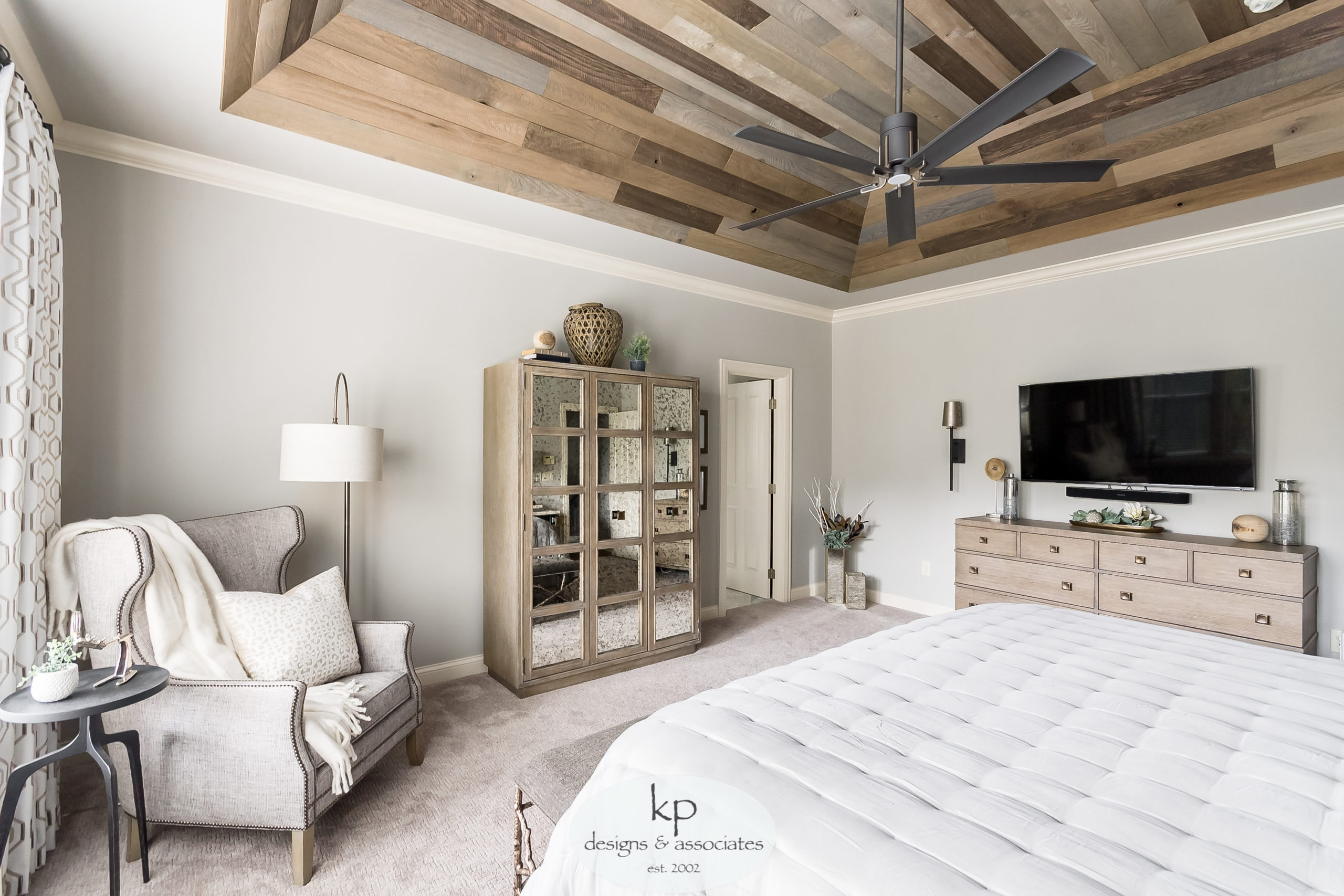 In this primary bedroom, We suggested bringing in a natural wood element and applying it to the vaulted ceiling — the client loved the idea. We kept the furniture neutral wood tones and was sure to offset with mixed metal accessories. We chose soft, luxurious materials, with pops of color for the bed and wing chair to introduce character to the space, but allow the ceiling to be the star of the show.