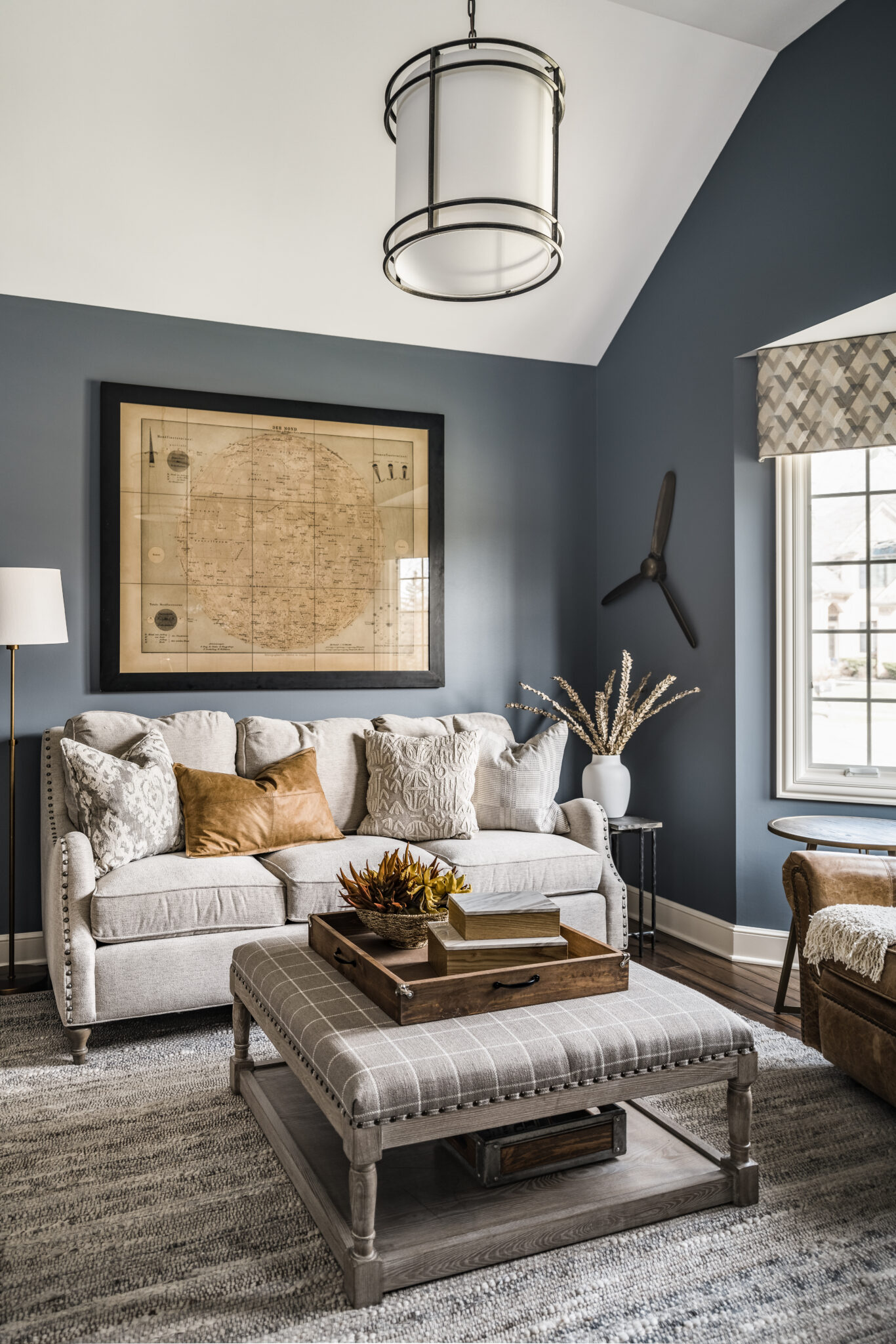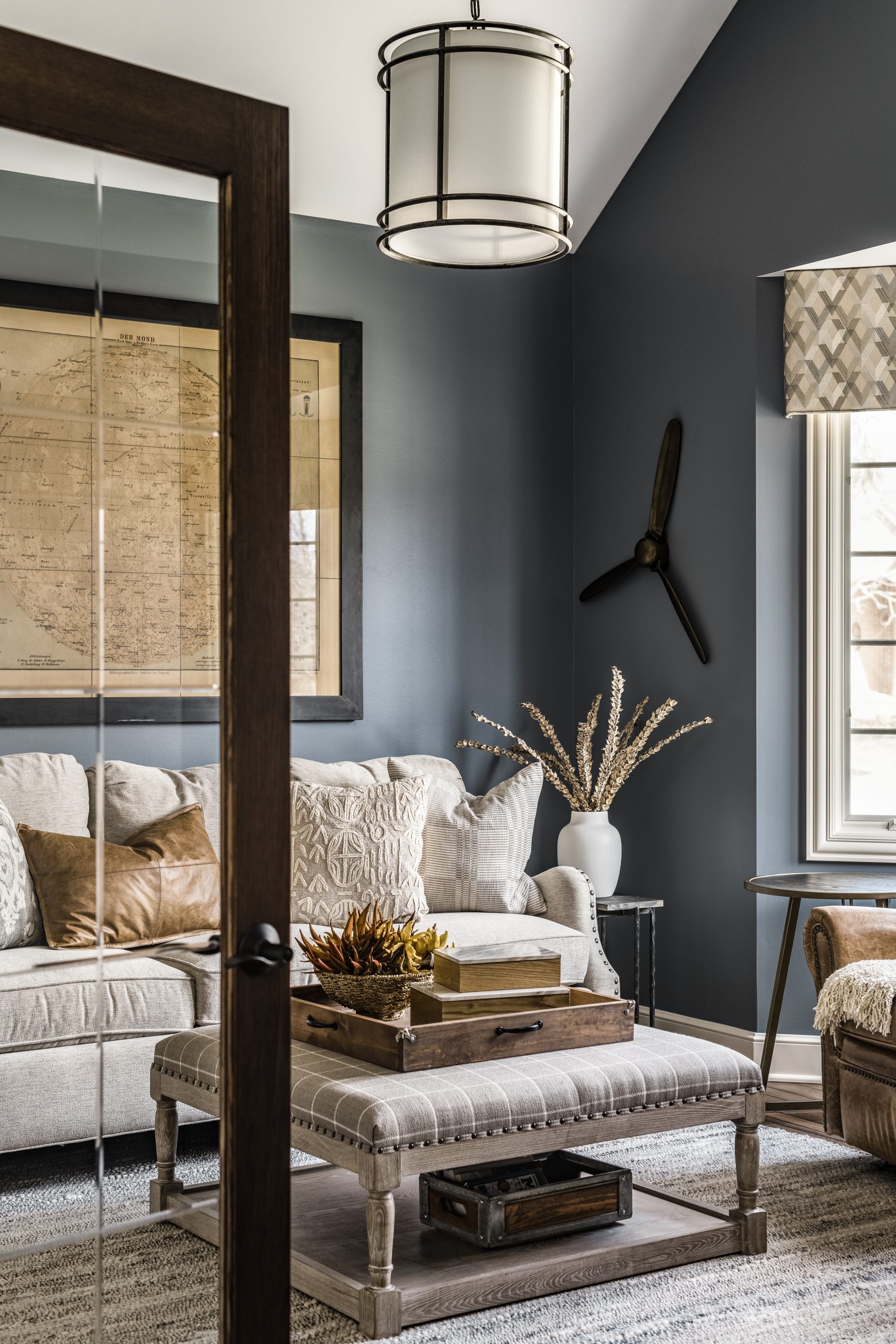 The client desired to build a new home office, and we designed around the client’s favorite comfy chair that they wanted to be tucked away in the office. We went with a sophisticated, moody, handsome, and casual vibe. We added new lighting, paint, window treatments, furniture, and a rug to transform the area into a home office.