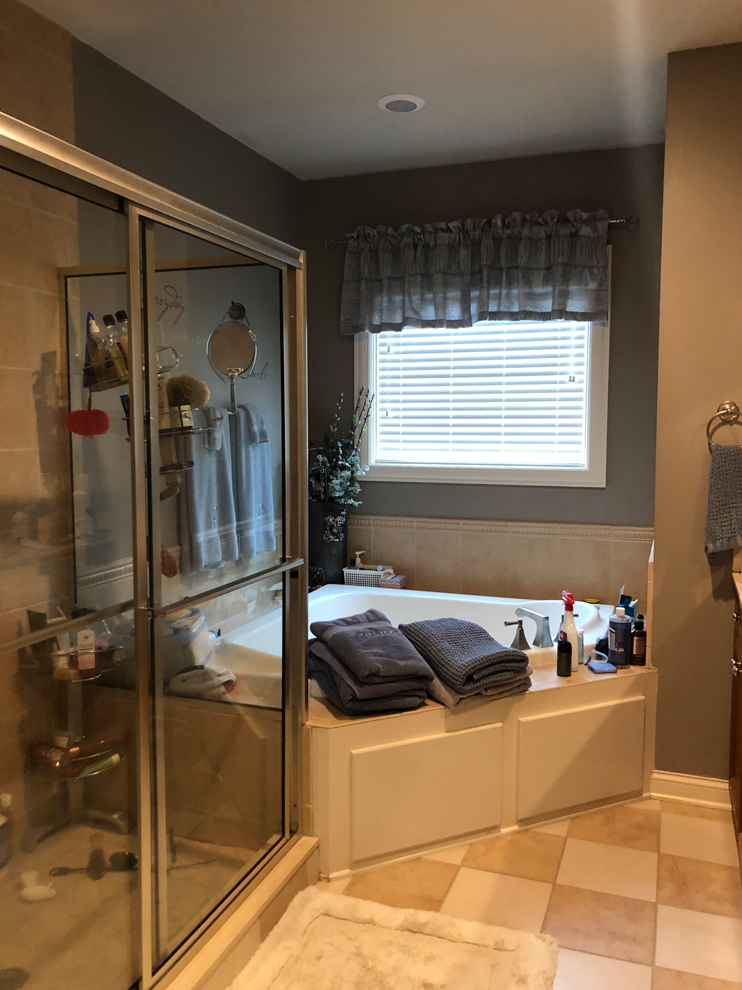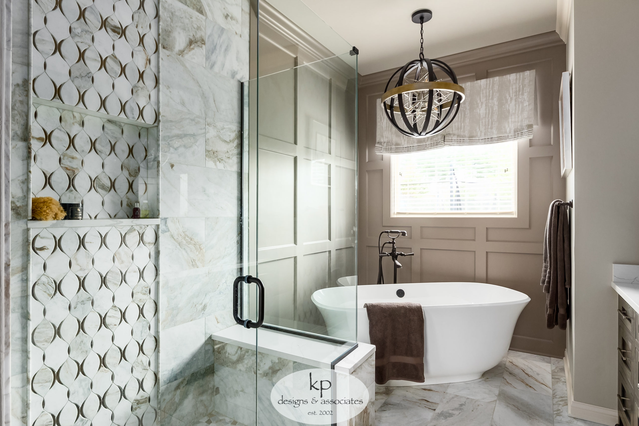 Our client was ready for a completely updated look in her primary bathroom. She rarely used her corner tub and wanted a more sophisticated and spacious design. We added lots of organic, beautiful stone materials, including marble and bluestone. We chose dark and neutral Elm wood cabinets, with lots of character to tie into the polished Nickel metals. Redesigning our client’s walk-in closet door and creating matching vanities completed the space perfectly.