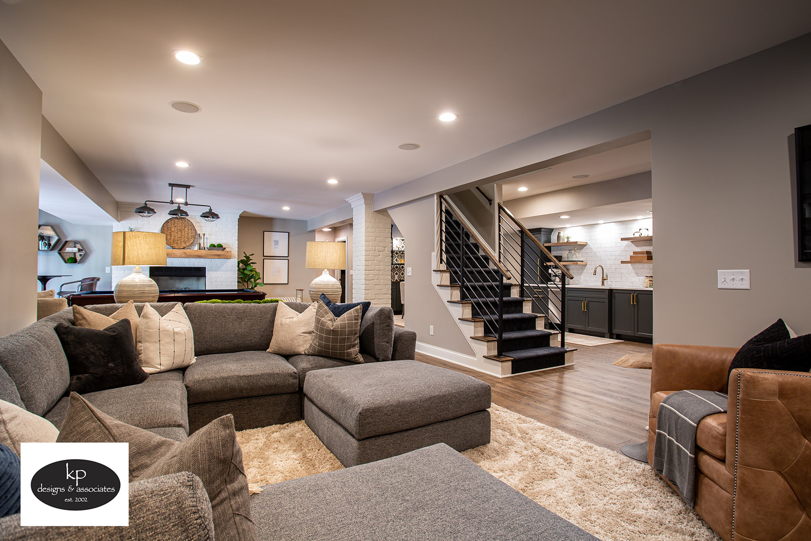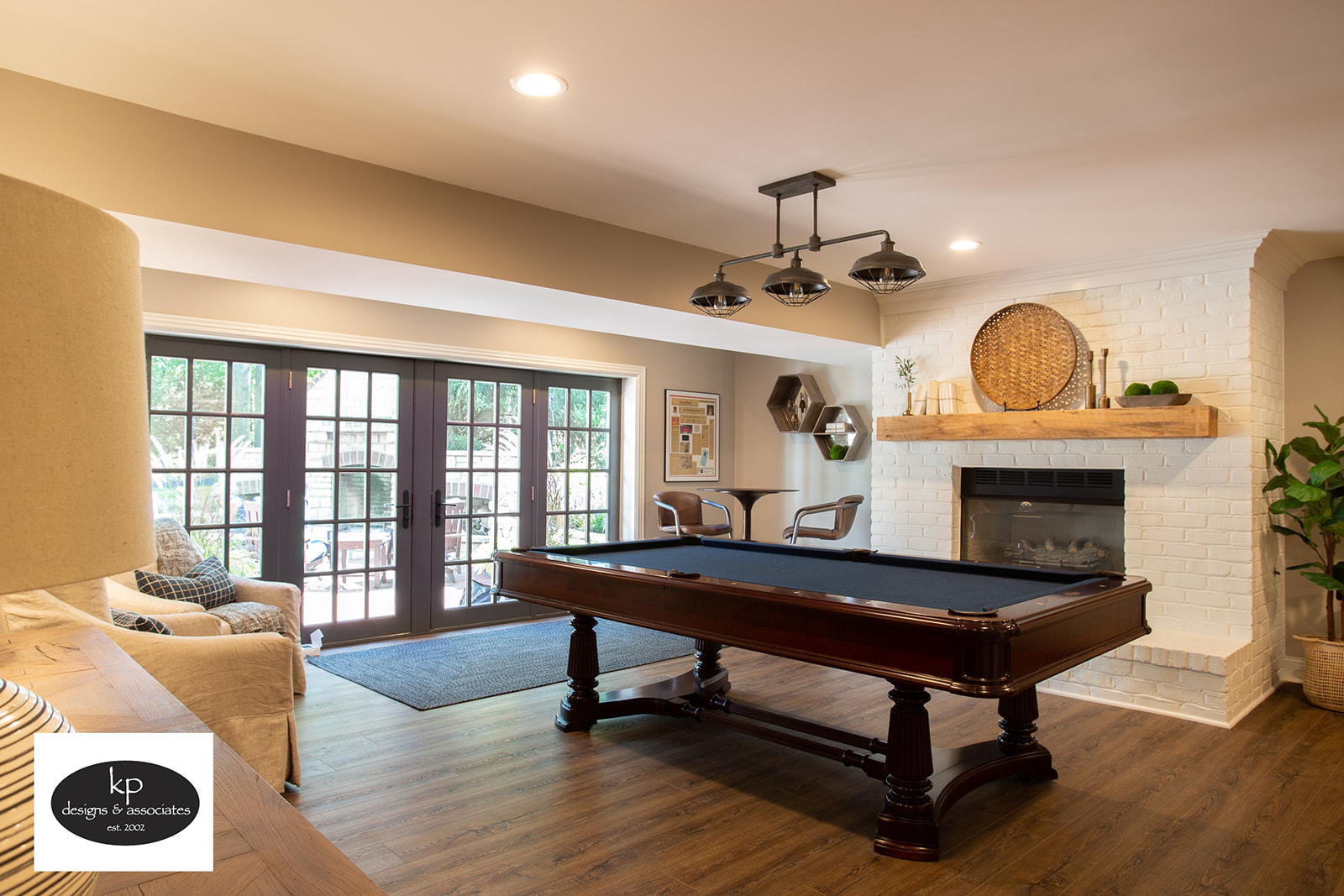 The client wanted to create the ideal family and guest gathering area. We used bar tile, reclaimed wood walls, and a painted brick fireplace to create a fun and unique atmosphere. Implementing a sophisticated, casual design, we remodeled the stairs and railing, opened up walls, and found an antique door. The metal and glass suspension shelving and walnut bar top matched the room design. The game table, custom cabinets, custom painting job, and other furnishings brought endless entertainment opportunities to this residential basement space.