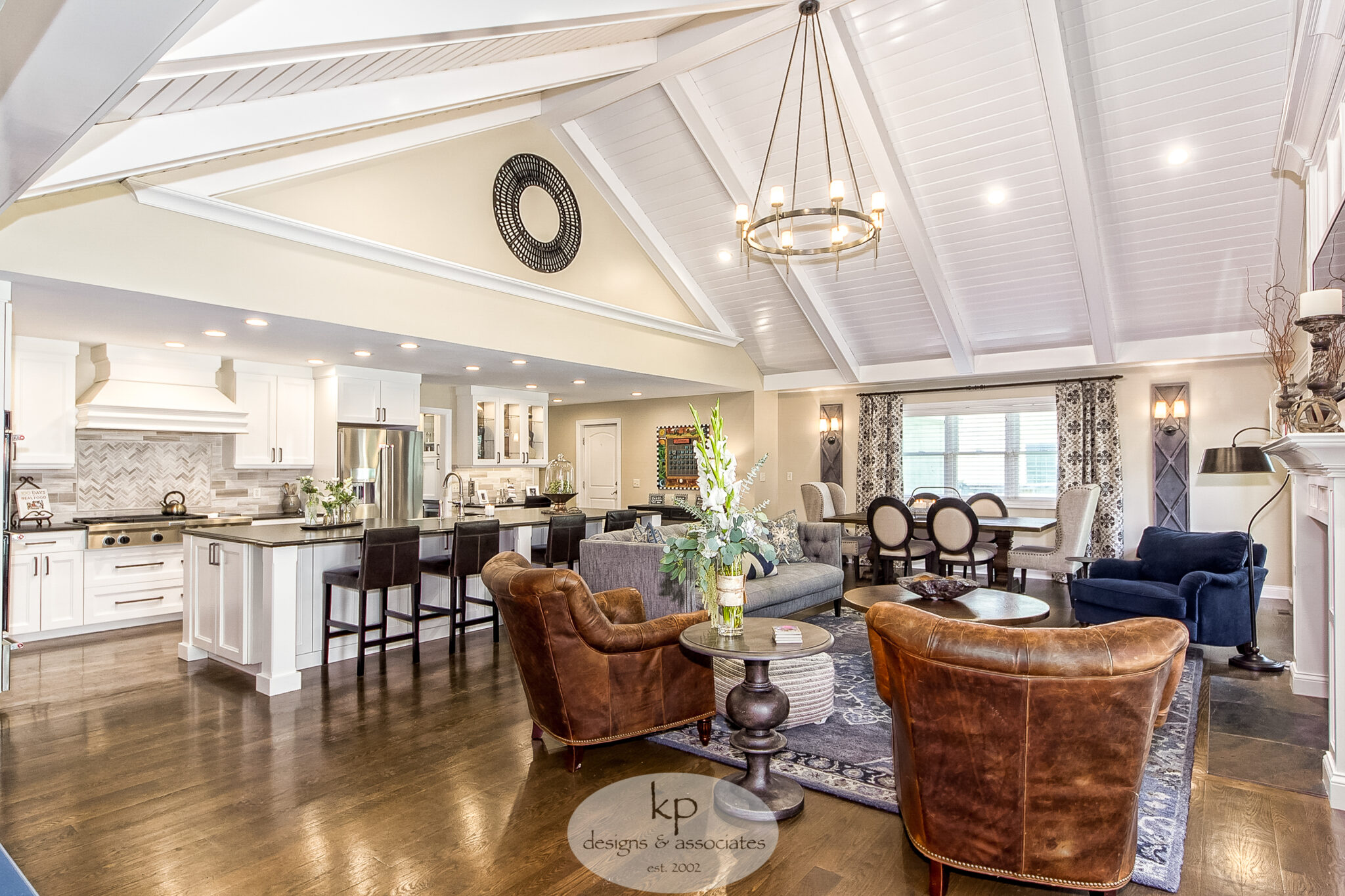 The client wanted to open up the small kitchen into the living room. The airy traditional aesthetic guided us through the remodel. First, we worked with a contractor to install a weight-bearing header beam through the kitchen to the back entrance to eliminate the need for posts. Then we added custom tongue and groove planks and beams to the ceiling. White cabinets, a custom fireplace, granite countertops, and refinished hardwood floors added to the transformation. Finally, the finishing touches were vital, including new lighting, furniture, a gallery wall, and a painted blue antique piece to add color.