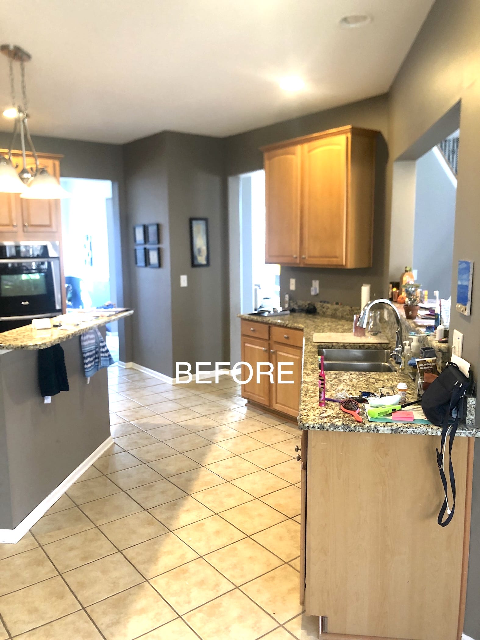 The clients wanted to open up their kitchen to make it more functional for the family. Inspired by transitional design mixed with rustic touches, we started by removing walls and replacing the larger islands. Next, we wrapped structural beams to make them modern and seamless with the design. New cabinets, hardwood floors, and warm wood mixed with blue accents were implemented throughout. Bright paint and modern lighting fixtures finished off the kitchen reveal.Captured by Tiffany Ringwald Photography.