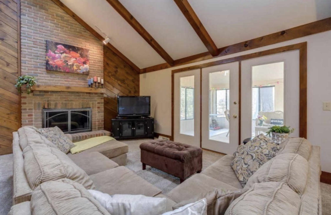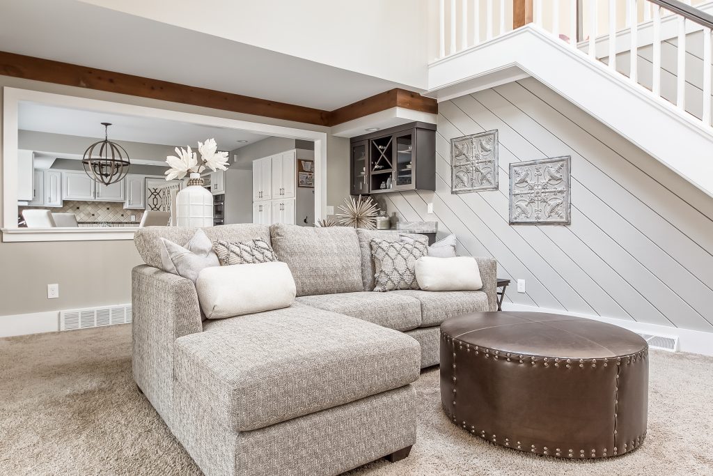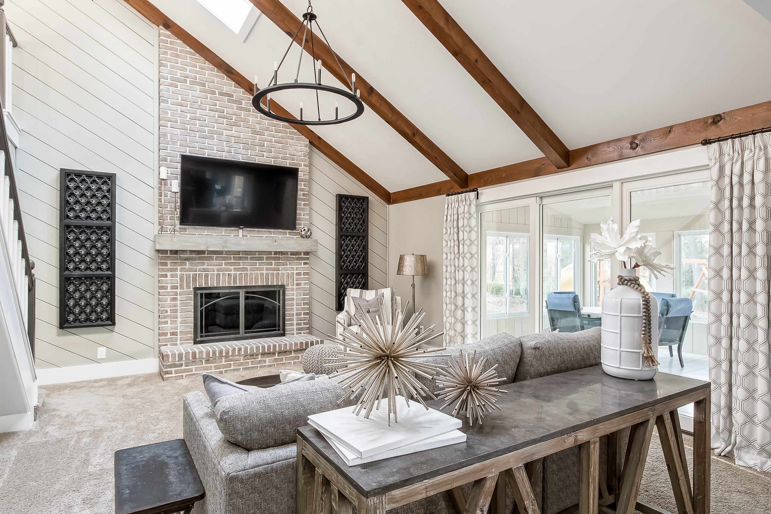 The family moved into a dated home and wanted the living room updated. The transitional design was implemented with new windows and doors, a stair system, painted trim, and paneling. The wet bar was replaced by a dry bar with Moscavo countertops. The fireplace was whitewashed with new furniture and custom window treatments to finish off the space.