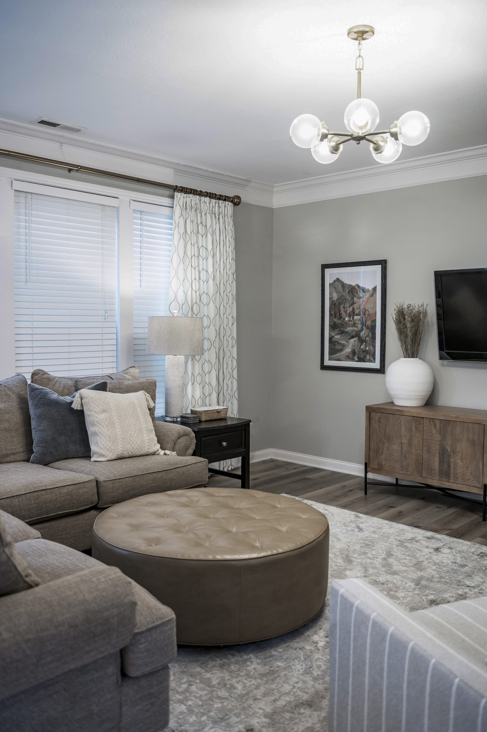 | New paint, flooring, and lighting made a big difference in this room. The homeowners wanted to utilize their current sectional but an updated layout created a focal wall and added more seating. The colors and style flow nicely from the remodeled kitchen.