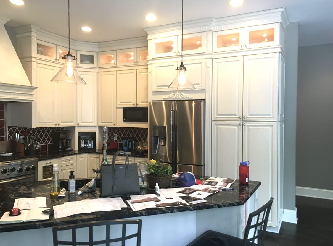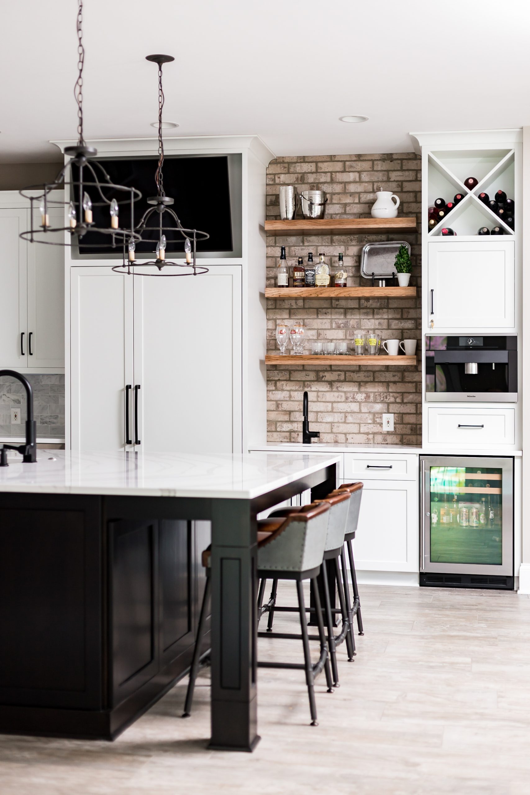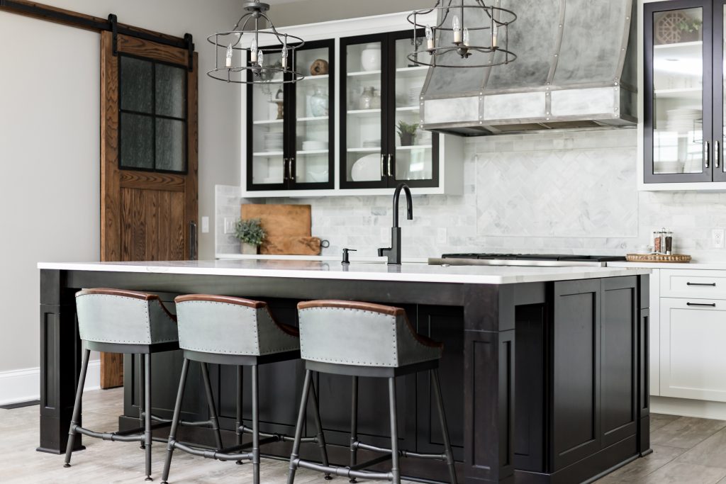 The family has six kids, so they wanted to make the kitchen more functional and transform a bonus room into a pantry. The transitional design included black and white mixed with natural wood tones at the client’s request. The island was made larger, and we created a beverage center at the entrance to the kitchen from the living room. A barn door separates the new pantry from the kitchen, and a faux-finished range hood is the kitchen’s focal point.
