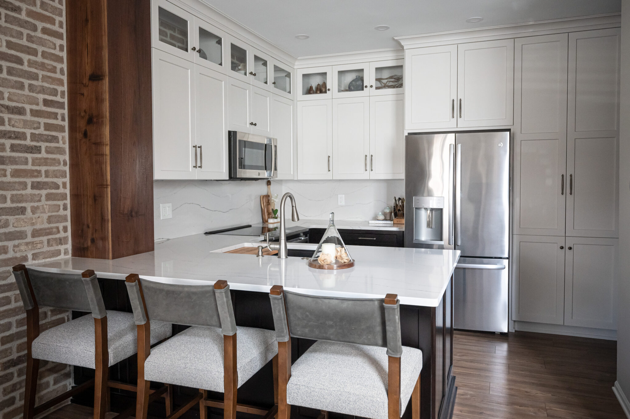 We carried the brick from this client’s family room into the dining space and the upper glass display cabinets in the kitchen. We added accent lighting in the display cabinets to highlight the brick feature. The ductwork was covered with a beautiful walnut wood feature to mix function and form, giving intentionality to the design. The Cambria countertops were carried up in a full height backsplash for a beautiful and simple look. We chose Transitional patina hardware to add character amidst the white cabinetry and she optimized storage space, including a built-in pull-out trash can. The space was grounded with a deep cherry stain on the peninsula.