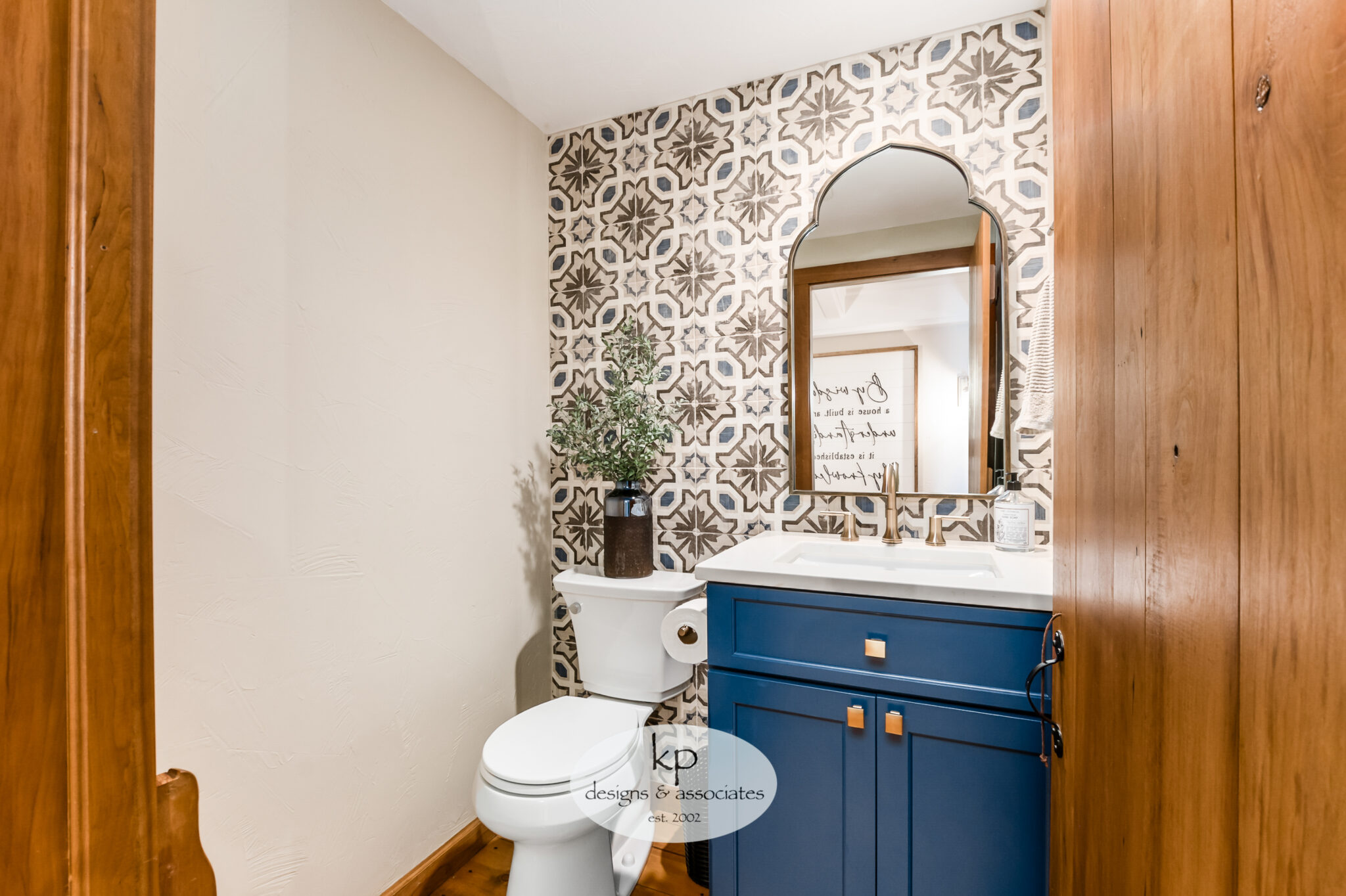 The guest bathroom needed more storage options. We implemented transitional design elements by adding a tile accent wall. The navy vanity cabinet with gold hardware and sink fixtures paired gorgeously together. And the bronze-shaped mirror was a lovely accent piece to the powder room.