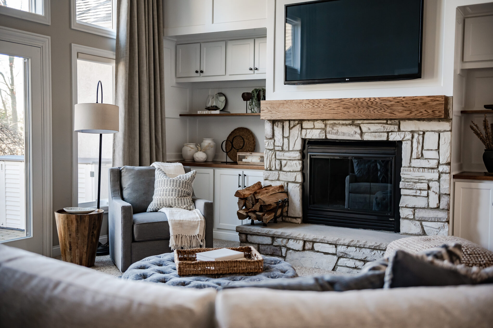 A family room before and after! With a mix of open and closed storage, Beth updated the mantle design and surrounding stone with Hamilton Parker.