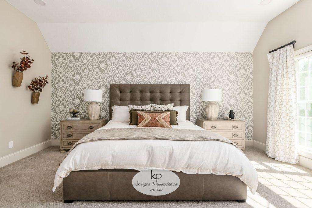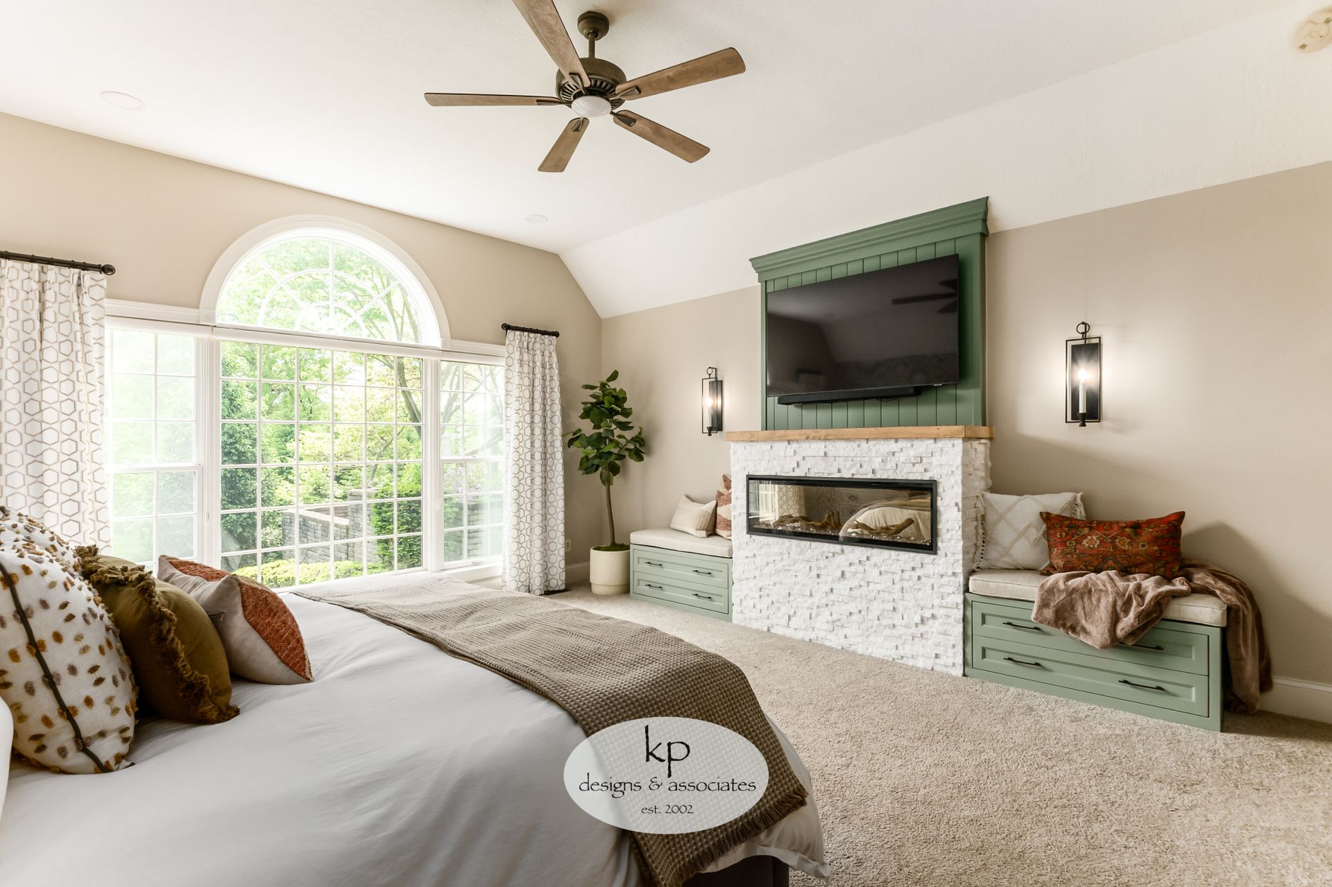 The clients wanted to continue their transitional with earth tones inspiration in the master bedroom. We added a fireplace to the expansive room, with bench seating with drawers for extra storage. The Ikat wallpaper created a bold accent wall that is fun and interesting. The tufted leather bed adds warmth and texture, with rust-colored pillows with leather piping accenting the design.