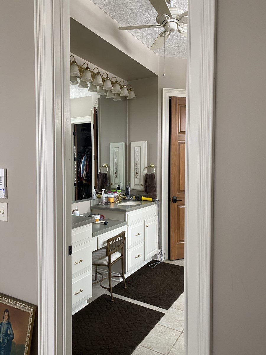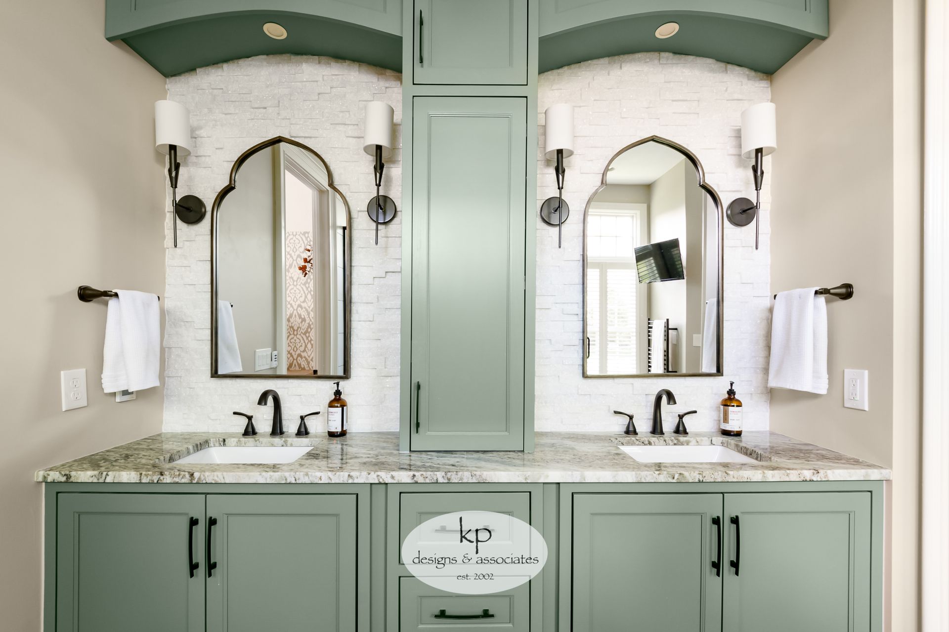 The client wanted a modern bathroom with more storage options. Following a transitional design, we kept the same footprint but included more cabinetry in the vanity area. We added decorative eyebrow valances and more lighting to make the space more functional. Heated wood-like tile floors were installed for a perfect bathroom floor option. The pebble tile in the shower was coordinated with the cabinet color. We placed stacked white stones behind the mirror to match the stone on the fireplace in the bedroom.
