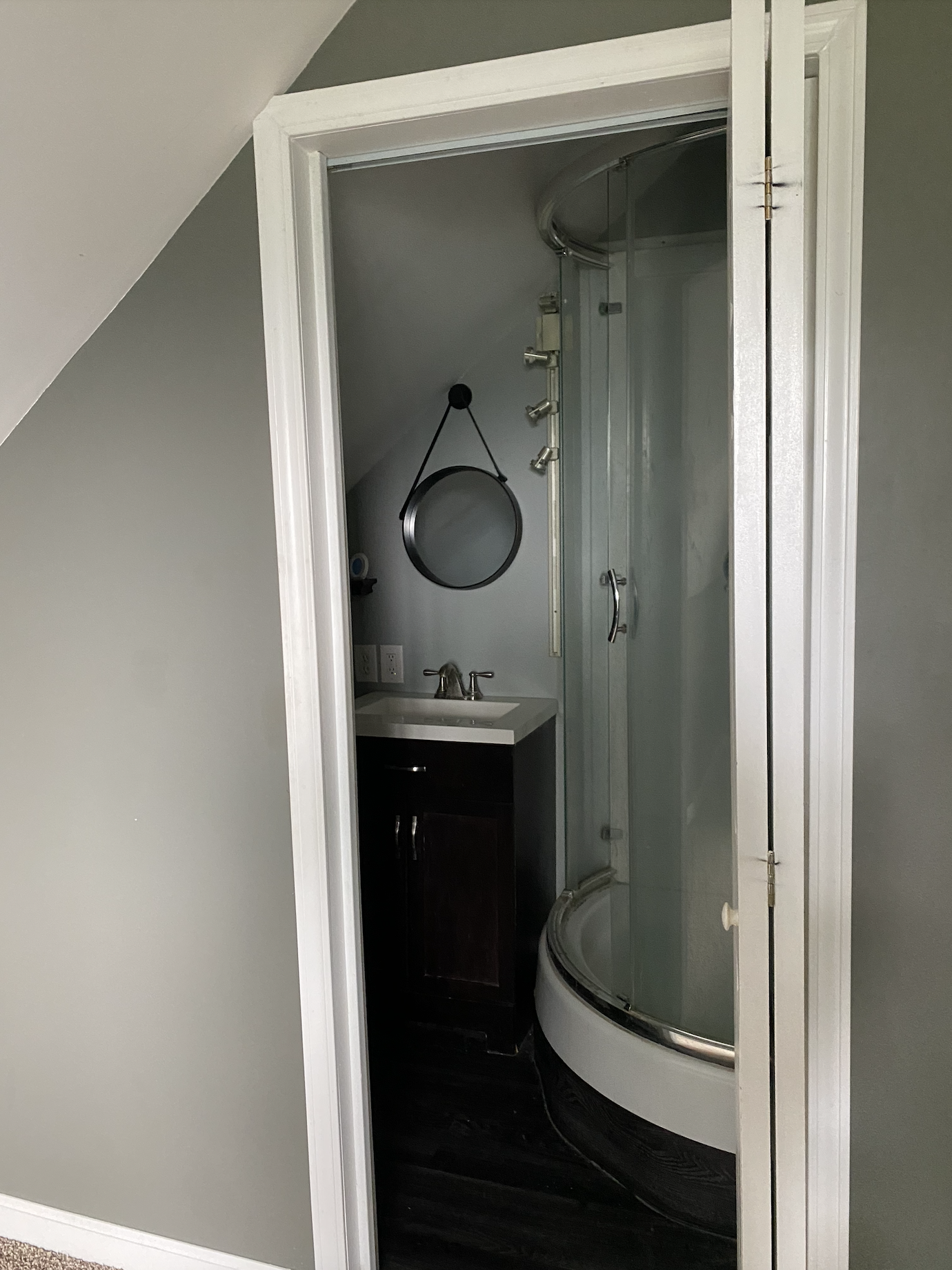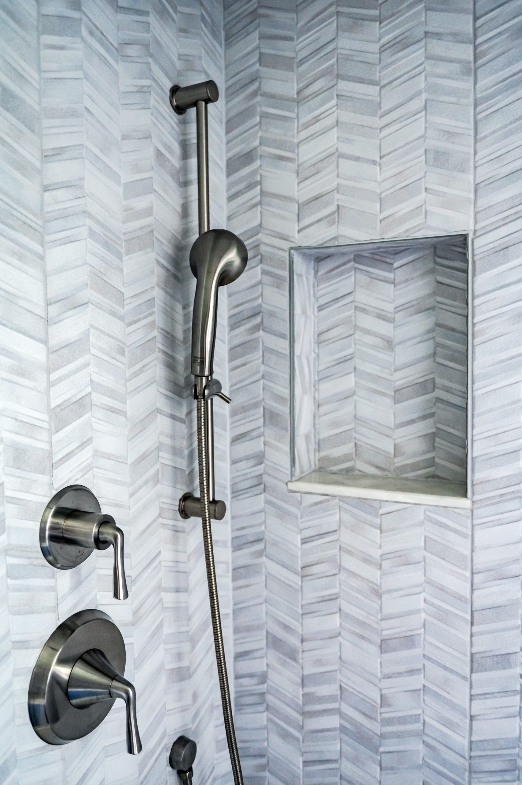 Strategic space planning allowed for a larger shower featuring unique tile in this remodel. A light blue vanity adds a fun pop of color and guests now feel welcome to use this updated bathroom. Captured by