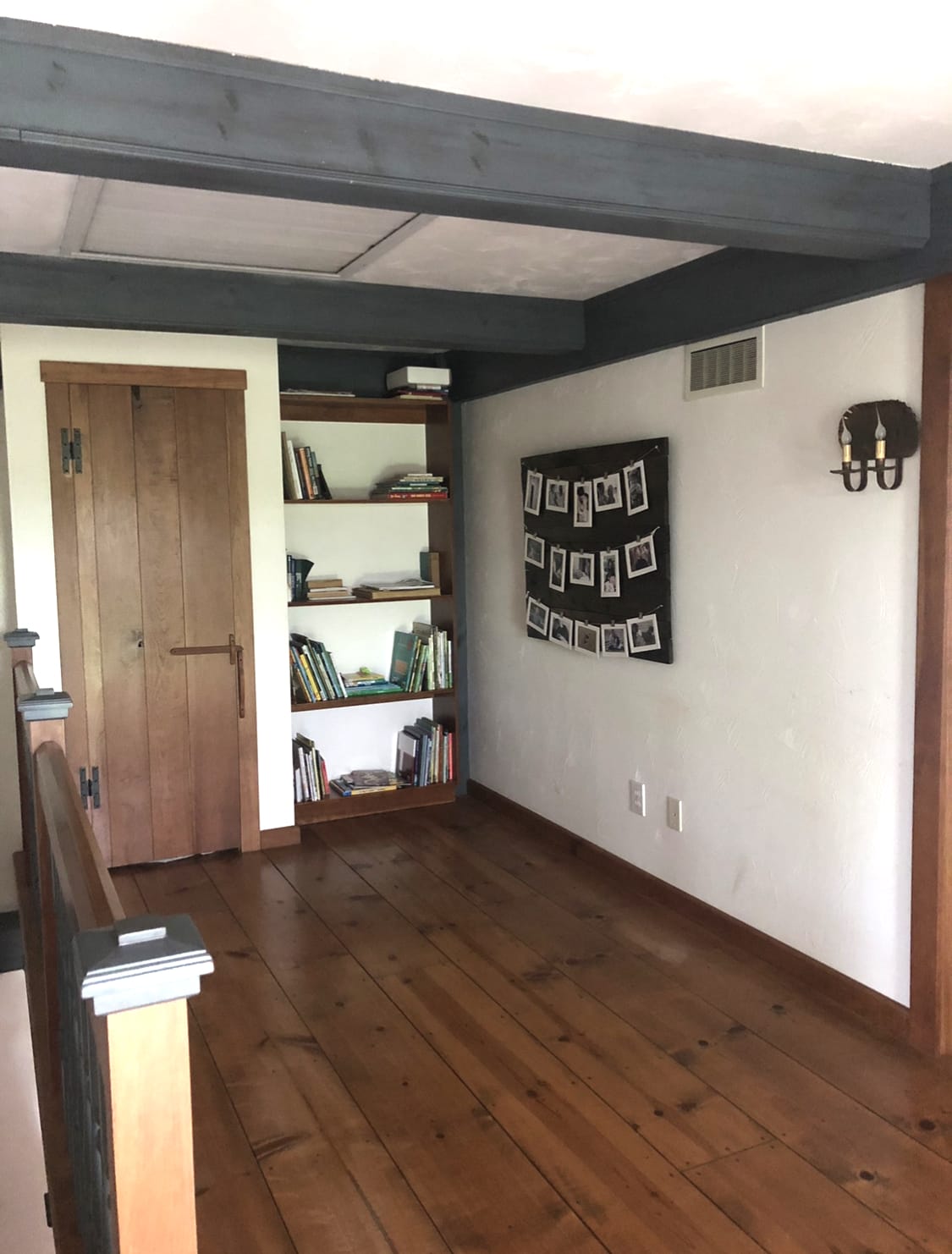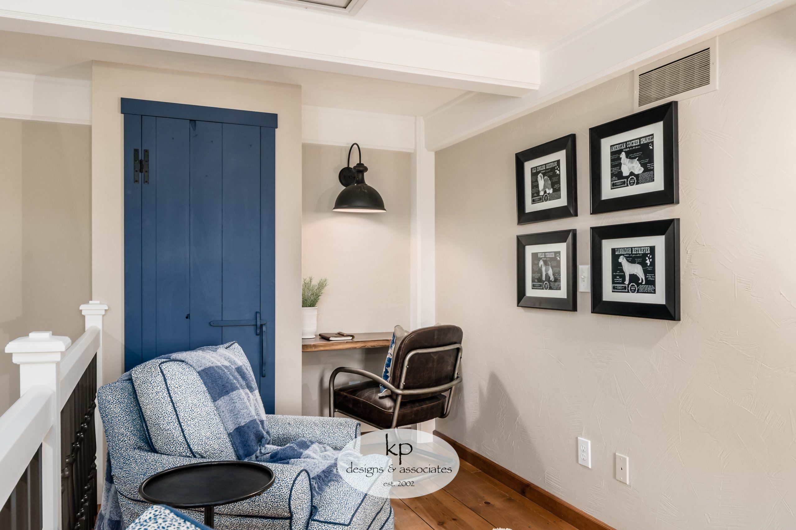 The client wanted more use out of the loft by the kids’ bedrooms, so Erica removed the existing bookshelf and added a new walnut desk and a sconce light. The closet door was painted blue to match the fun pattern on the accent chair. And we included a shaggy rug for warmth. Different dog breeds are hung on the wall for fun décor.
