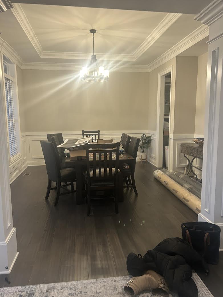 In the dining room Erica was able to use the existing table and chairs while still making the space feel brand new. The empty nook was filled with a custom dry bar, complete with storage, a wine fridge, and unique wood accent panel. She softened the dark furniture with an area rug and upholstered end chairs. Artwork, lighting, and custom window treatments complete the look.