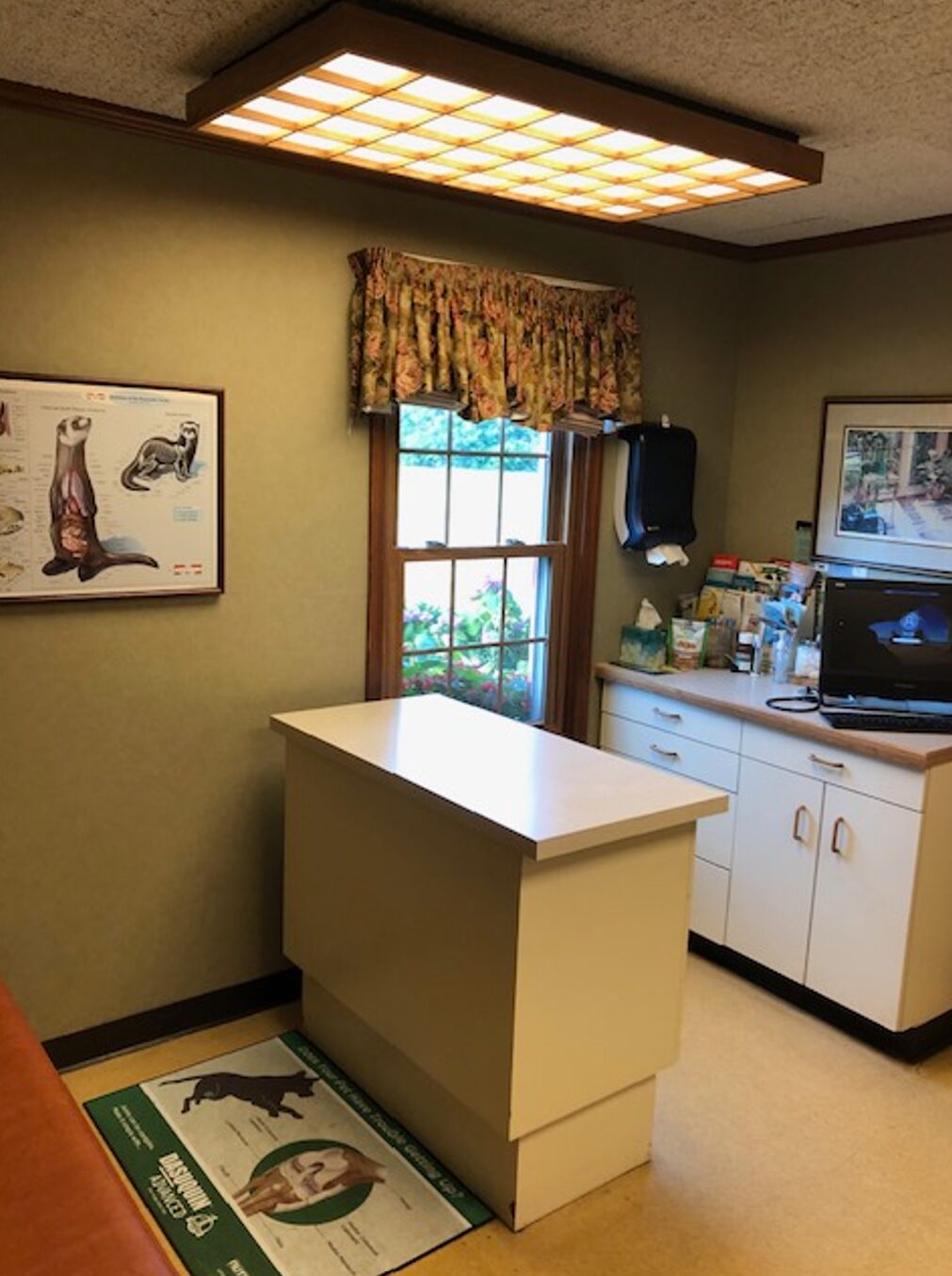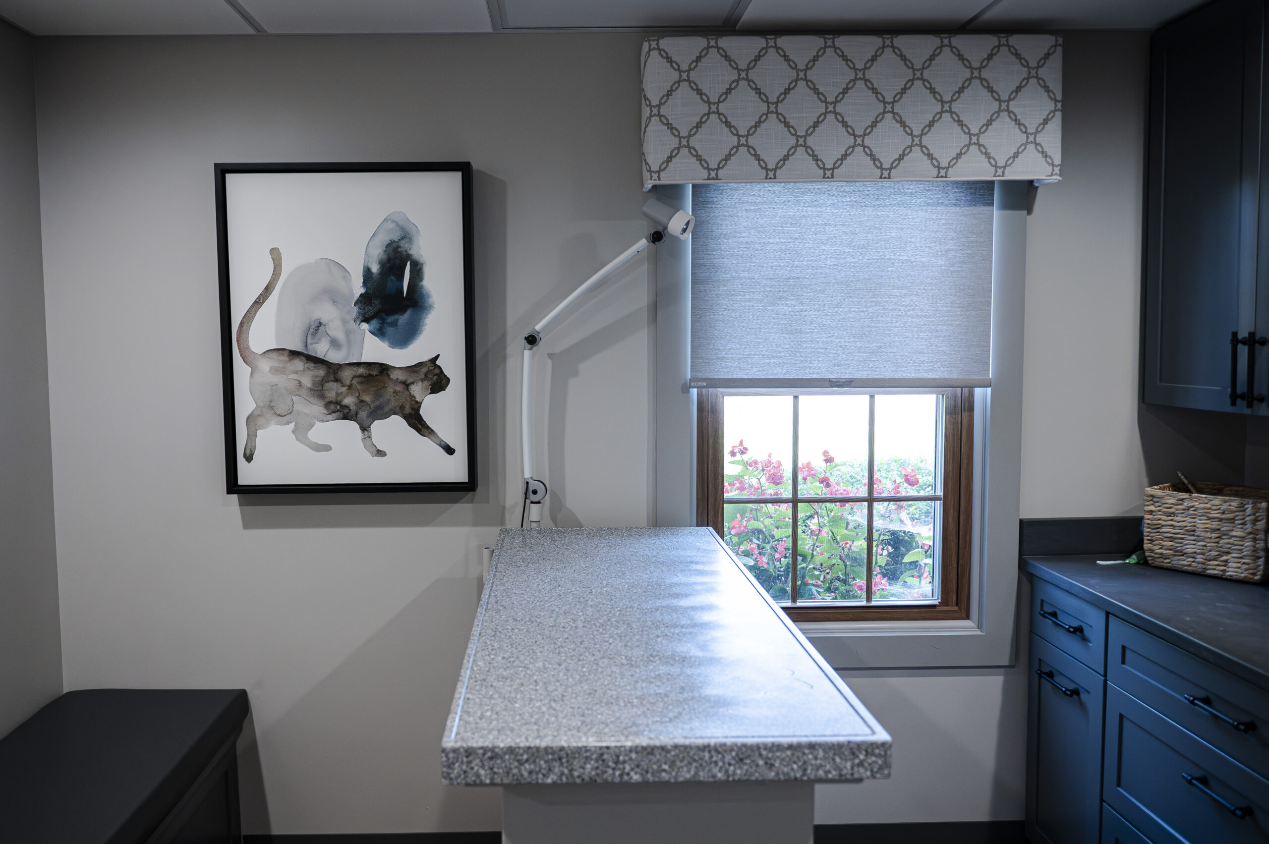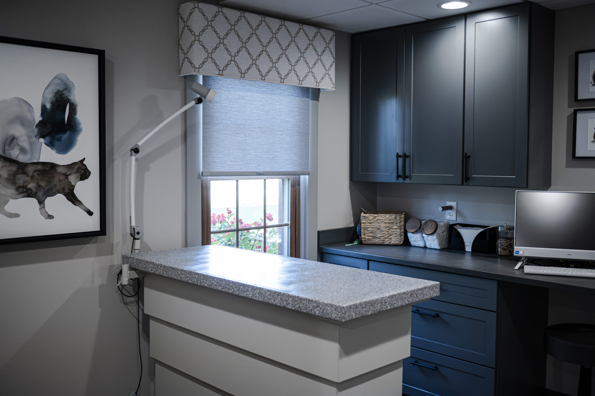 This vet clinic had a full remodel from top to bottom with dramatic results. The exam rooms and pharmacy areas were completely reconfigured and we also were able to add a fourth exam room without having to add onto the building. Each exam room received a new exam table, cabinetry, custom bench and artwork for the walls. As with the rest of the remodel, the new doors, flooring, trimwork, window treatments and lighting made a huge difference in each room. The pharmacy also got new cabinetry and countertop focusing on maximizing storage and providing a clean efficient area to work. In the pharmacy we showcased black and white photos of the staff’s pets which became a favorite feature of the clinic.