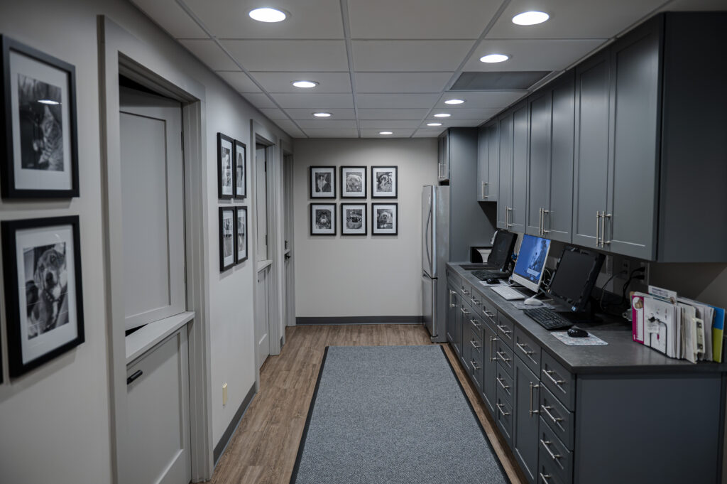This vet clinic had a full remodel from top to bottom with dramatic results. The exam rooms and pharmacy areas were completely reconfigured and we also were able to add a fourth exam room without having to add onto the building. Each exam room received a new exam table, cabinetry, custom bench and artwork for the walls. As with the rest of the remodel, the new doors, flooring, trimwork, window treatments and lighting made a huge difference in each room. The pharmacy also got new cabinetry and countertop focusing on maximizing storage and providing a clean efficient area to work. In the pharmacy we showcased black and white photos of the staff’s pets which became a favorite feature of the clinic.