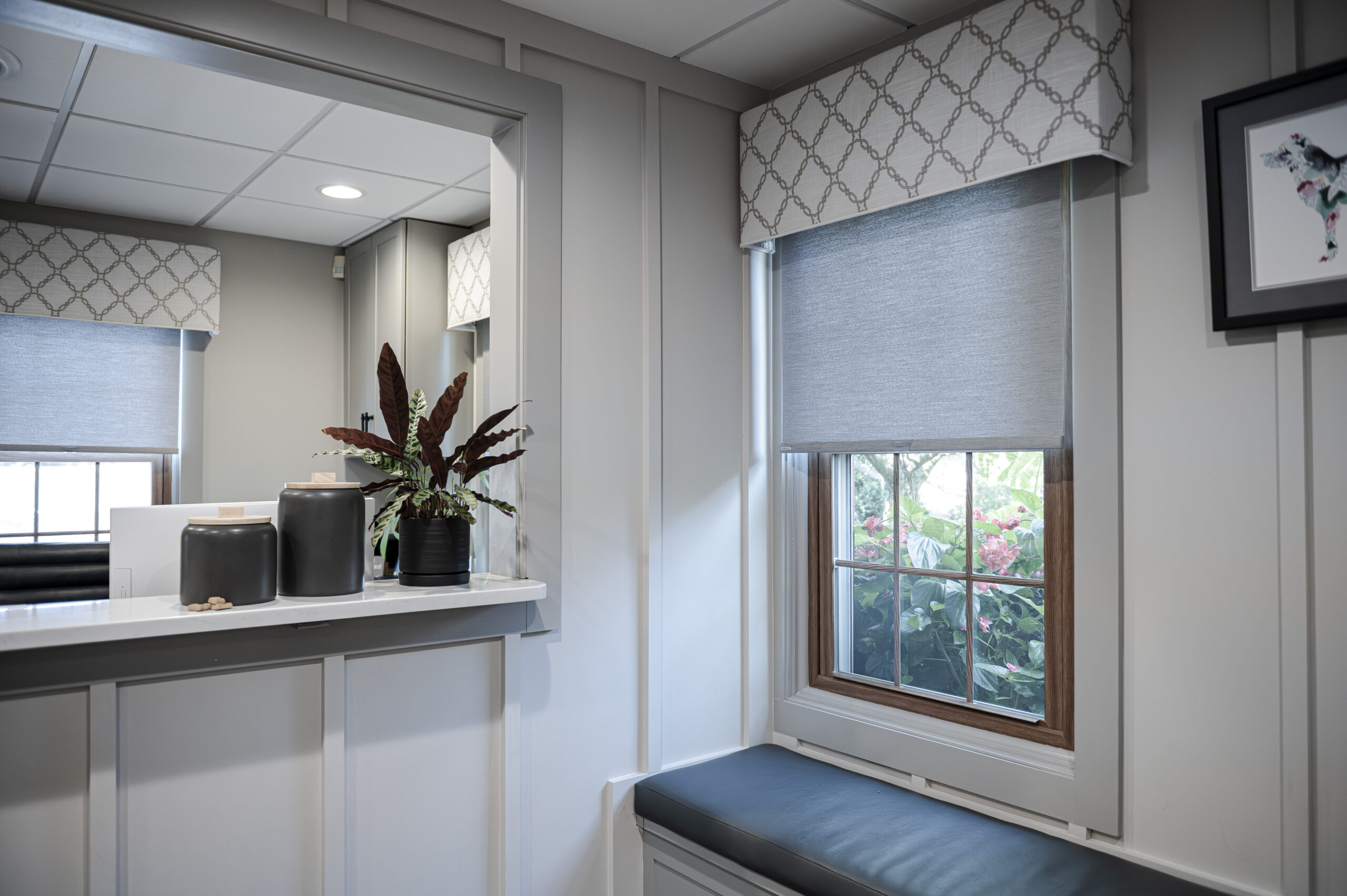 This vet clinic had a full remodel from top to bottom with dramatic results. The reception area and break room were completely reconfigured to better utilize the given space and optimize function. We updated these areas with new cabinetry, countertops, lockers and bench seating. New overhead lighting, doors, flooring, window treatments and trim detailing were updated throughout. The paint and materials selected brightened the whole area and freshened up the overall space giving it charm and a “hometown clinic” feel. Custom artwork was added to the walls to give a pop of color and functional accessories were added for the finishing touch. Captured by Tammy Dean Media.