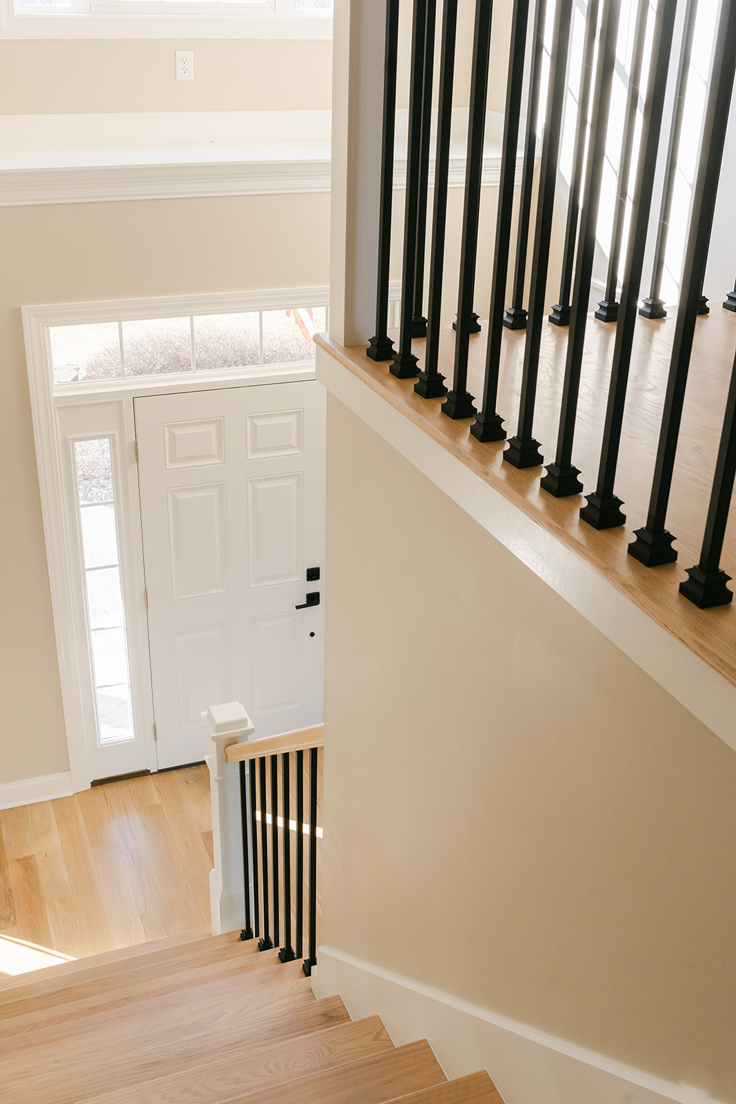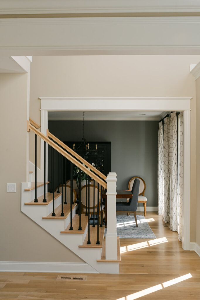 Fresh paint, new lighting, custom window treatments, and refinished hardwood floors/steps were done throughout the whole first floor. Erica added new iron spindles in the entry.