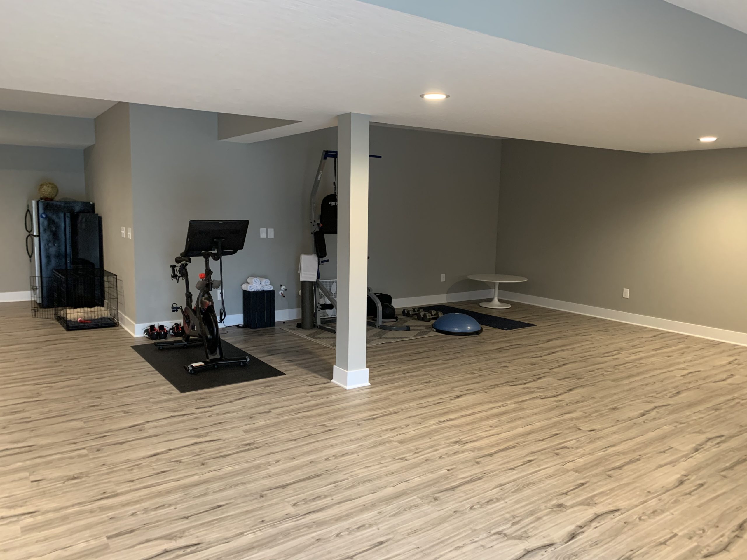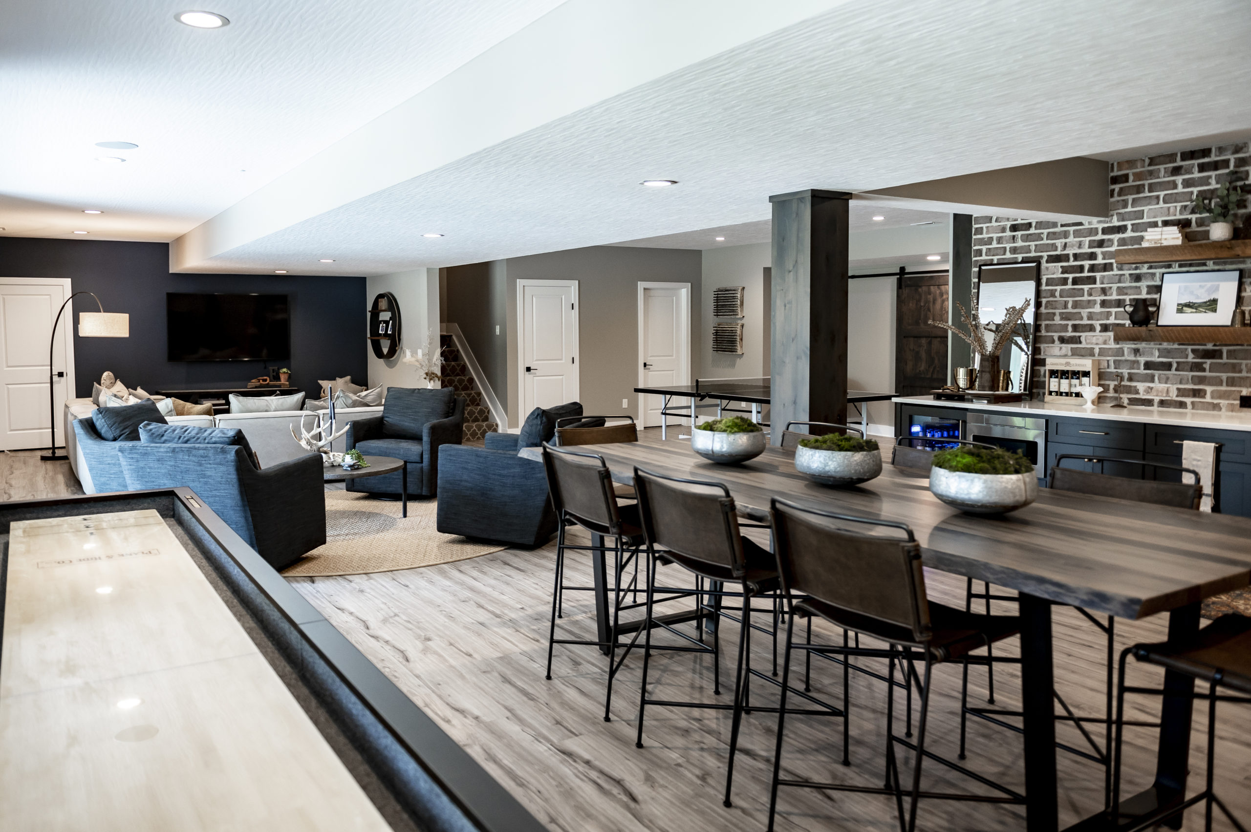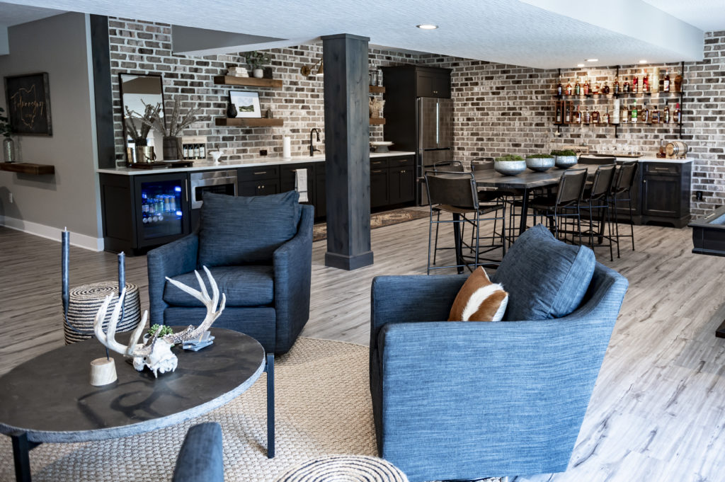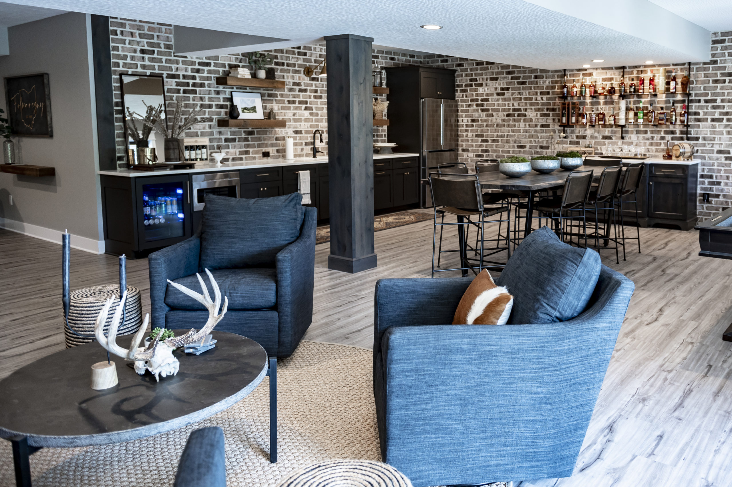 | We began with a finished basement that was a blank slate. The goal was to create an entertaining area that could be used to make outdoor cooking easier, having friends and family over and to create a purpose in general for the large space. We worked with a contractor and custom cabinet makers to create a kitchen/bar area surrounding a 10 foot handmade live edge one of kind community table. We created conversation areas that are flexible for larger gatherings. Adding brickwork, columns, beams, chunky floating shelves and other custom features like the iron and bronze glass shelving warmed up the large space that used to feel open and simple.