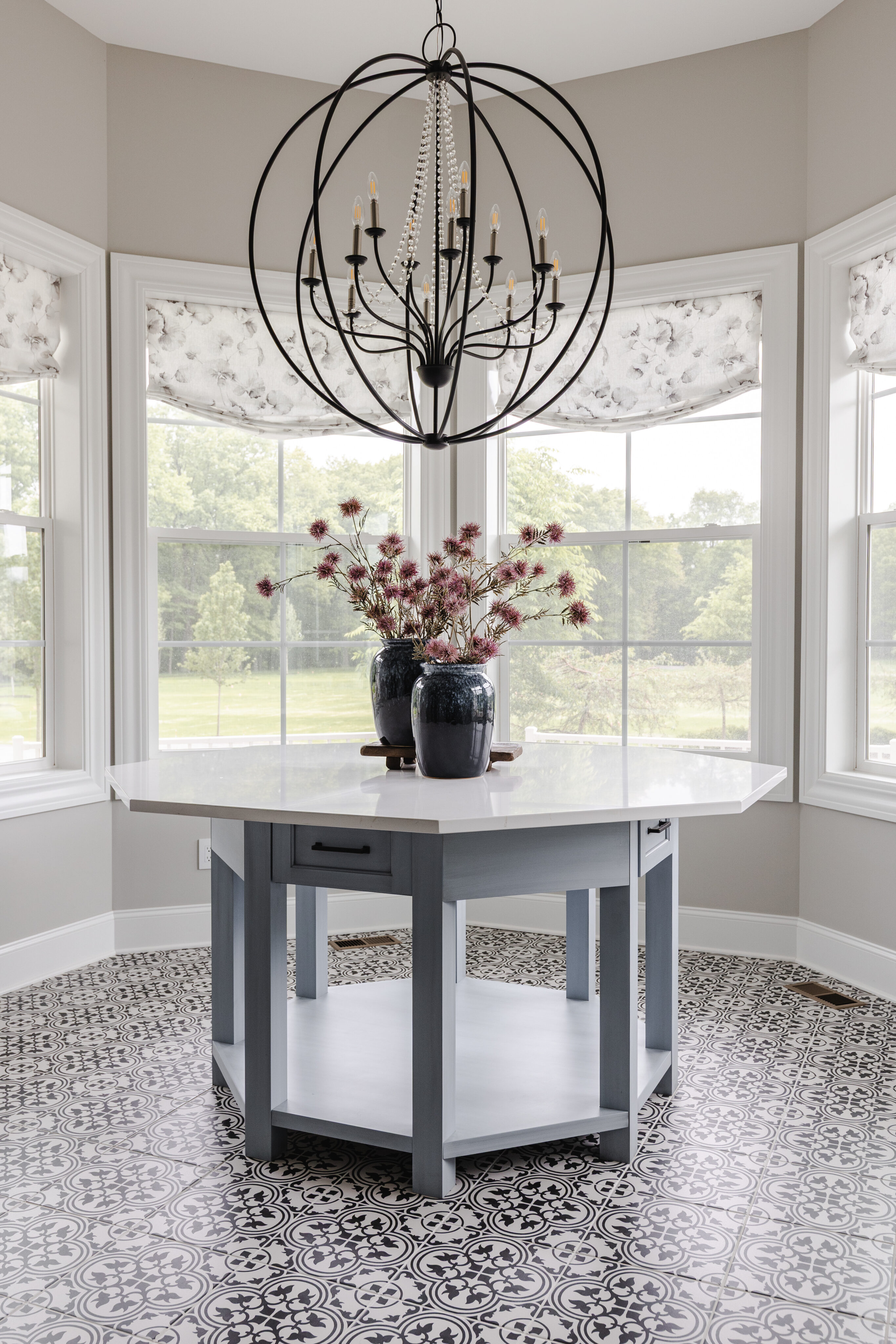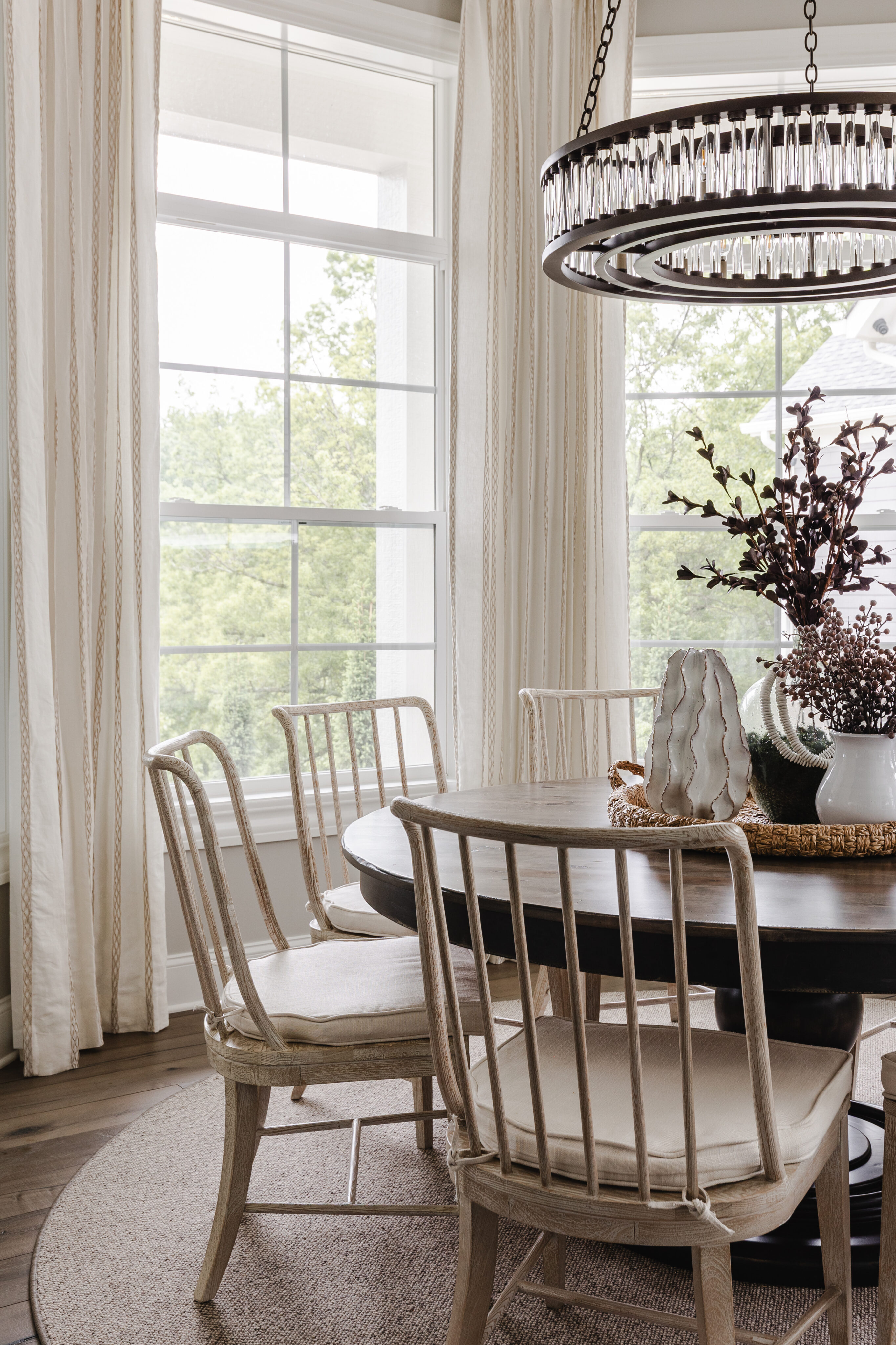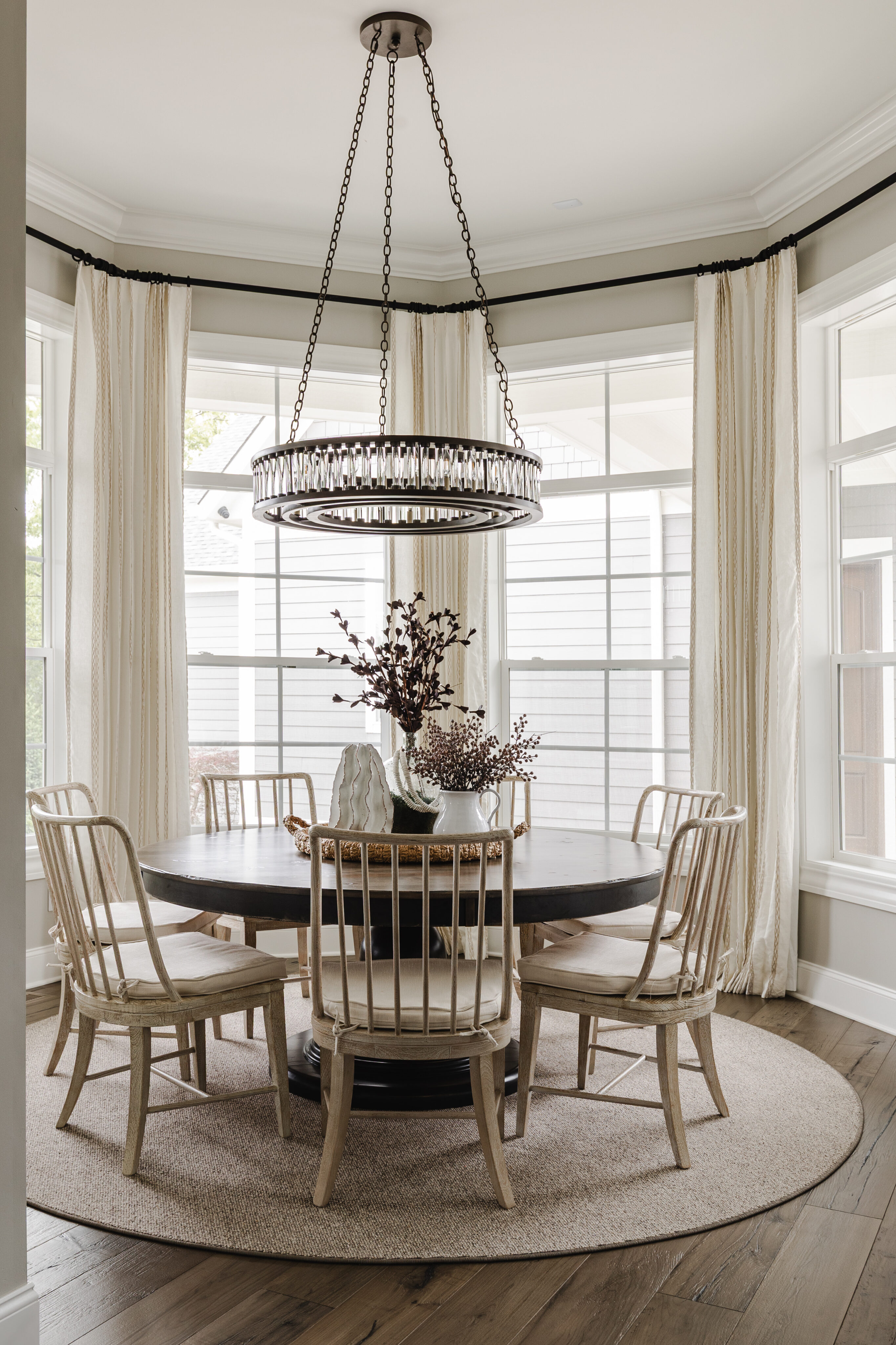 Surrounded by windows, this space feels warm and cozy. It features a Currey & Co. light fixture, a custom Canadel table, and Hooker chairs for comfortable everyday dining.