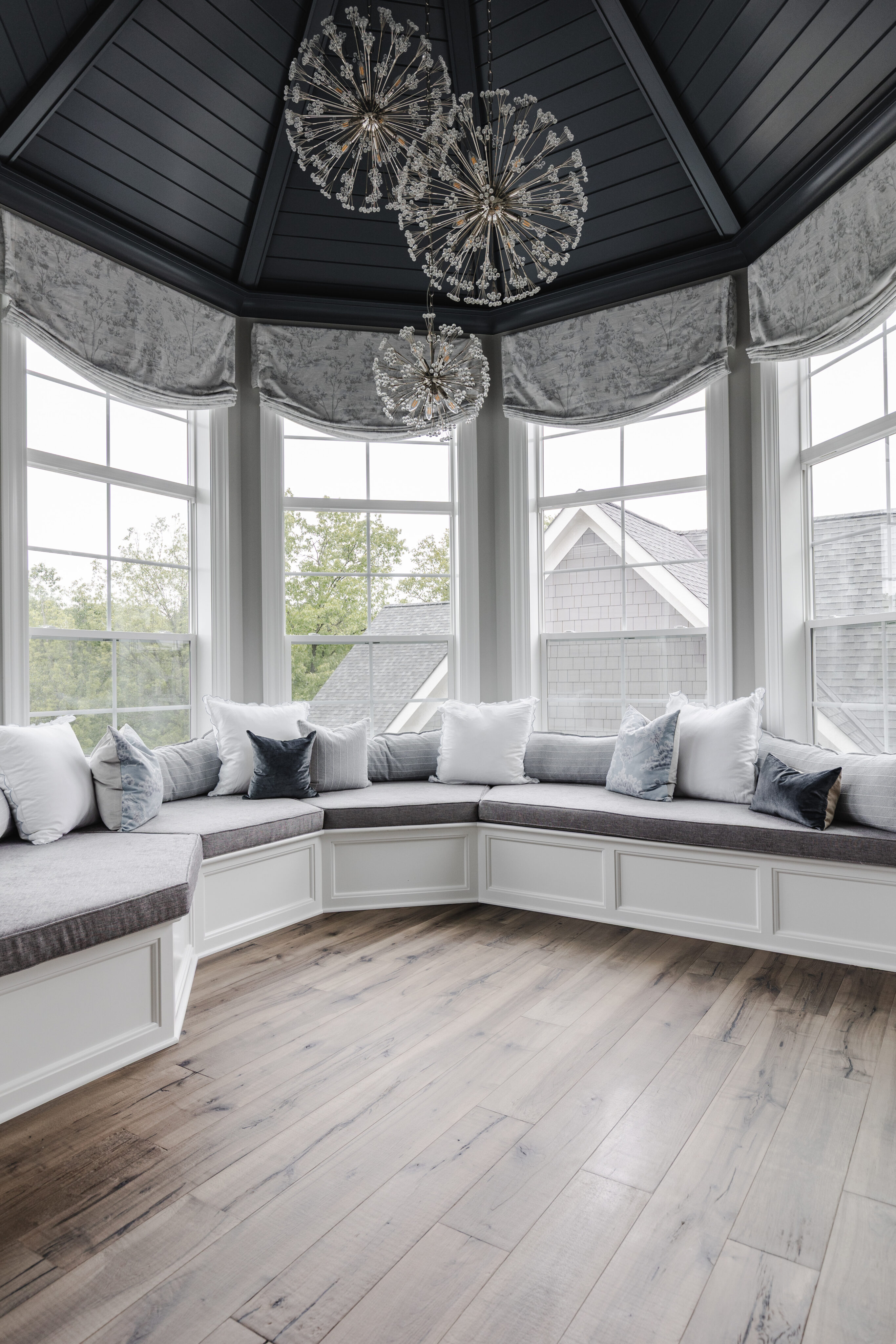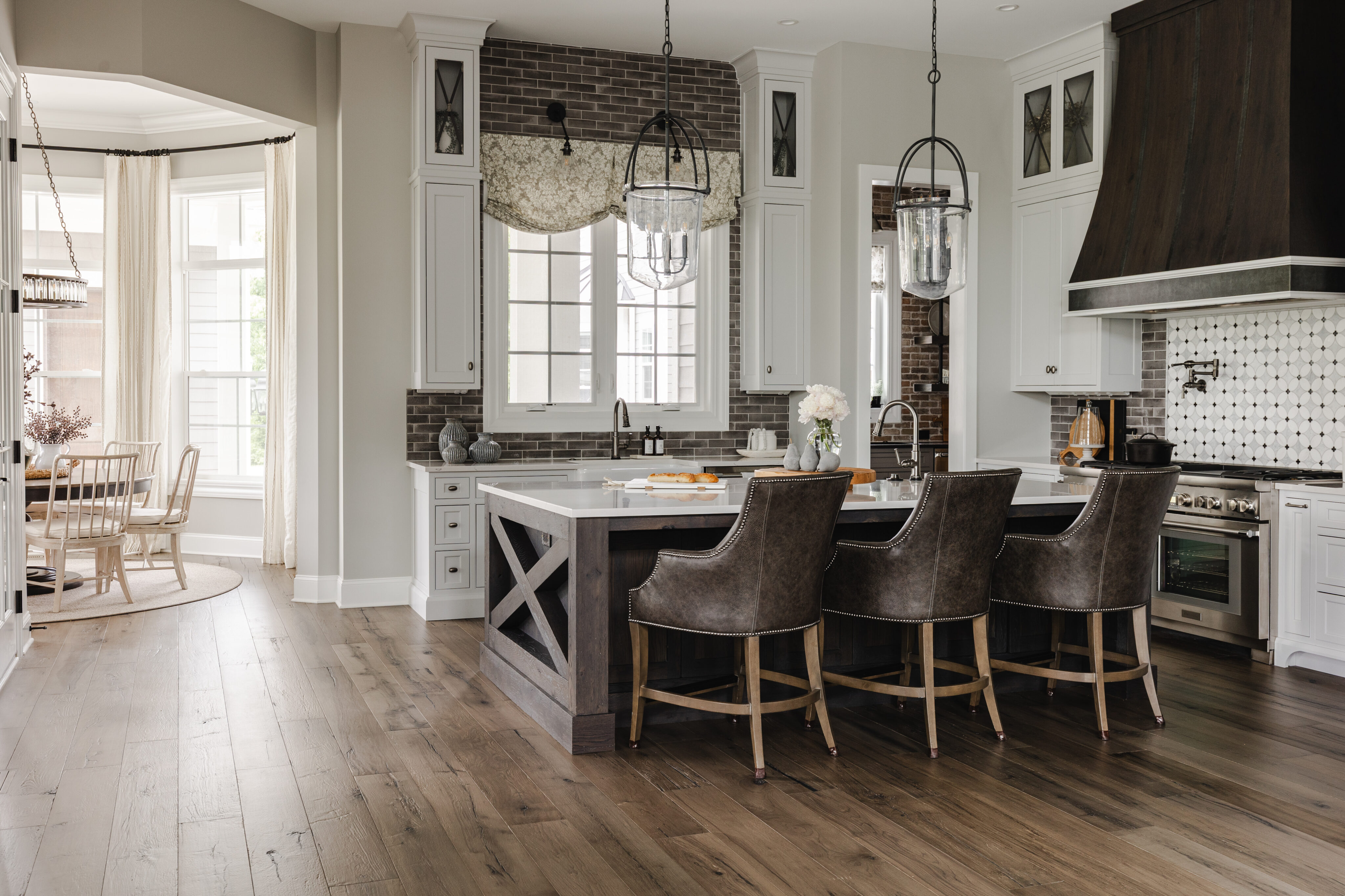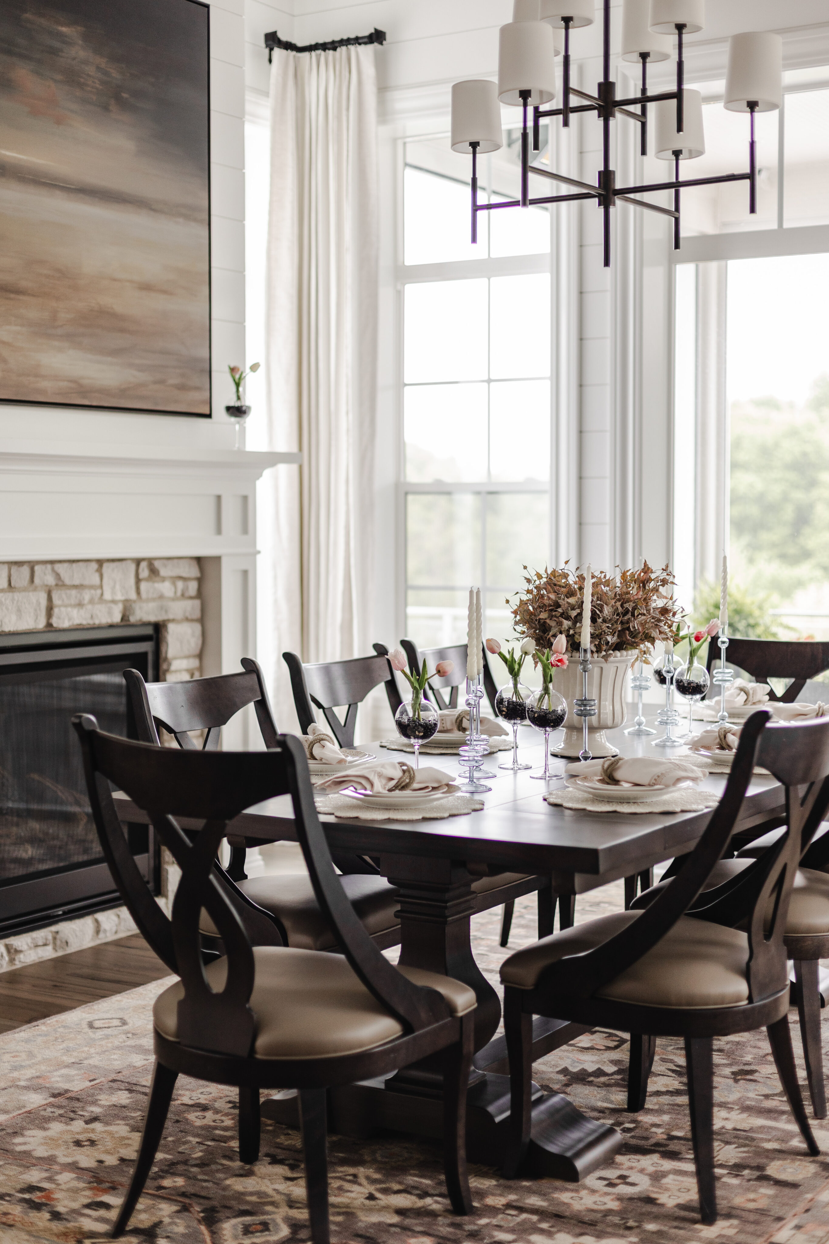 Surrounded by windows, this space feels warm and cozy. It features a Currey & Co. light fixture, a custom Canadel table, and Hooker chairs for comfortable everyday dining.