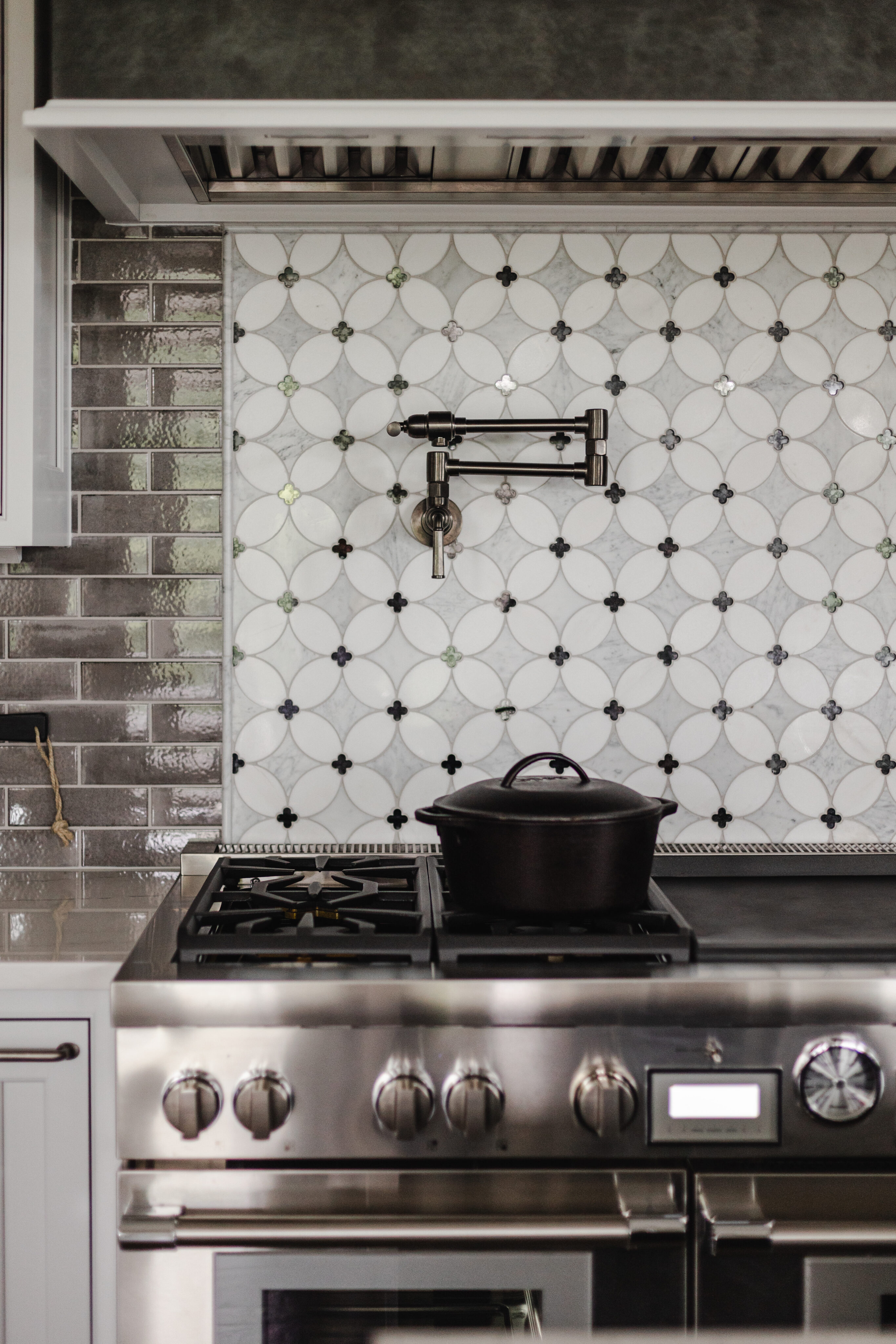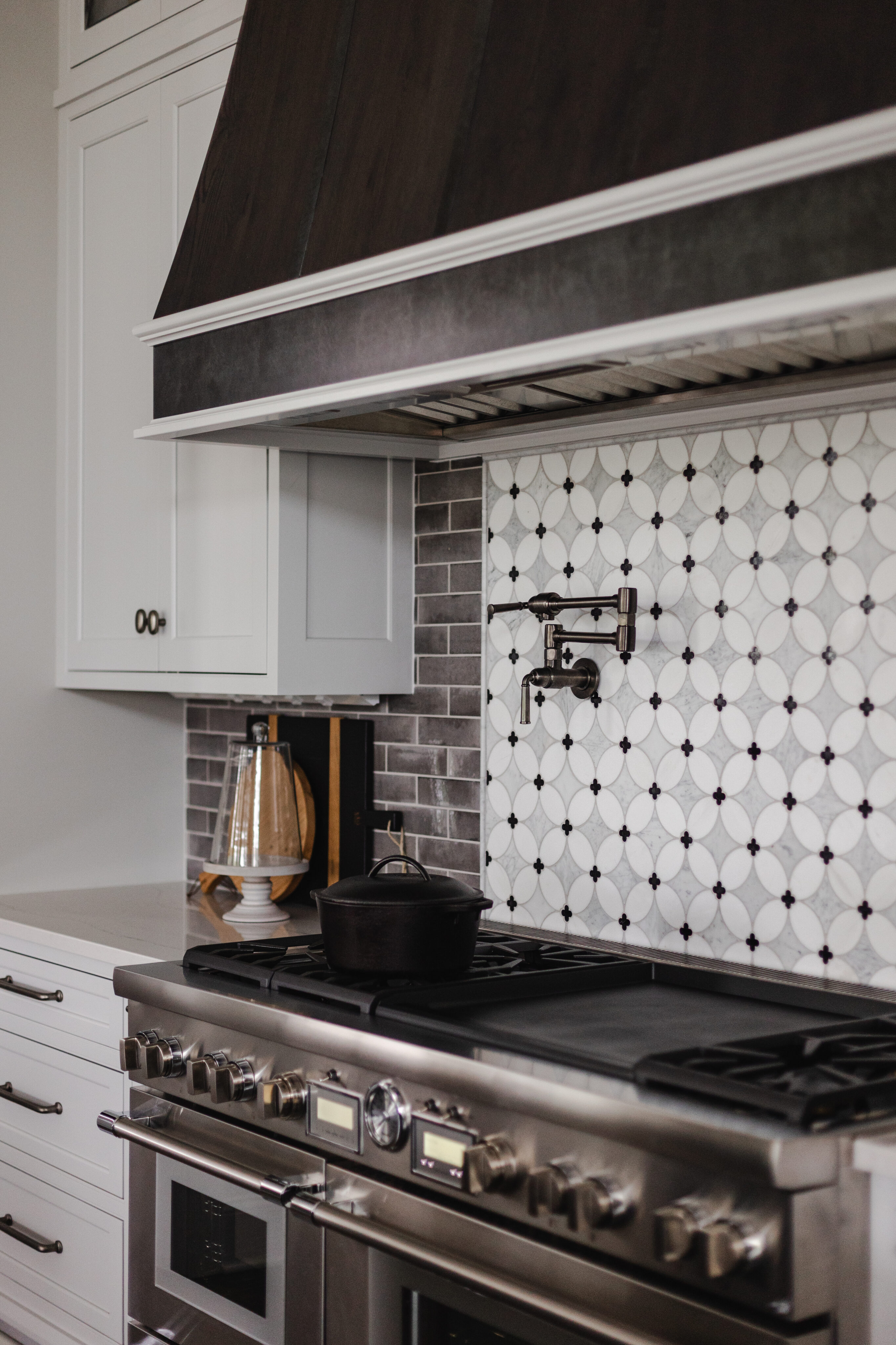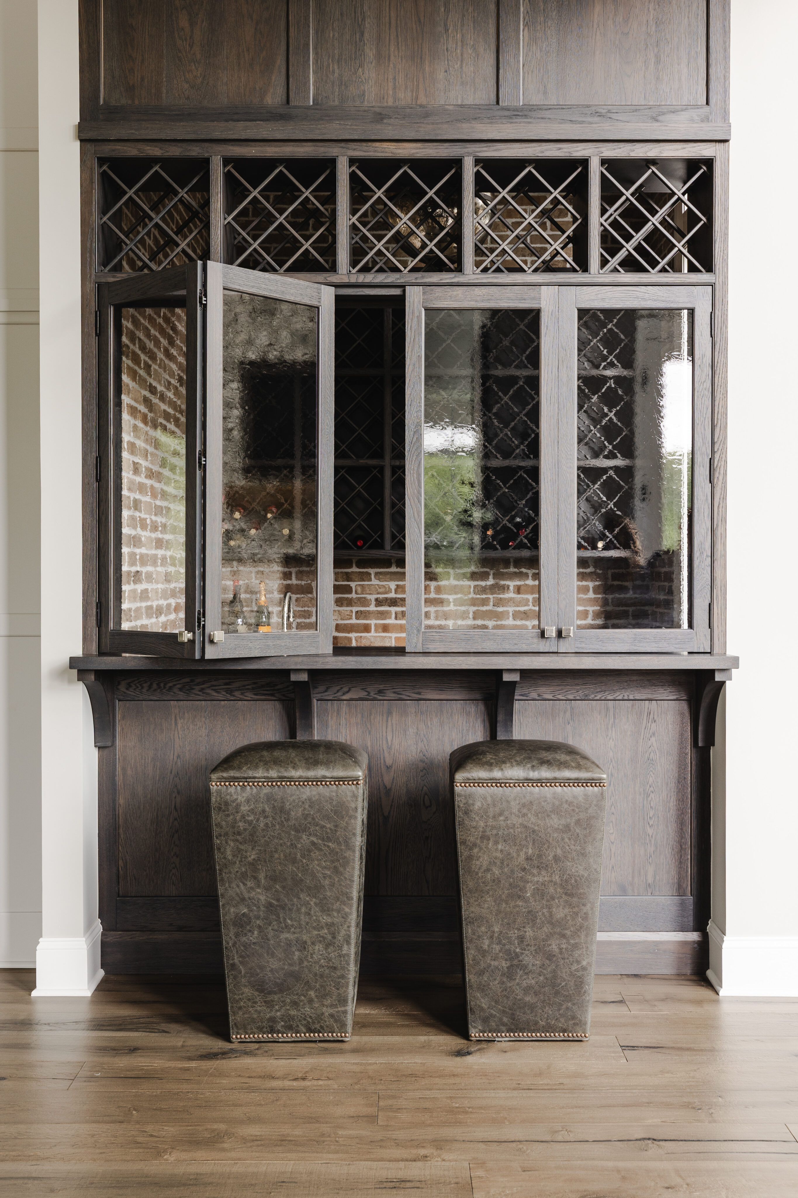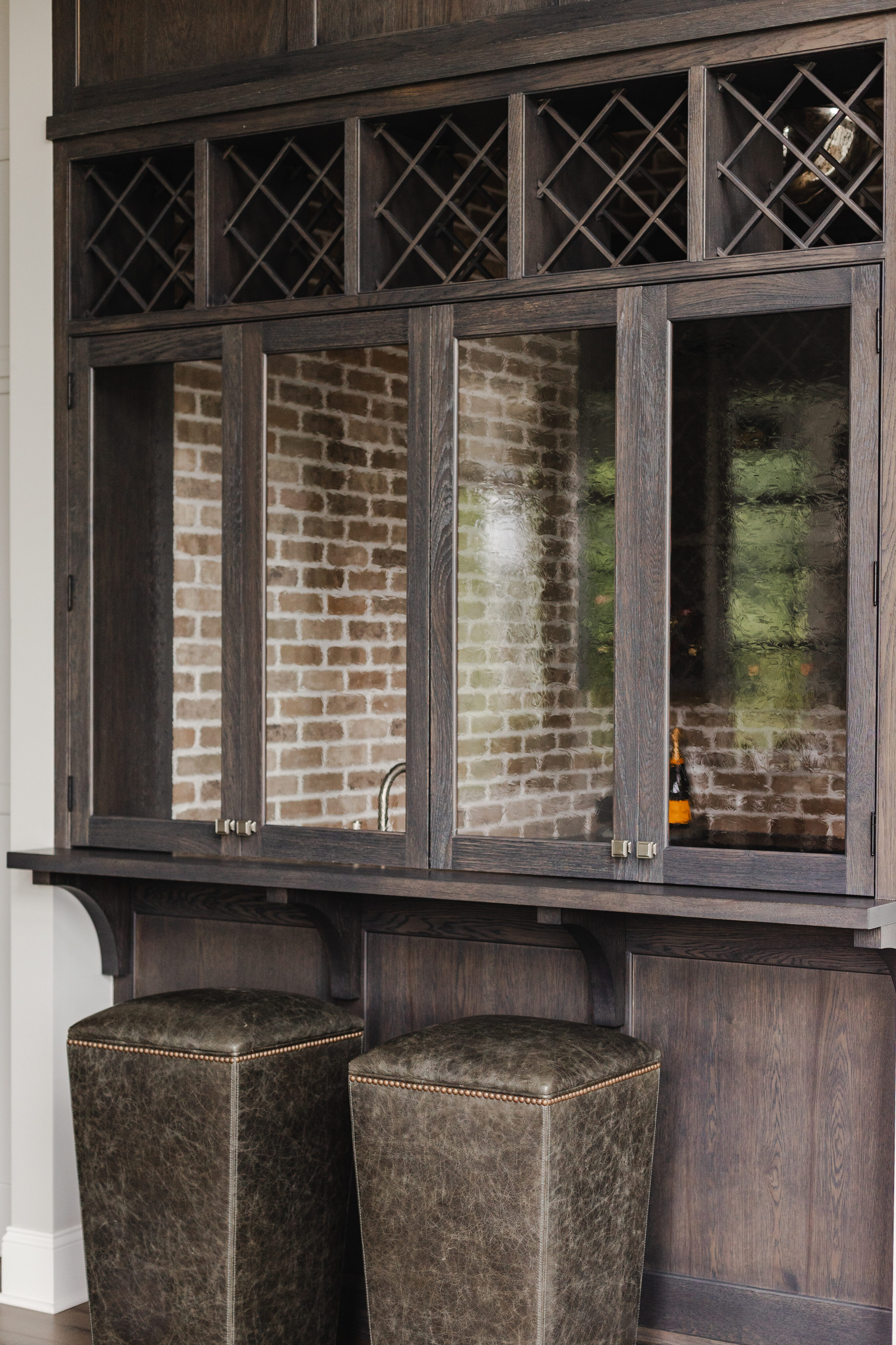 The client envisioned a large, open kitchen designed for family gathering. Custom cabinetry and a custom hood by Mullwood create a seamless look, while Sub-Zero appliances are fully integrated behind cabinet fronts. Carrara marble countertops add a timeless touch, and a wine bar just off the kitchen provides a fun, unique feature. Lighting throughout the space is by Visual Comfort.