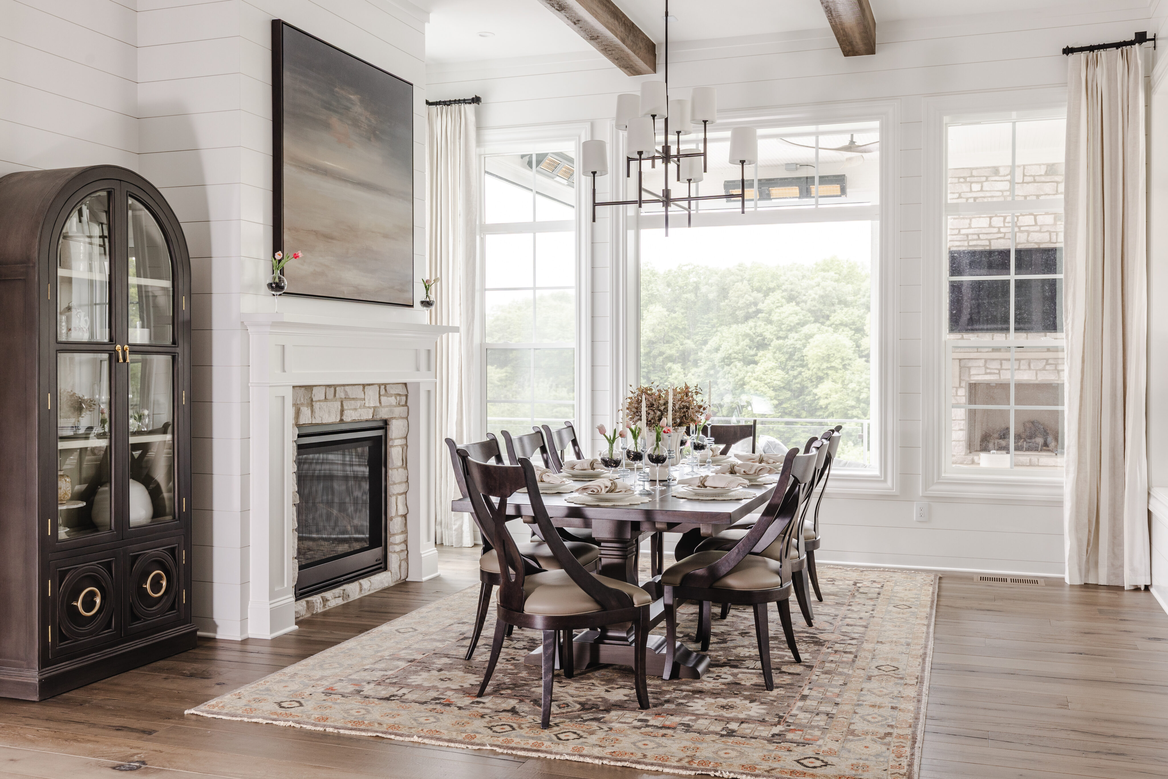 Anchored by a fireplace, this room was enhanced with ceiling beams to add architectural interest. Furnishings include a Visual Comfort light fixture, Surya rug, custom Bramble cabinet and table, and custom Canadel chairs.