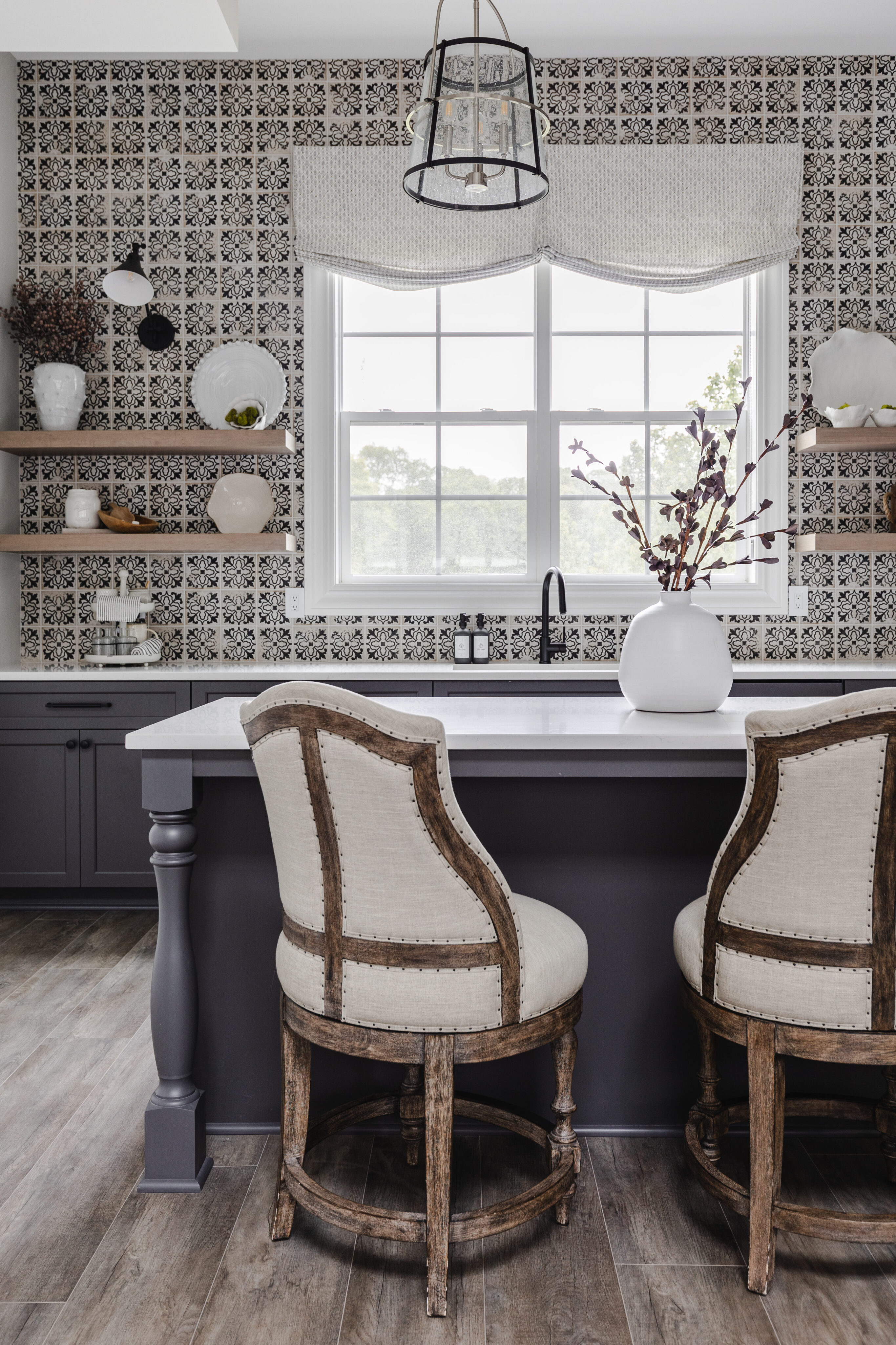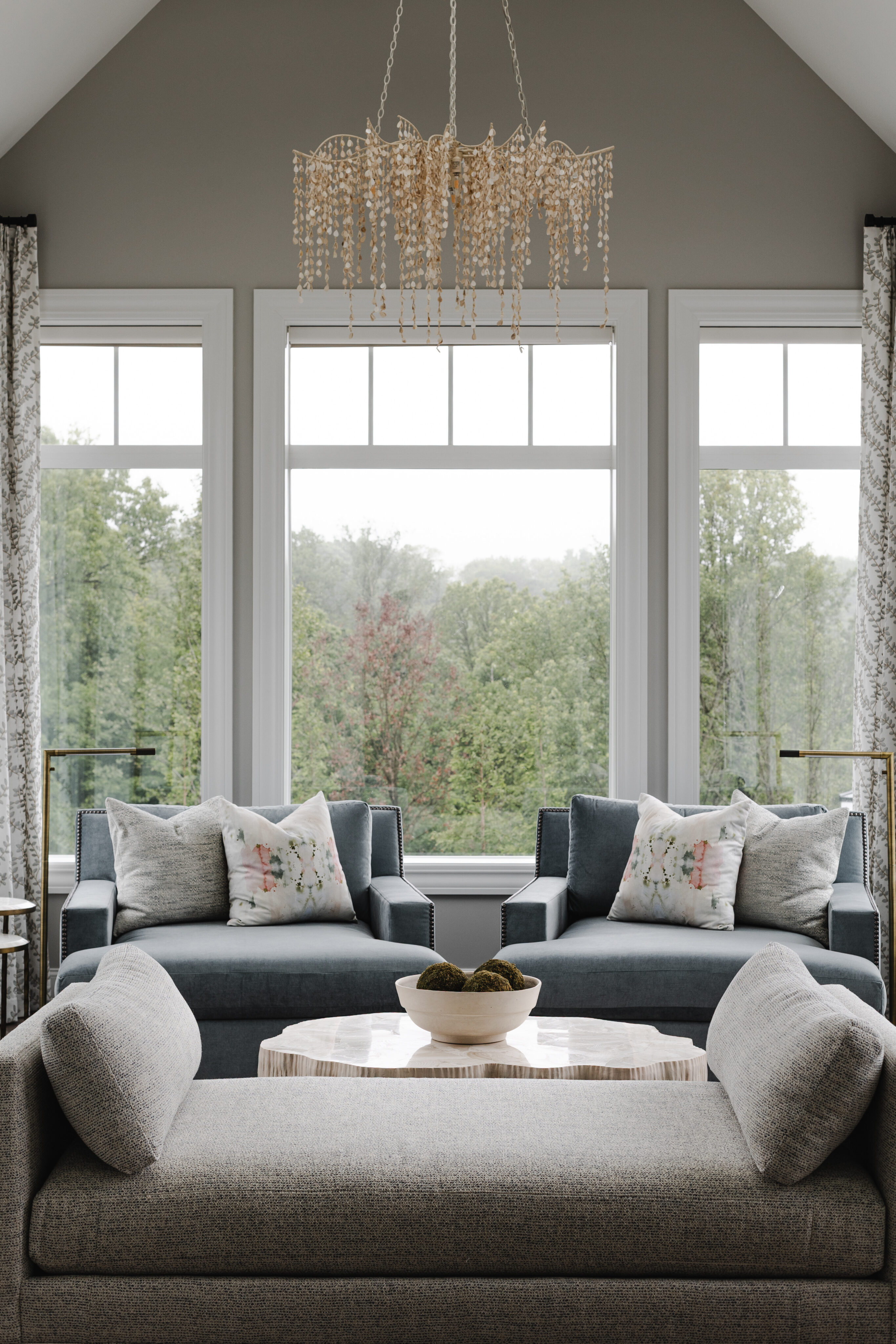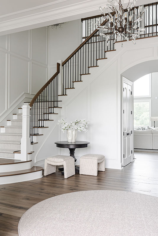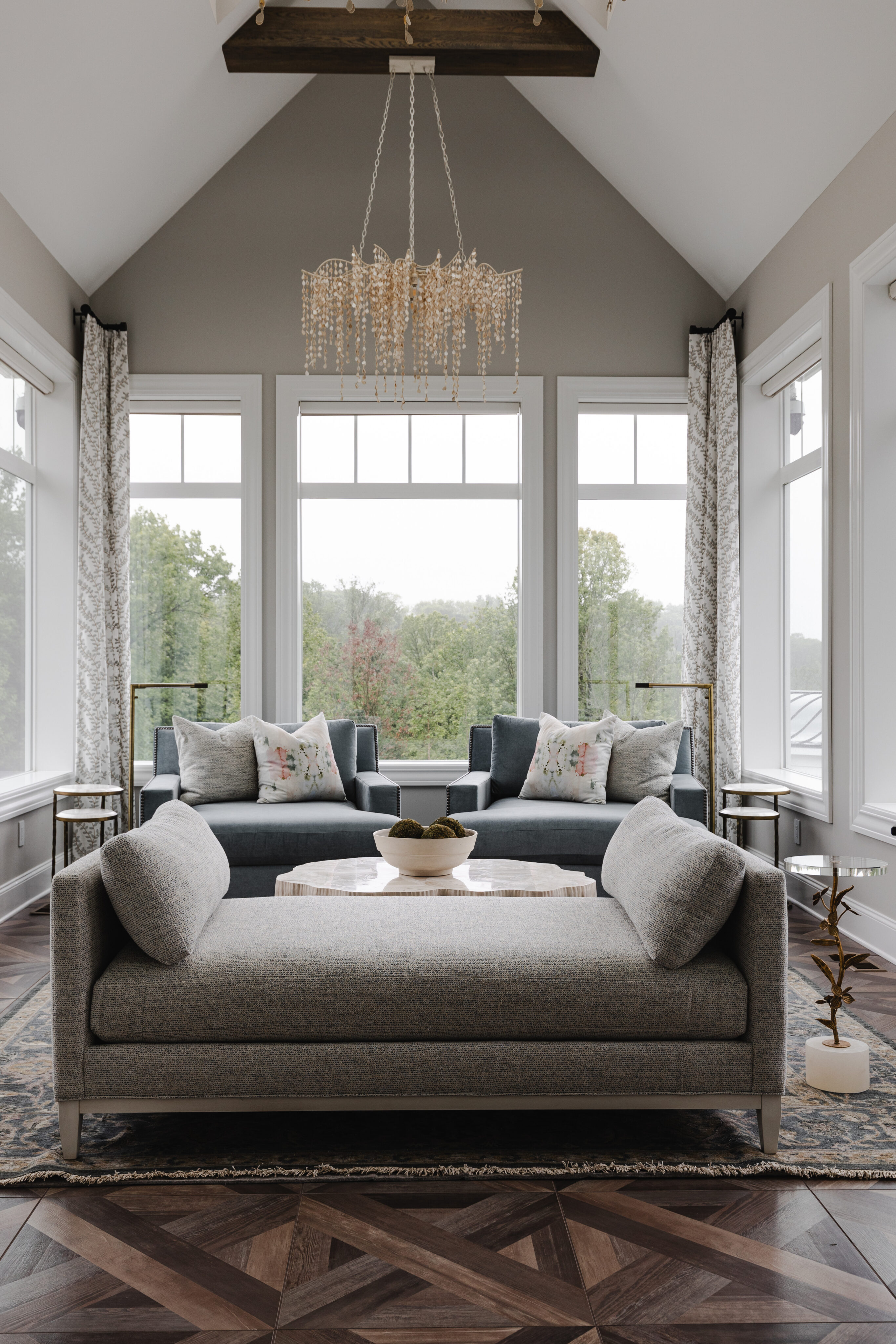 This family home blends warmth, comfort, and modern elegance across its expansive spaces. The clients envisioned a home that felt timeless—like it had been built years ago—but refreshed with modern finishes. From a custom kitchen with hidden appliances to cozy dining areas and a playful wine bar, every corner was designed for living and gathering. Emily designed a bright conservatory surrounded by windows, allowing the family to enjoy sweeping views of their beautiful property. As a household full of boys, Emily created a third-floor retreat with a feminine touch—a peaceful escape just for Mom. With a private guest suite, a stylish theater for movie nights, and thoughtfully layered outdoor spaces, the home feels both grand and inviting, perfectly reflecting the family’s personality at every turn.