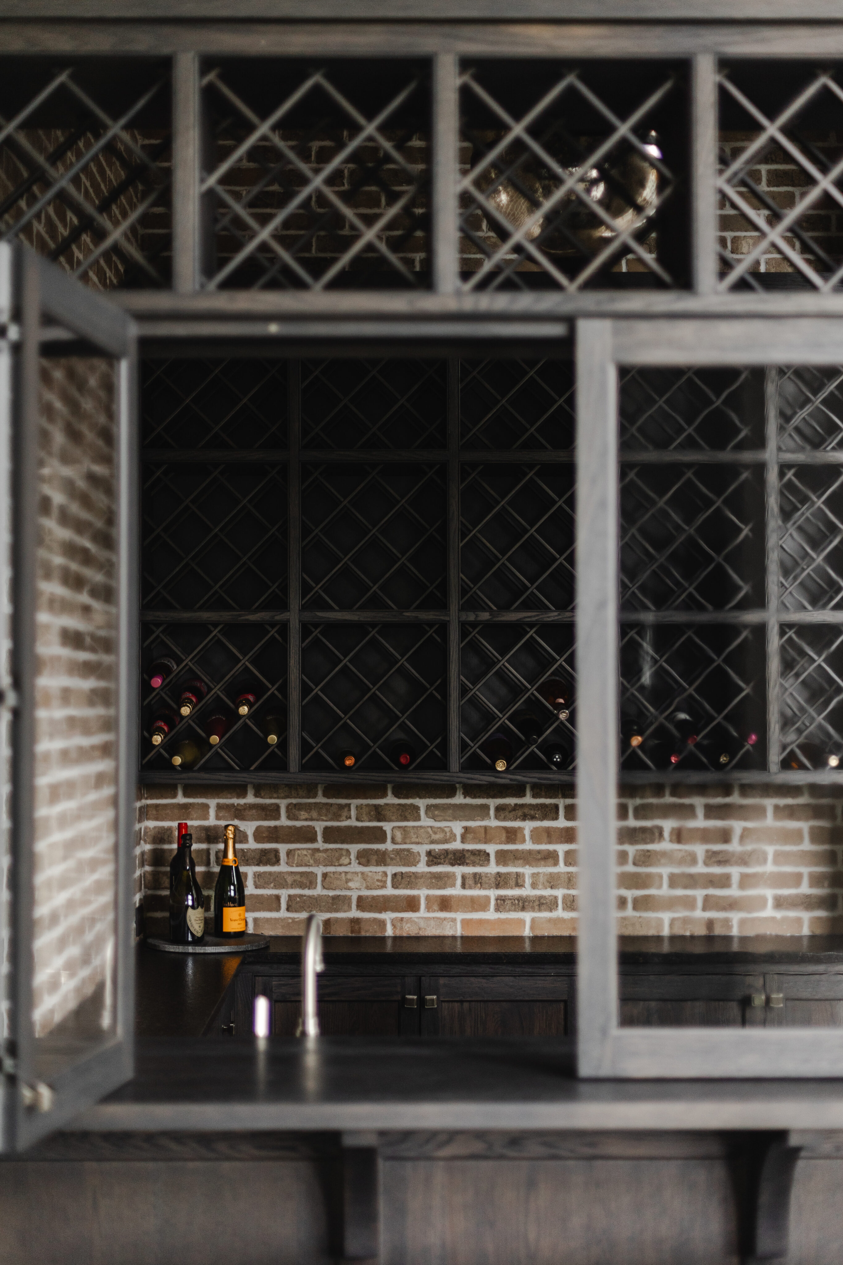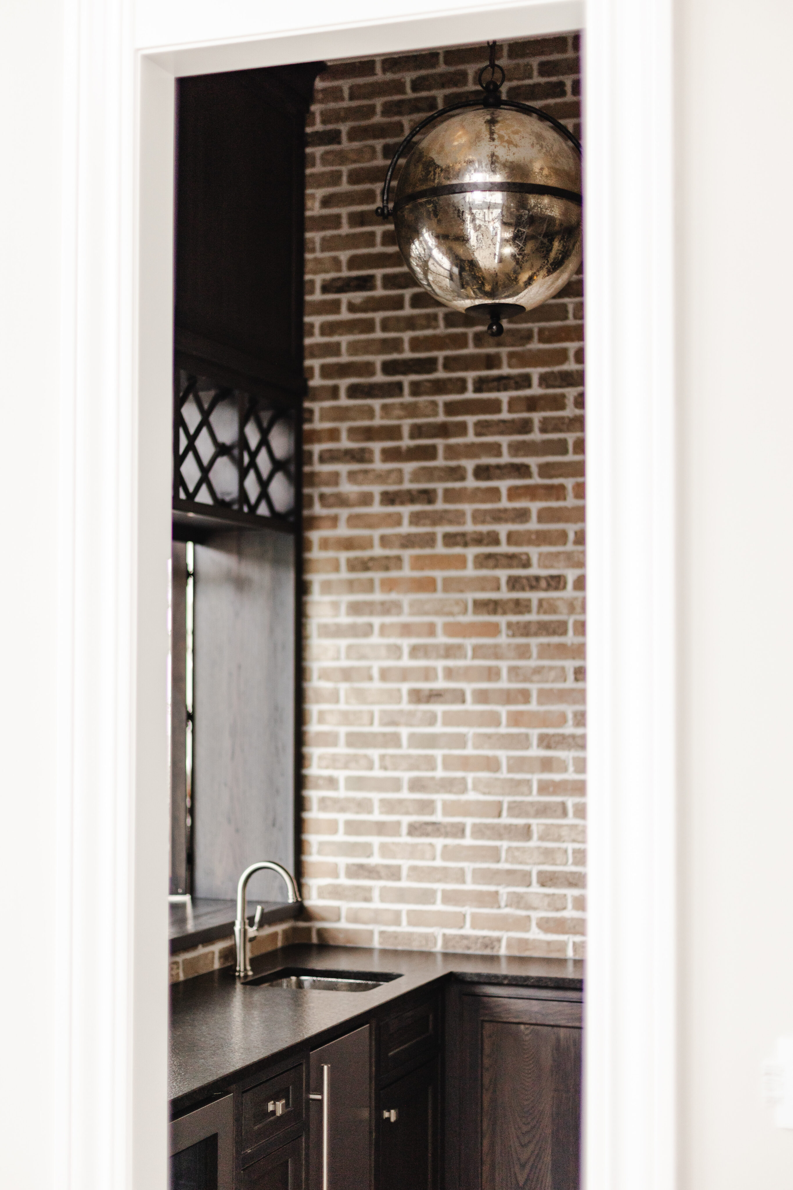 Lighting in the basement living area and over the bar is by Currey & Co., adding both function and style.