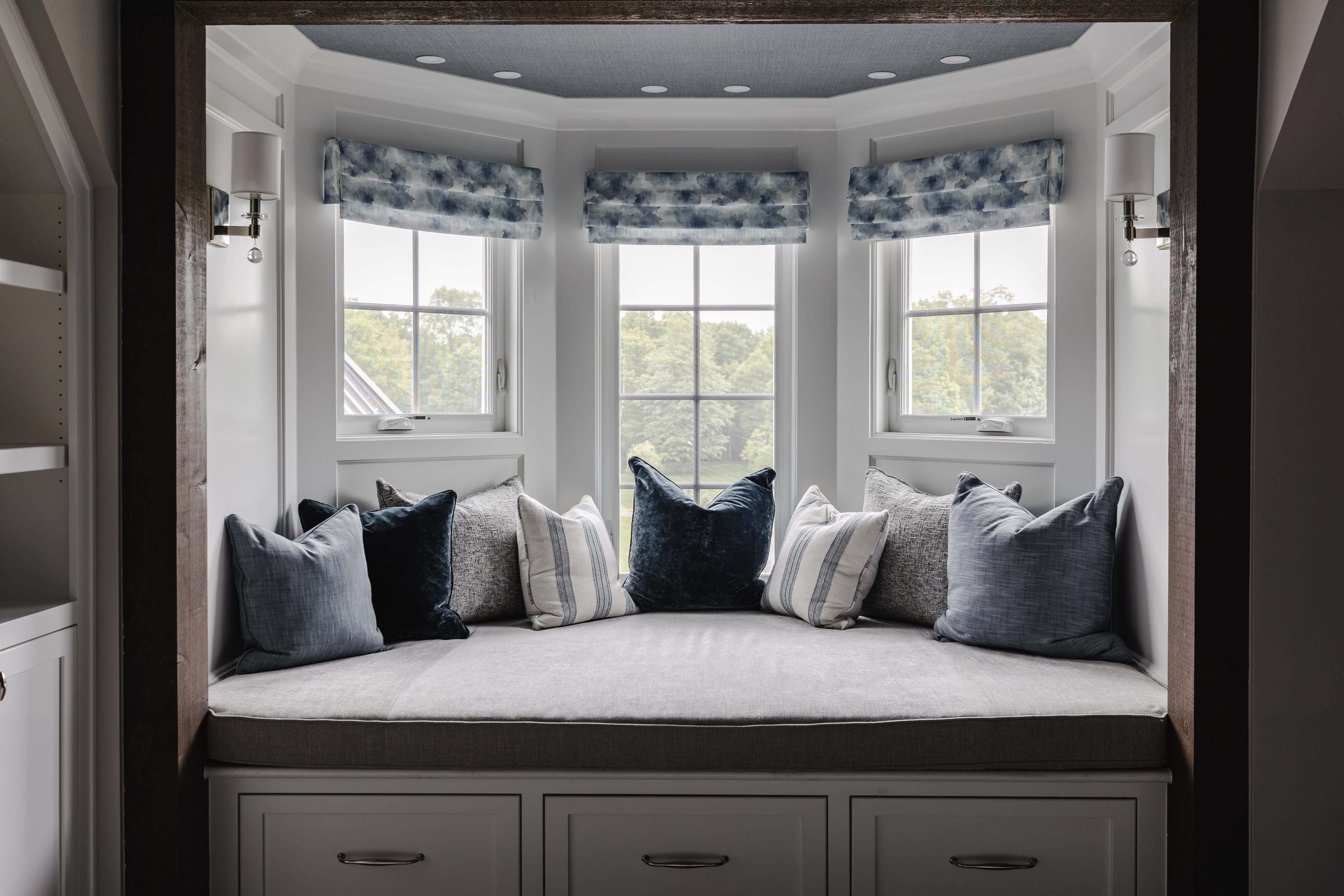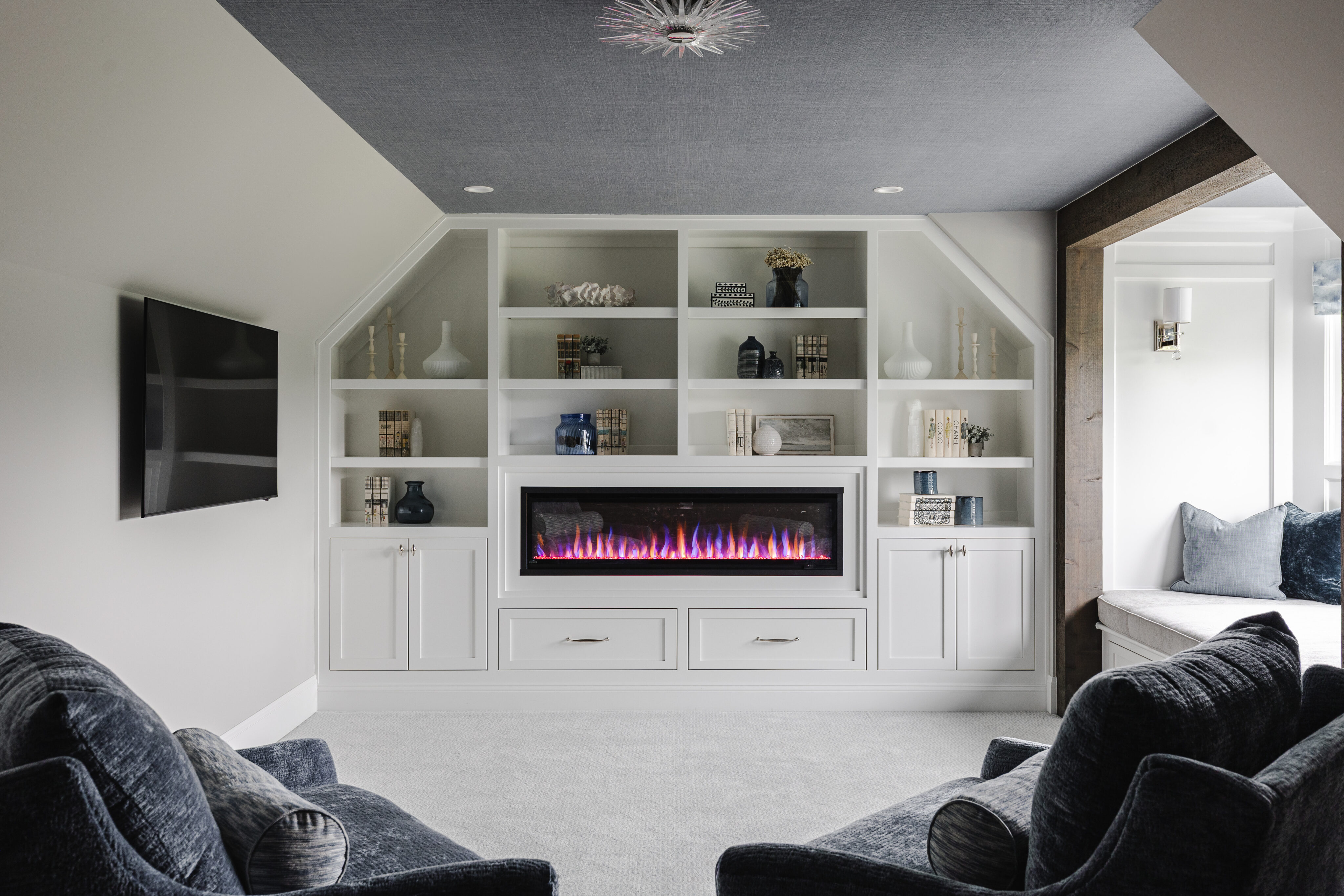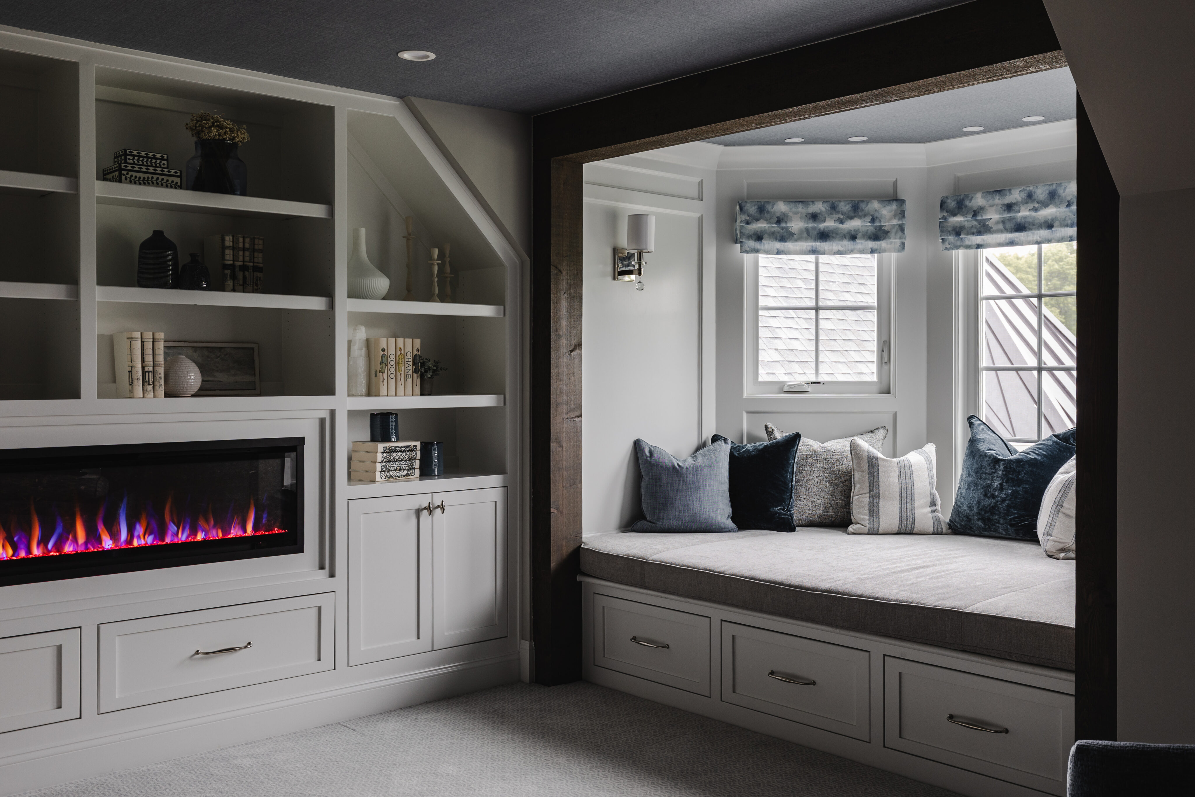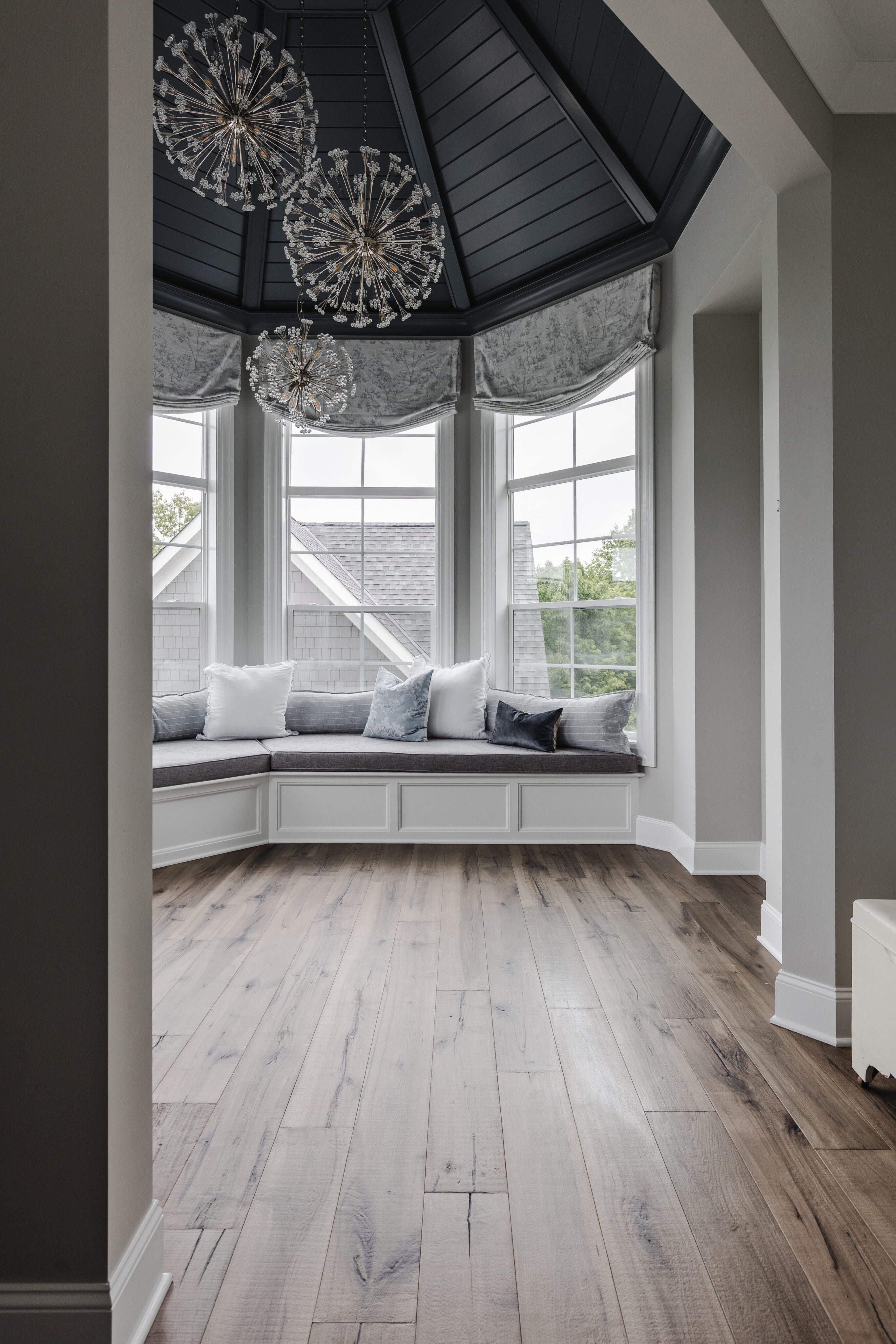A third-floor retreat was created specifically for the homeowner. In a house full of boys, this space has a more feminine feel—designed as a peaceful escape for mom.