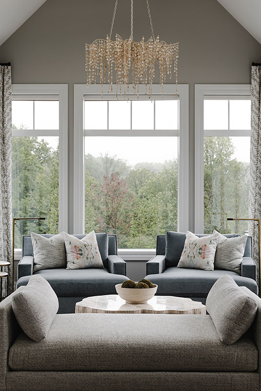 The client wanted the house to feel like an older home with updated modern finishes. The house has a lot of rooms so it still feels cozy. The Conservatory was a very fun room to design and decorate. It is surrounded by windows so the clients can take advantage of the views of their beautiful property.