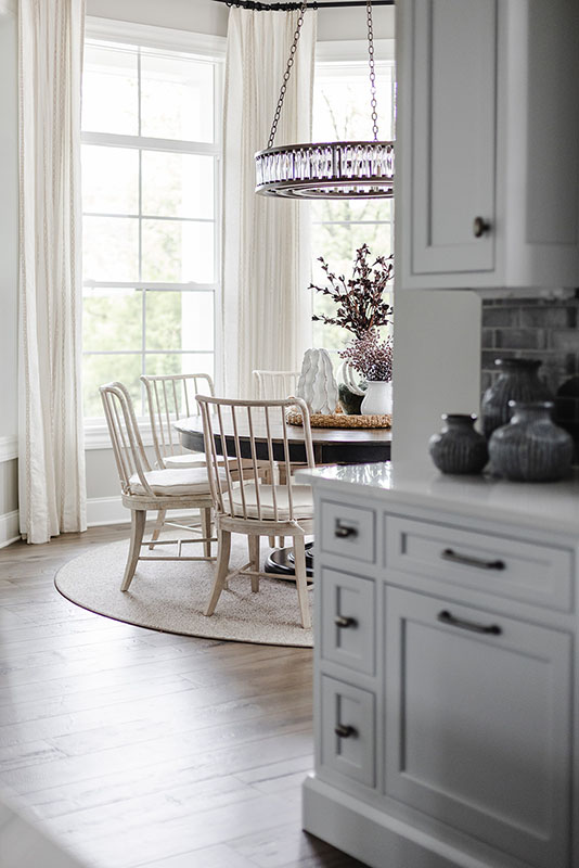 The informal dining room feels very cozy surrounded by windows. The light is Currey and Co, Custom Canadel table, Hooker chairs