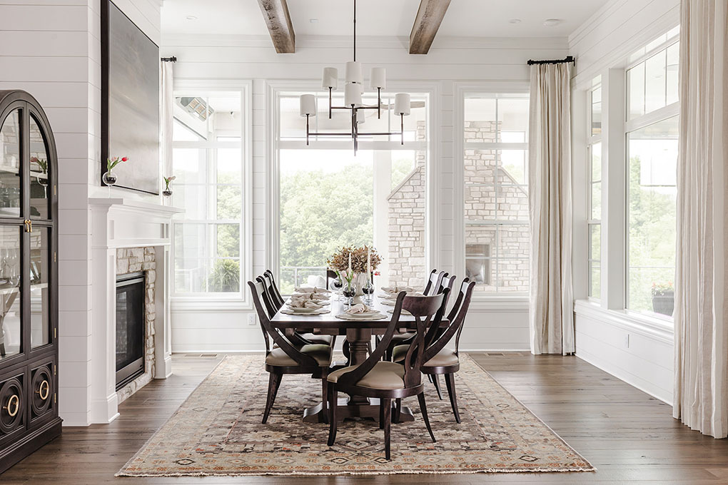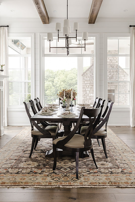 The formal dining room has a fireplace, we added beams to the ceiling. The light is Visual Comfort, Surya rug,Custom Bramble cabinet, Custom Bramble table and Custom Canadel chairs