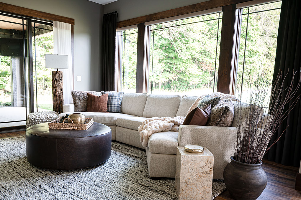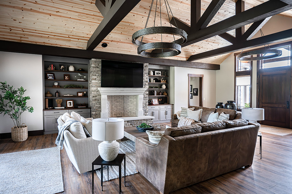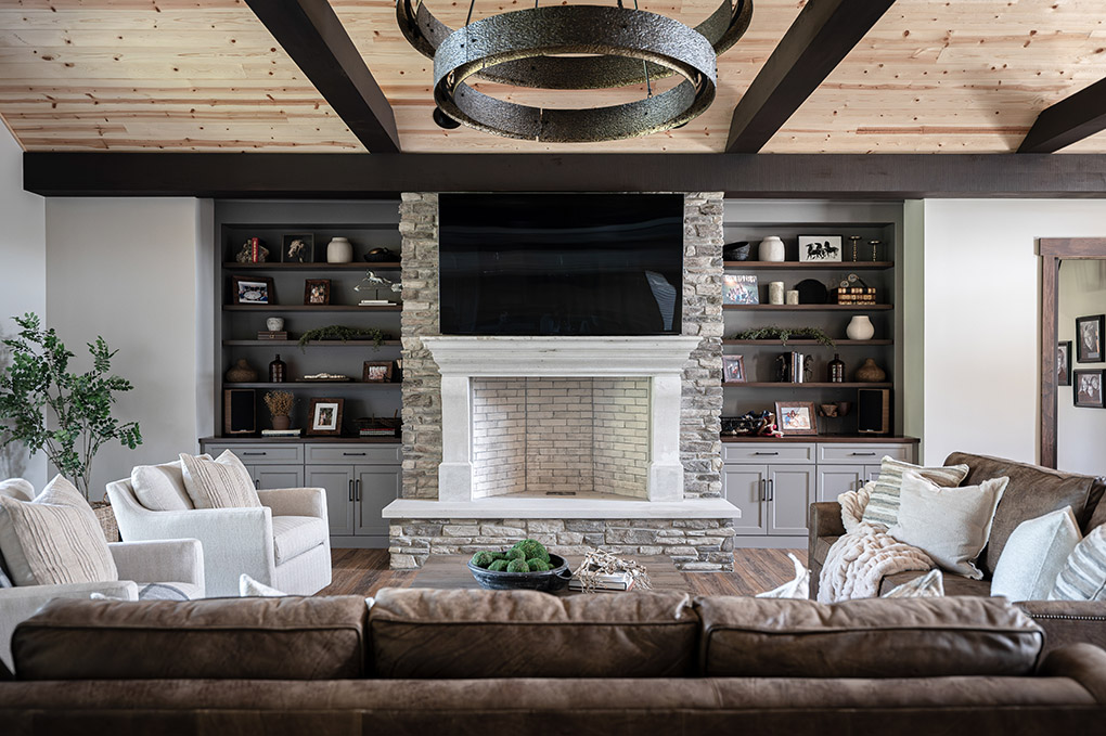 Rooted in warmth and refinement, The Elegant Lodge embodies a perfect balance of comfort and sophistication. Designed for an executive homeowner who loves to entertain, the residence captures the essence of a modern mountain retreat—cozy, textural, and effortlessly elevated. Vaulted ceilings, exposed beams, and a dramatic stone fireplace anchor the great room, while natural materials like rich wood, polished and leathered stone, buttery leather, and aged iron create a sense of rustic luxury throughout.